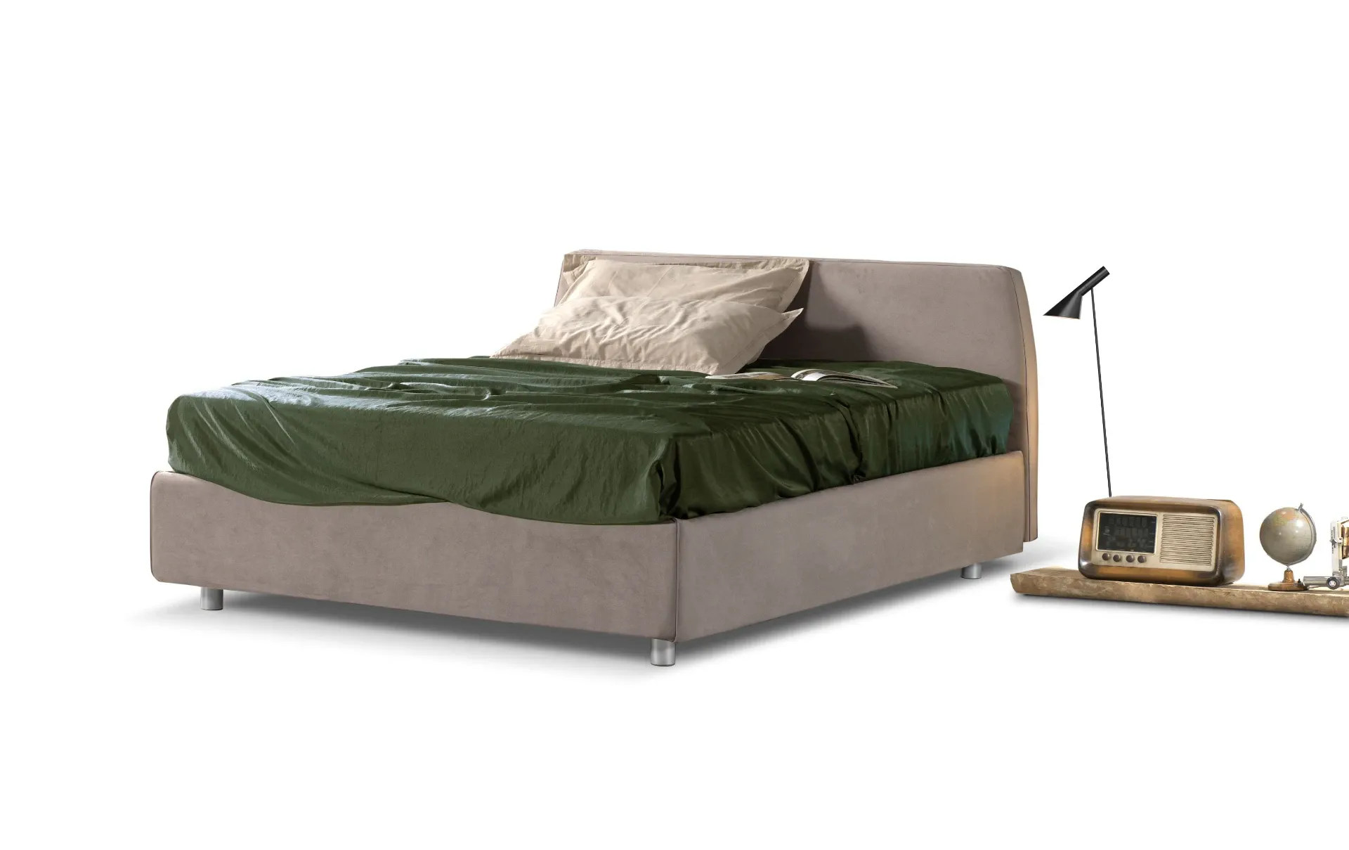 Letto matrimoniale imbottito completamente sfoderabile e con tessuto a scelta antimacchia, giroletto alto H28 cm con contenitore ad alzata normale, piedi in PVC nero h.8 cm di serie.