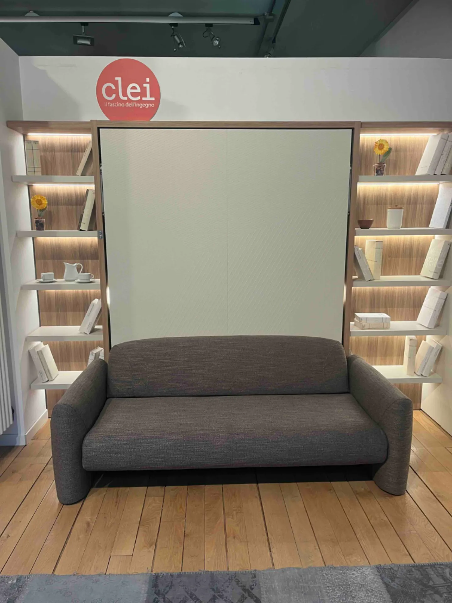 Il modello, realizzato nelle profondità mm 350 (con testata tessile) e mm 623 (con testata letto in legno, contenitore porta guanciali e mensole), ha un meccanismo di articolazione con molle a gas ammortizzate, incassate nel fianco del mobile mediante tecnologia brevettata.