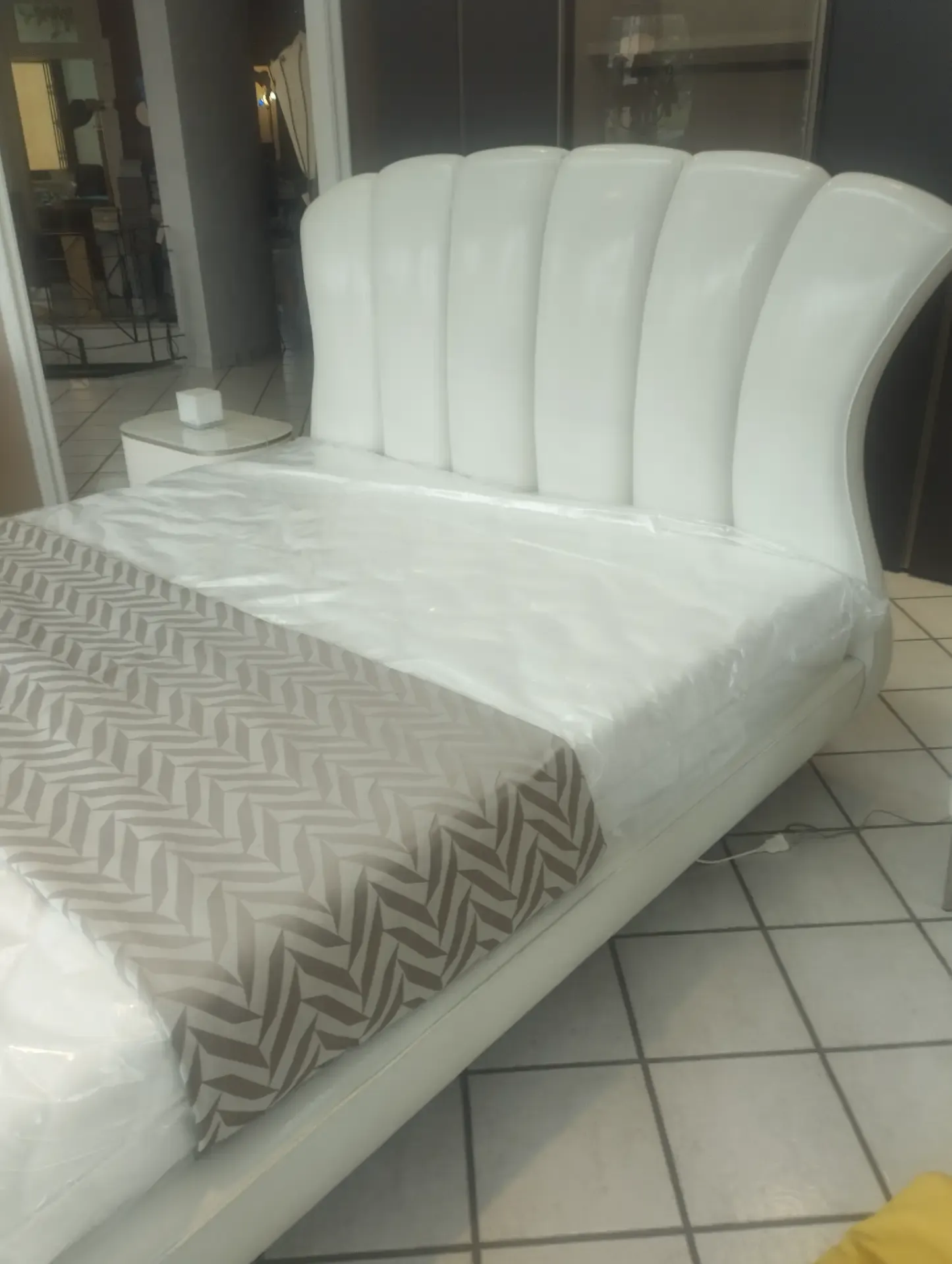 Struttura letto in massello di pioppo.Testata e giroletto imbottiti in gomma a densità differenziata e rivestito in pelle