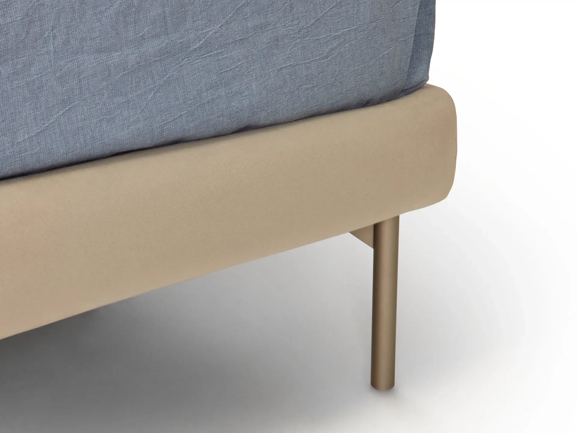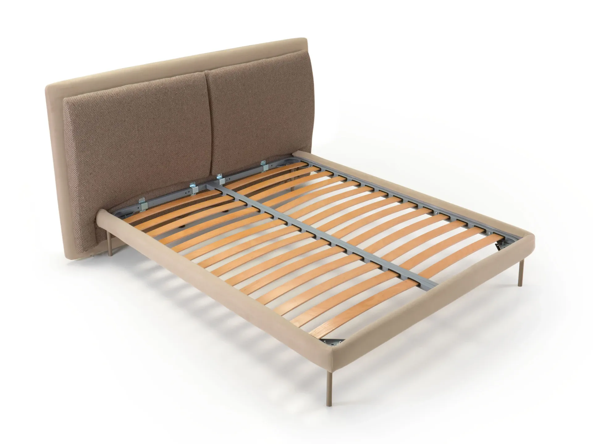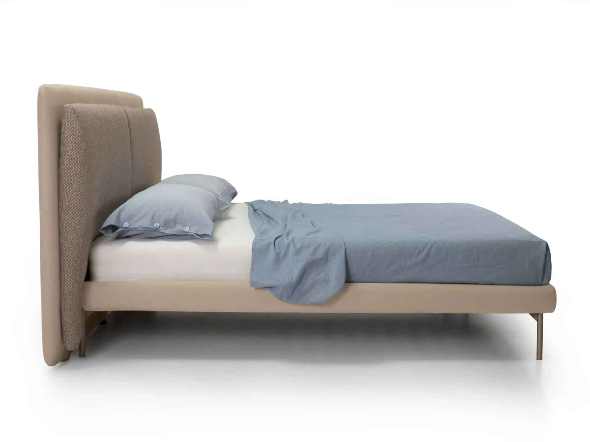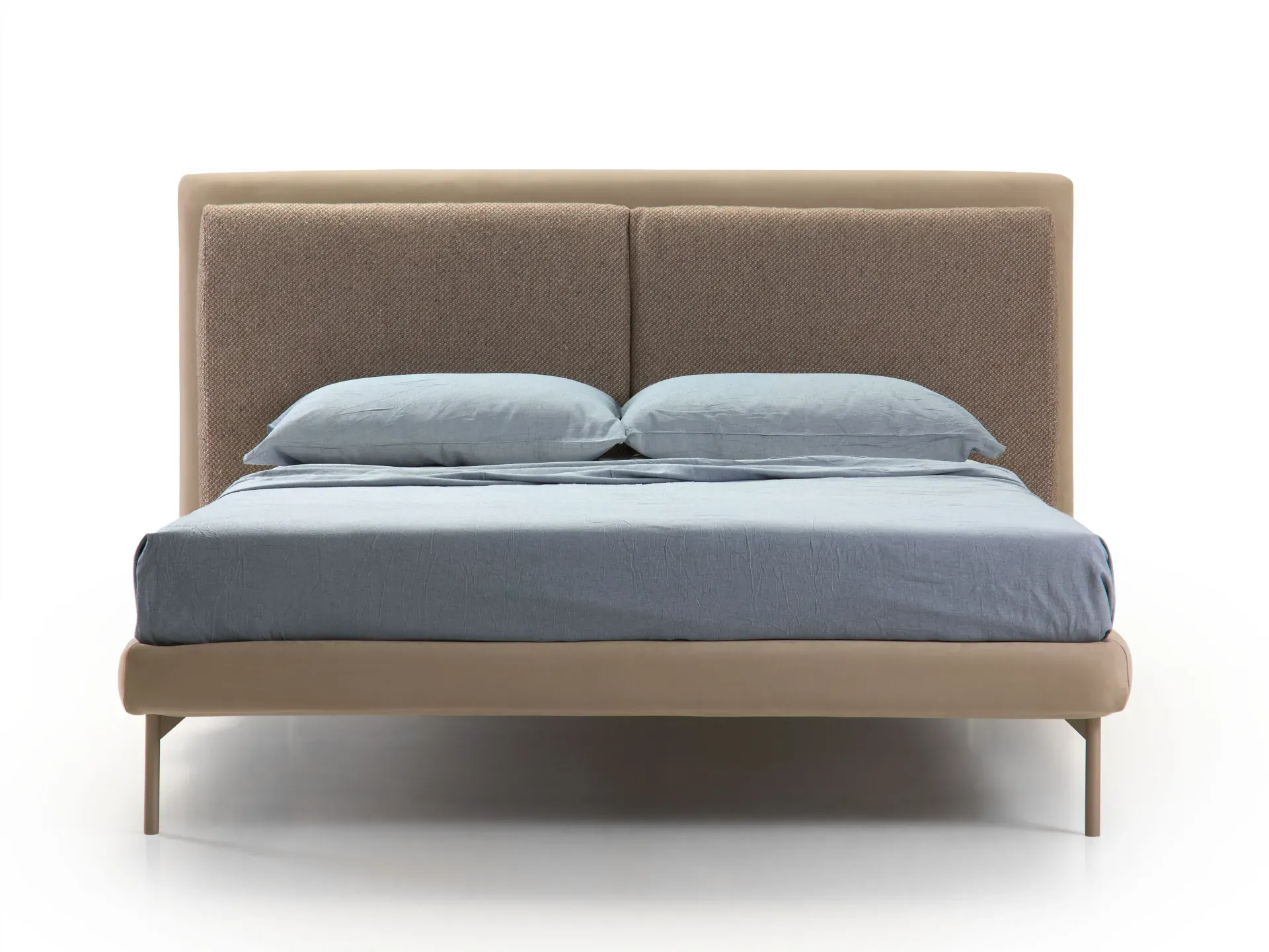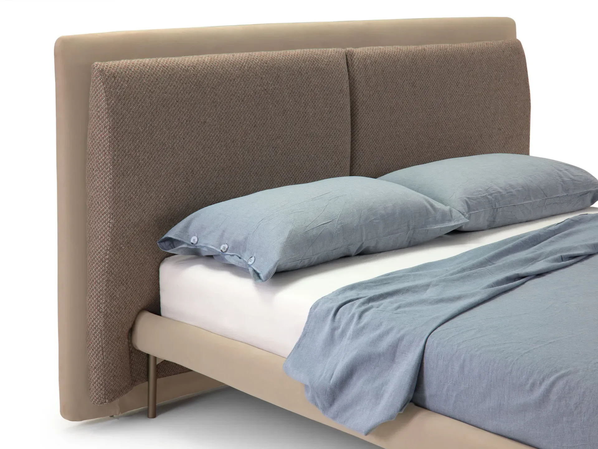 Taylor Outlet è un letto matrimoniale imbottito, caratterizzato da una testiera ampia e alta, composta da un pannello posteriore e da due morbidi cuscini applicati frontalmente. Presentato nella variante con giroletto Slim h.10, è completato da piedini alti che conferiscono al design un aspetto leggero ed essenziale.