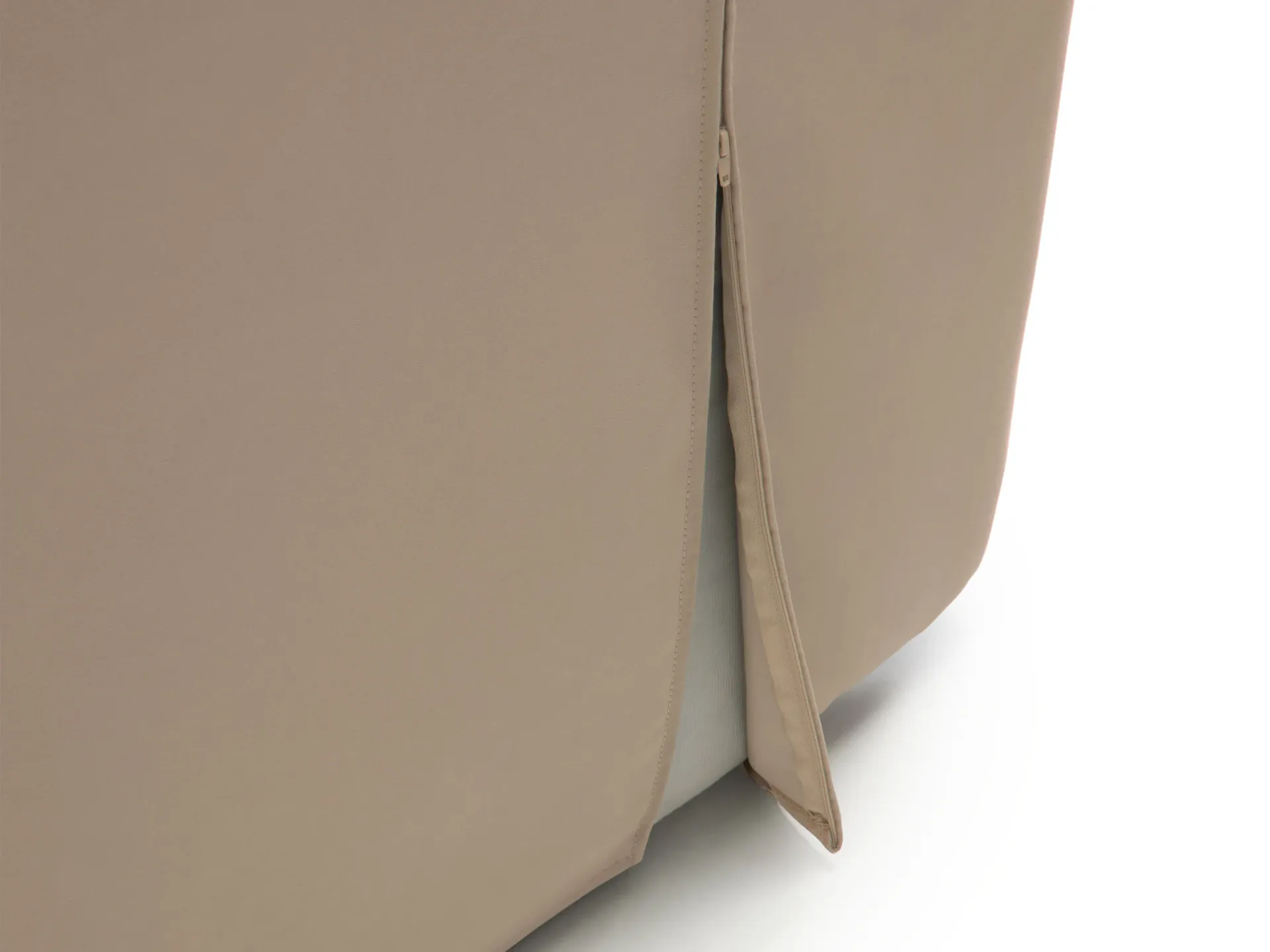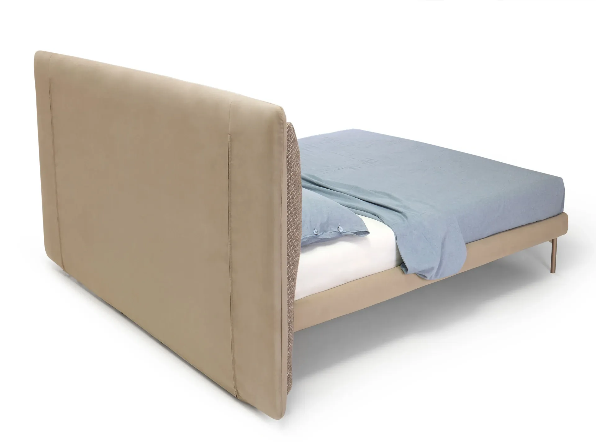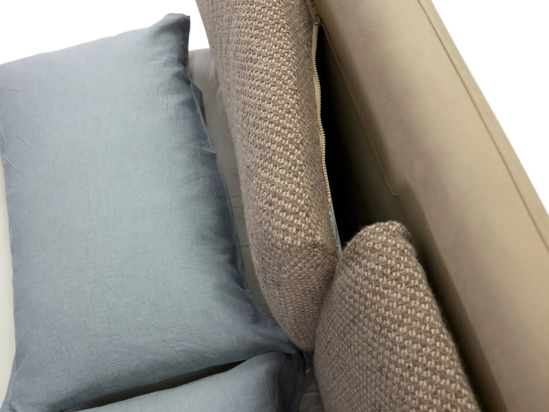 Il rivestimento, completamente sfoderabile, è proposto in versione bicolore: il pannello posteriore è realizzato in un raffinato tessuto effetto Alcantara con mano scrivente mentre i cuscini sono rivestiti in un tessuto misto lana dalla trama grossa.