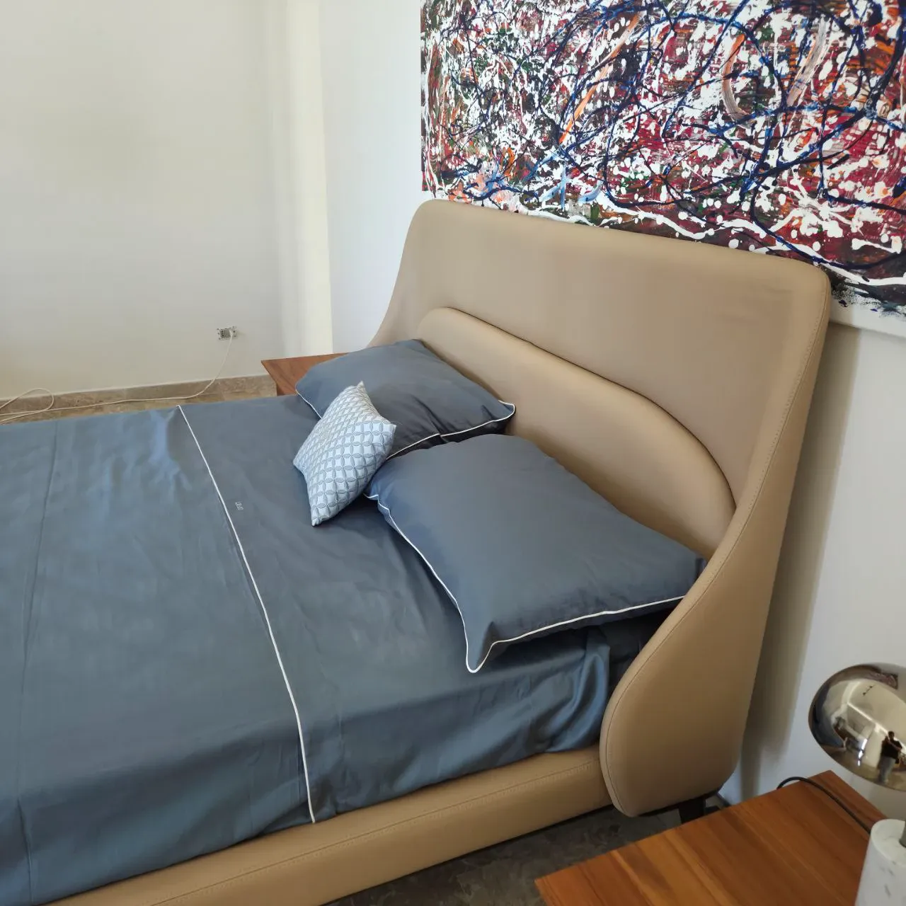 Il Letto Ermes è progettato per accogliere materassi matrimoniali standard grazie alla sua rete da 160 × 200 cm. La struttura del letto, caratterizzata da linee sobrie ed eleganti, si integra armoniosamente in qualsiasi contesto d'arredo, offrendo un equilibrio perfetto tra estetica e funzionalità.