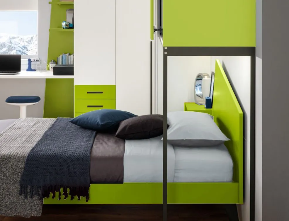 Progettato per valorizzare la cameretta di ogni ragazzo il letto moderno presenta un sottile giroletto ed alti piedini in legno. Le linee sobrie ed essenziali del letto ad una piazza e mezza vengono valorizzate dal design della testata: la forma squadrata le conferisce infatti uno stile ben definito, capace di assicurare ad ogni camera da letto la giusta personalità. L'accesa finitura laccata ad acqua in Verde cedro conferisce al letto 1 piazza e mezza uno stile sobrio ma di grande impatto visivo, capace di catturare l'attenzione per diventare il protagonista della cameretta. Le finiture laccate ad acqua possono essere personalizzate, sia per testata che per giroletto.
