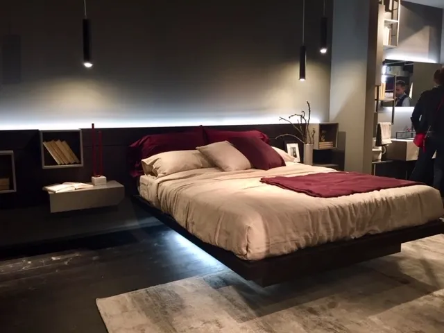 Il suo progetto contenitore brevettato lo rende inimitabile. Include comodini sospesi integrati, cubotto a giorno, vaschetta portaoggetti e un impianto di illuminazione originale per testata e sotto contenitore.