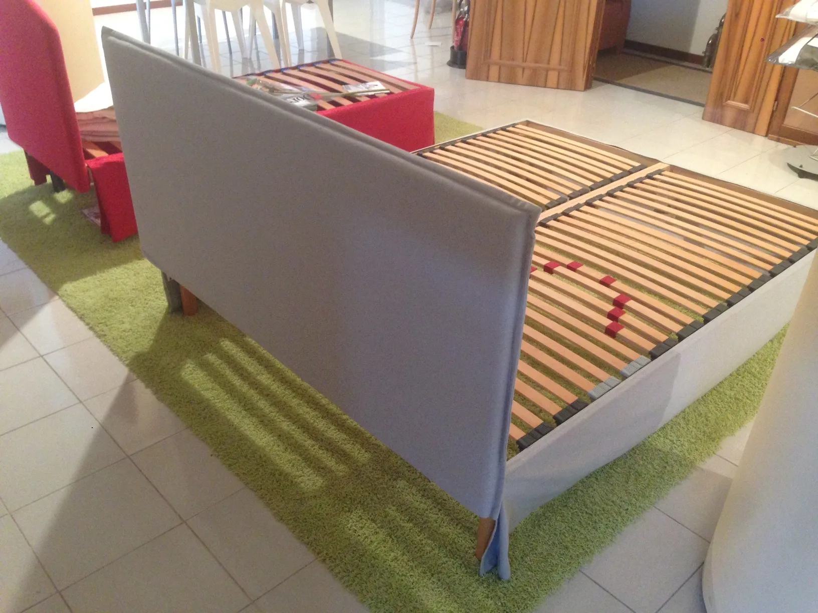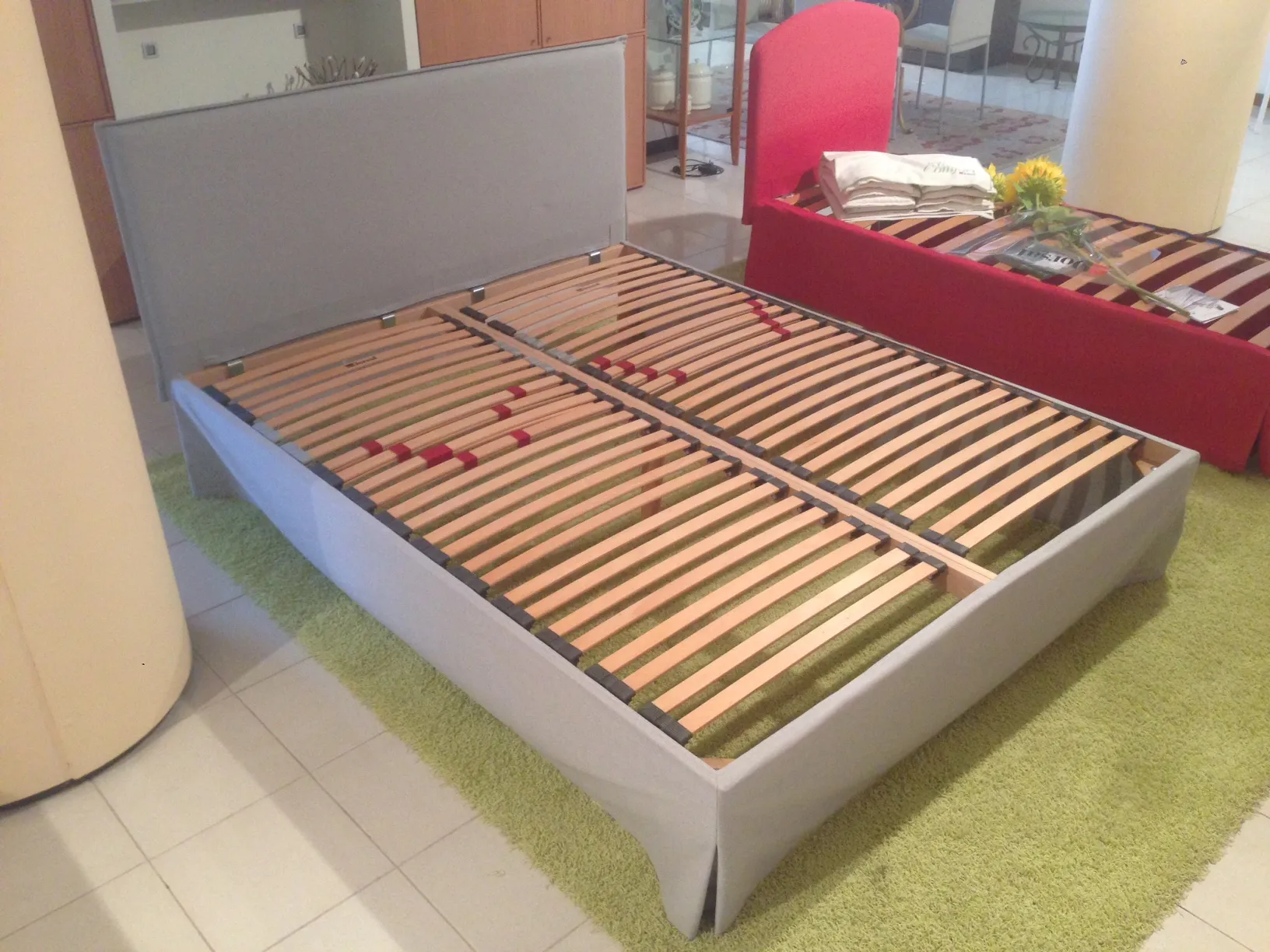 Il letto SEMPLICITY con rete Super di DORSAL è caratterizzato da un aspetto lineare e da misure estremamante compatte, adatte a camere particolamente compatte. Il rivestimento è completamente sfoderabile ed è realizzato in tessuto di cotone. I piedi sono montati direttamente sulla rete e garantiscono una estrema stabilità del letto nella sua completezza. Le dimensioni del letto sono: larghezza cm 164, profondità cm 206, altezza cm 100 (piano rete cm 35). Le dimensioni della rete a doghe regolabili COMPRESA nel prezzo e con struttura completamente in legno è: larghezza cm 160, profondità cm 200.