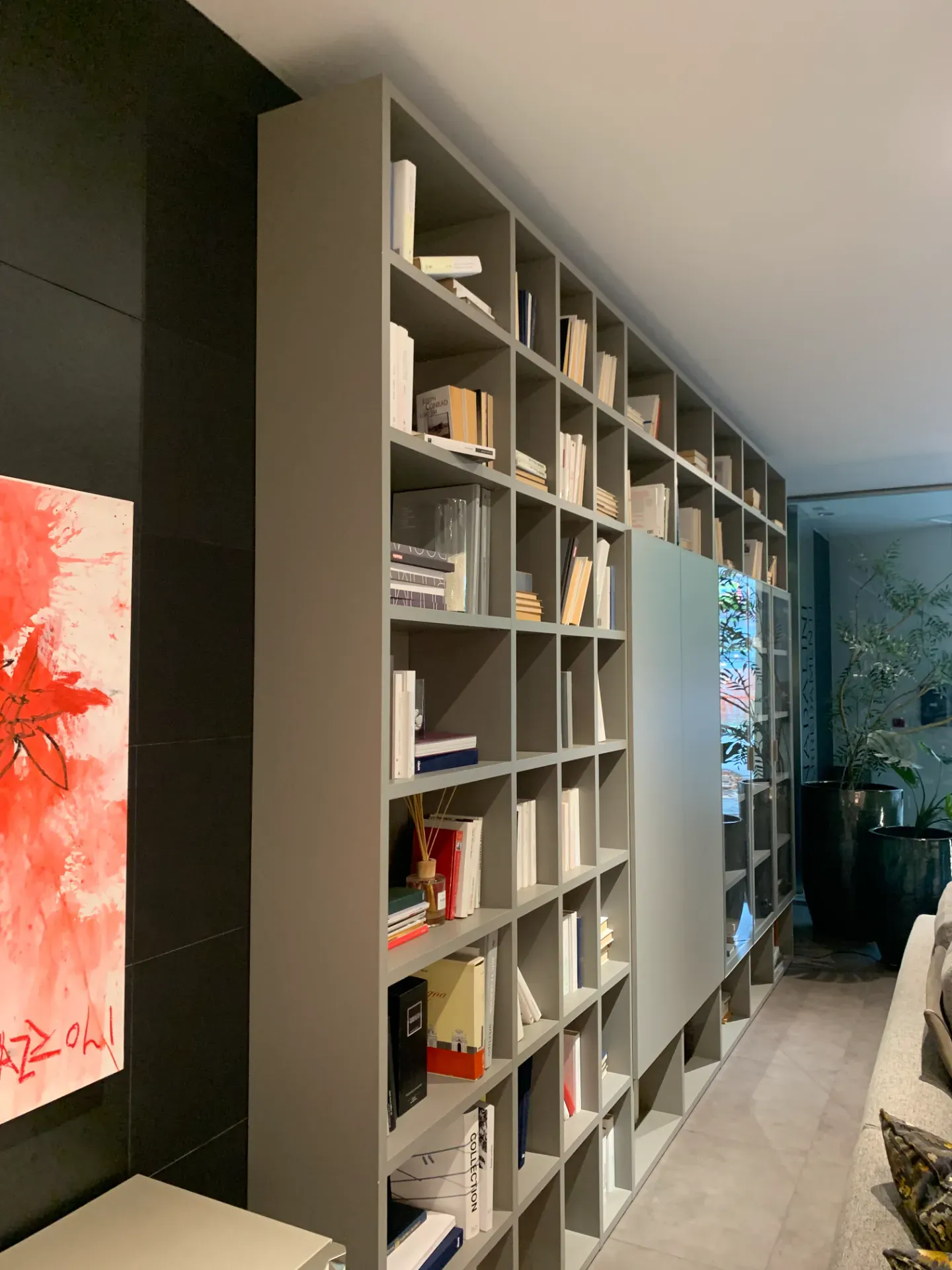 Forme decise e materiali di prima scelta connotano tutte le librerie Artigianale: scopri il modello in laccato opaco qui visibile e completa la zona giorno.