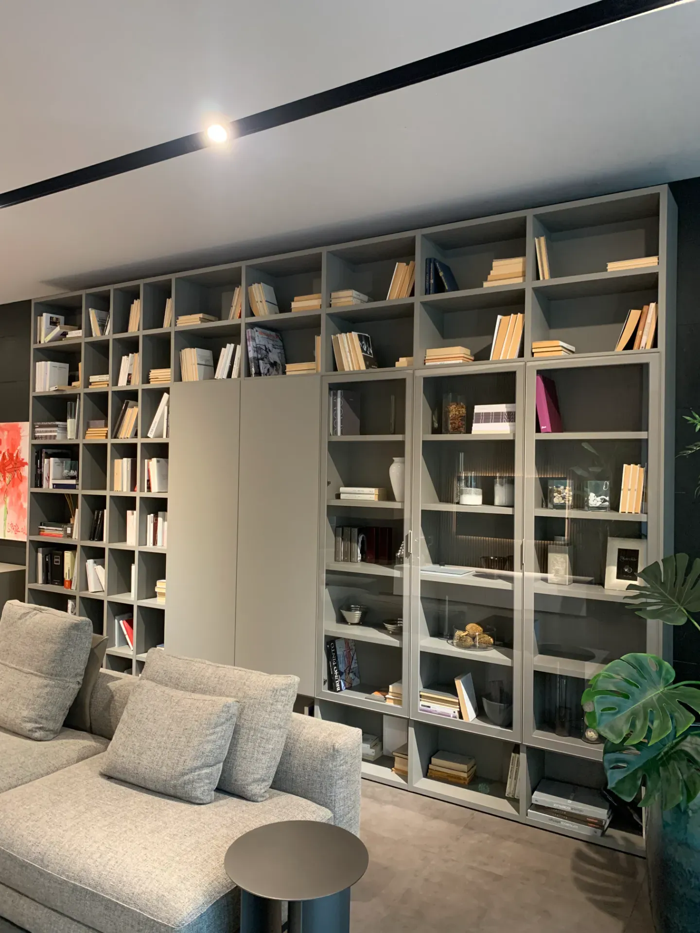 Libreria a spalla con vani a giorno e ante chiuse e in vetro.