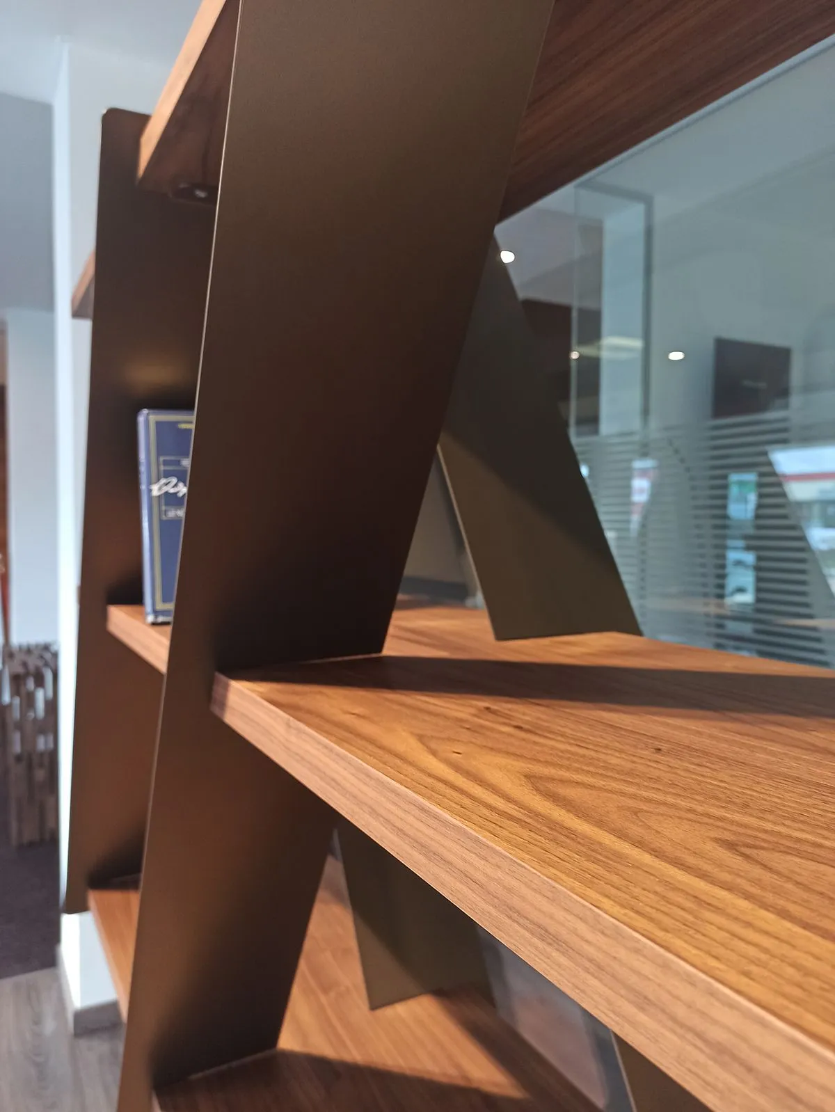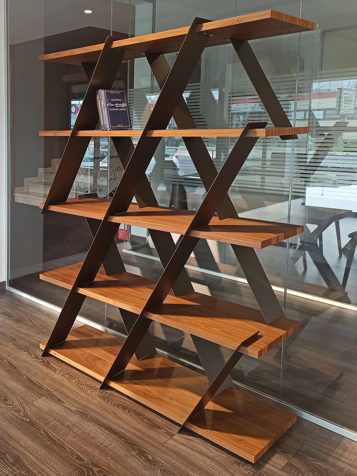Castle è Outlet una libreria minimalista di design con ripiani in legno sostenuti da una struttura leggera di pannelli in metallo laccato; questi ultimi intersecano in obliquo l'orizzontale dei ripiani, dando robustezza alla libreria e generando la particolare configurazione a rombi. Questa disposizione geometrica richiama la forma tipica del "castello di carte". La libreria Castle, essendo totalmente rifinita su tutte le superfici, può essere impiegata non solo a parete, ma anche per creare una parete divisoria a centro stanza, ad esempio per separare il tavolo da pranzo dal salotto.