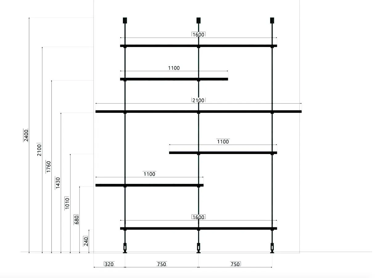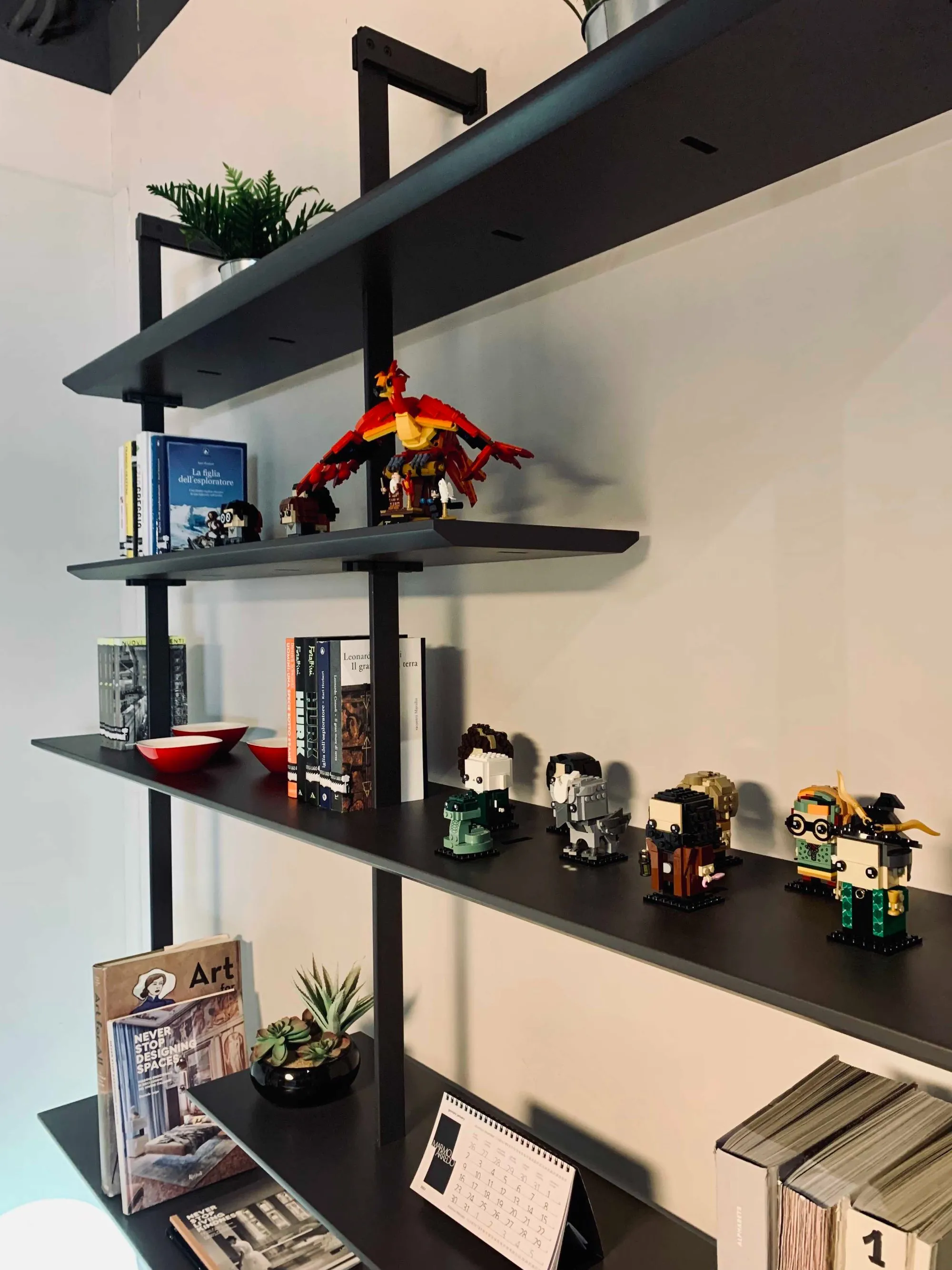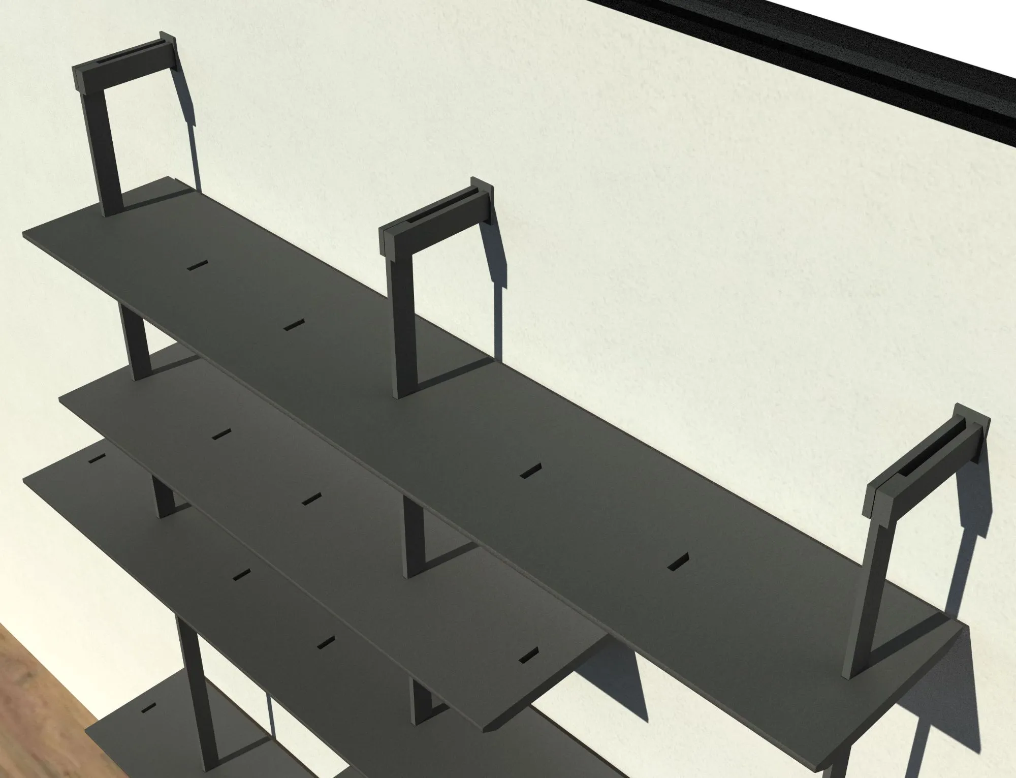 Composta da 3 montanti X H240 metallo goffrato graphite, 2 ripiani cm160x29 in legno goffrato graphite - 3 ripiani cm110x29 in legno goffrato graphite - 1 ripiano cm210x29 in legno goffrato graphite e 15 reggipiano in metallo goffrato graphite.