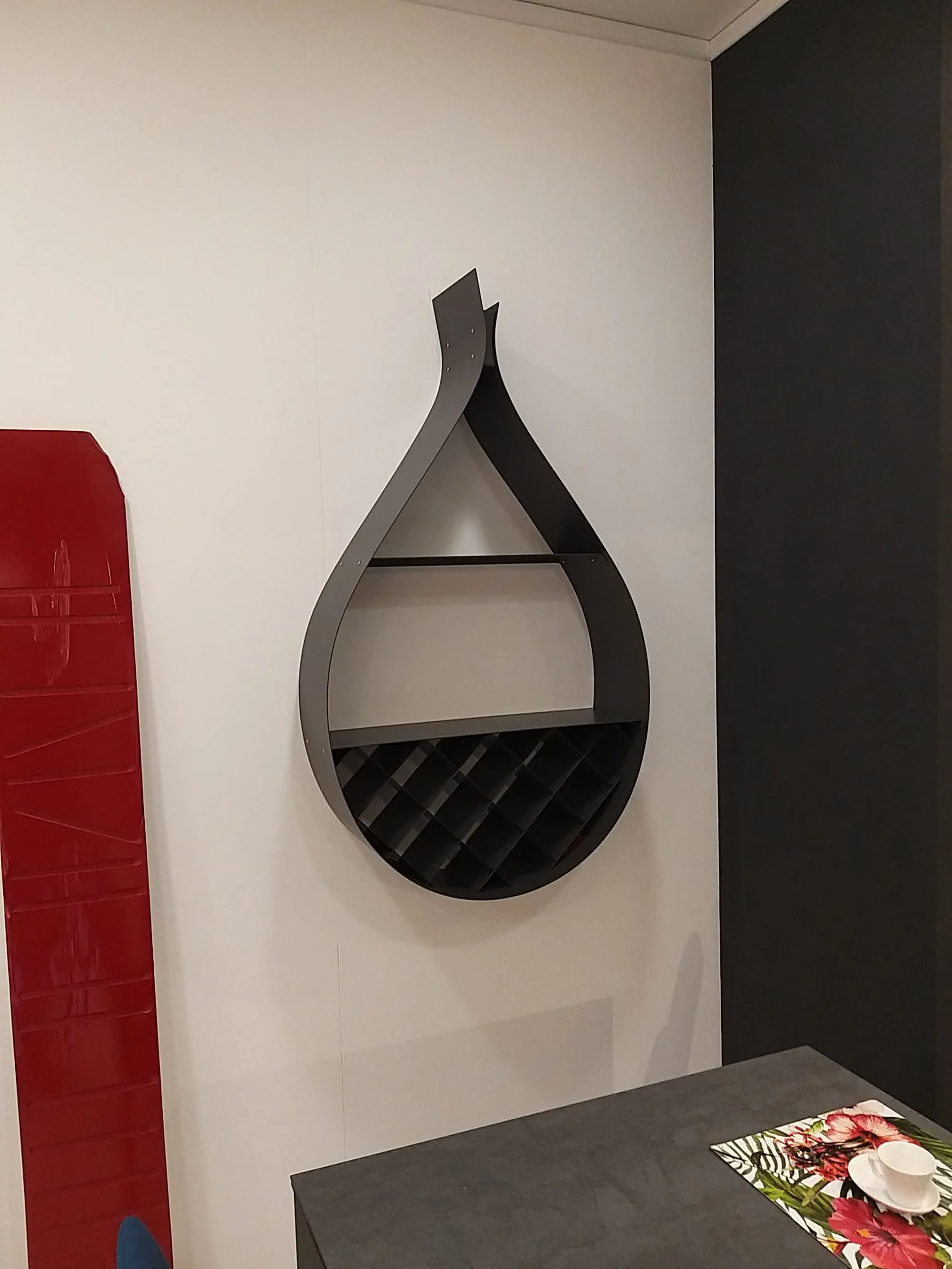 Con una forma a goccia evocativa della sua funzione, le bottiglie e gli oggetti esposti rendono Drop un oggetto di design decorativo e funzionale al tempo stesso.