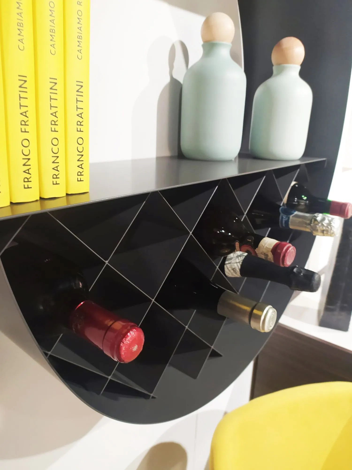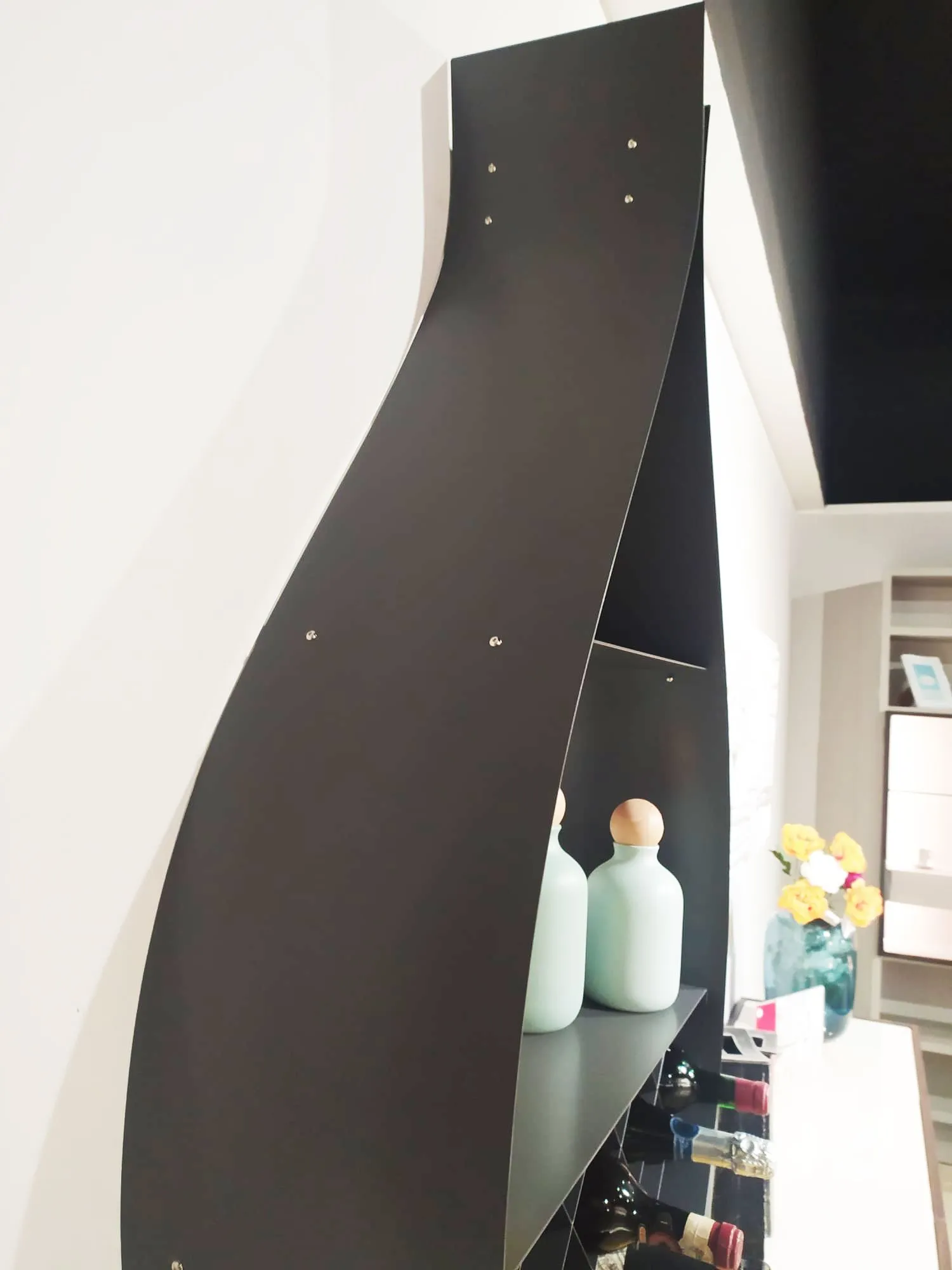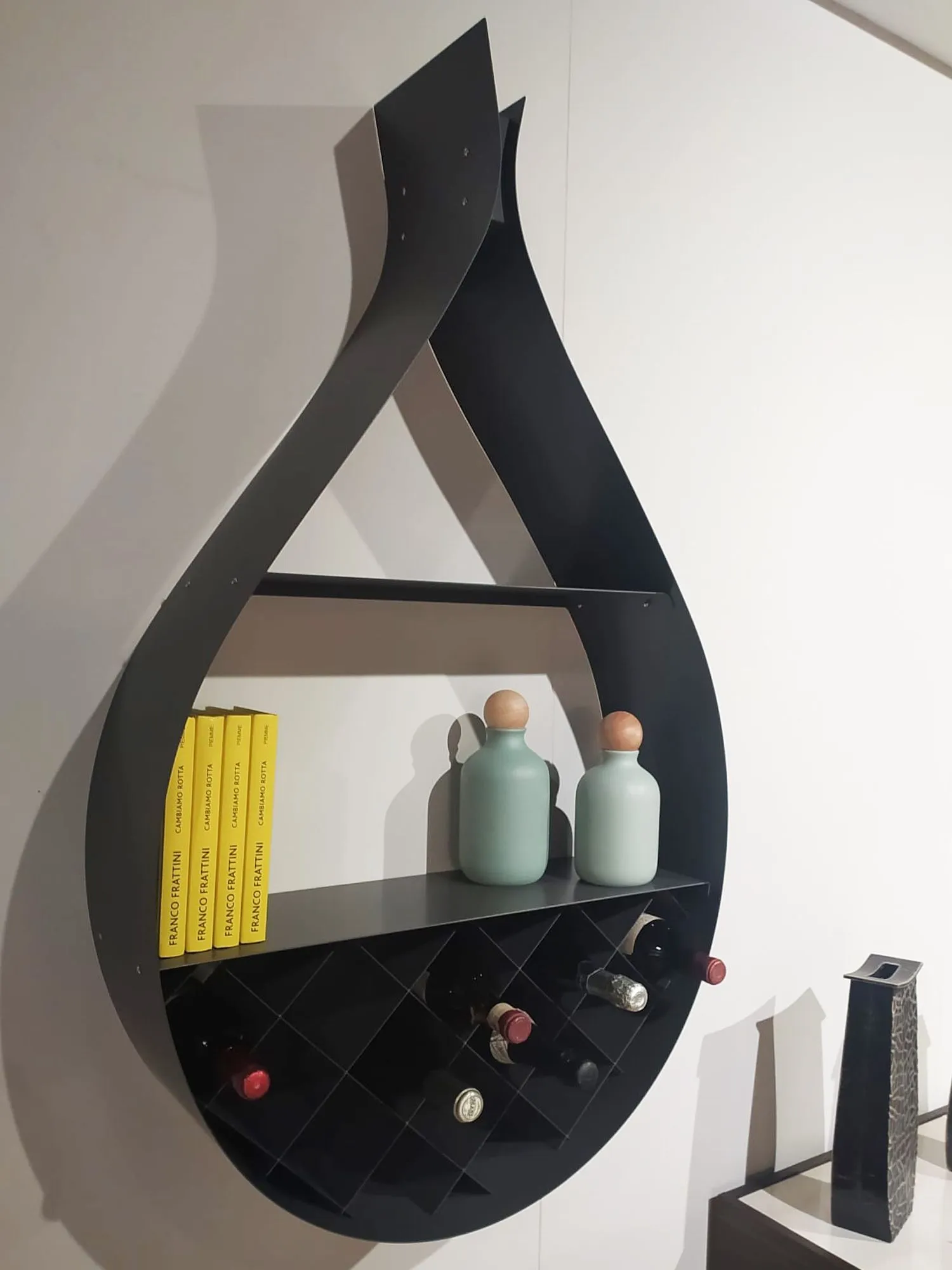 PORTABOTTIGLIE/LIBRERIA CATTELAN MODELLO DROP Drop è una libreria portabottiglie di design a forma di goccia che viene montata a parete, ideale per cucina o soggiorno. STRUTTURA: in acciaio inox GRAFITE GRIGLIA PORTABOTTIGLIE E RIPIANO: verniciati colore grafite. MISURE: cm 70 di larghezza, cm 23 di profondità e cm 121 di altezza.