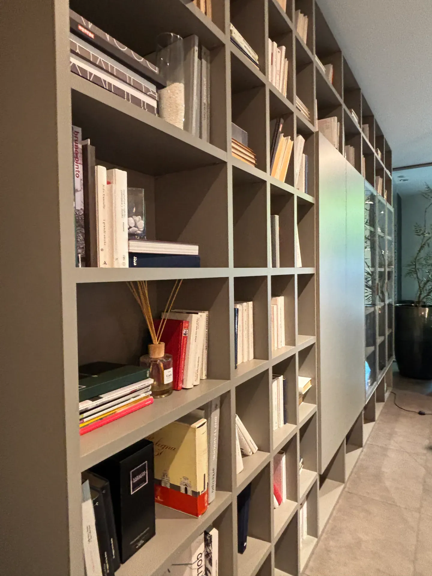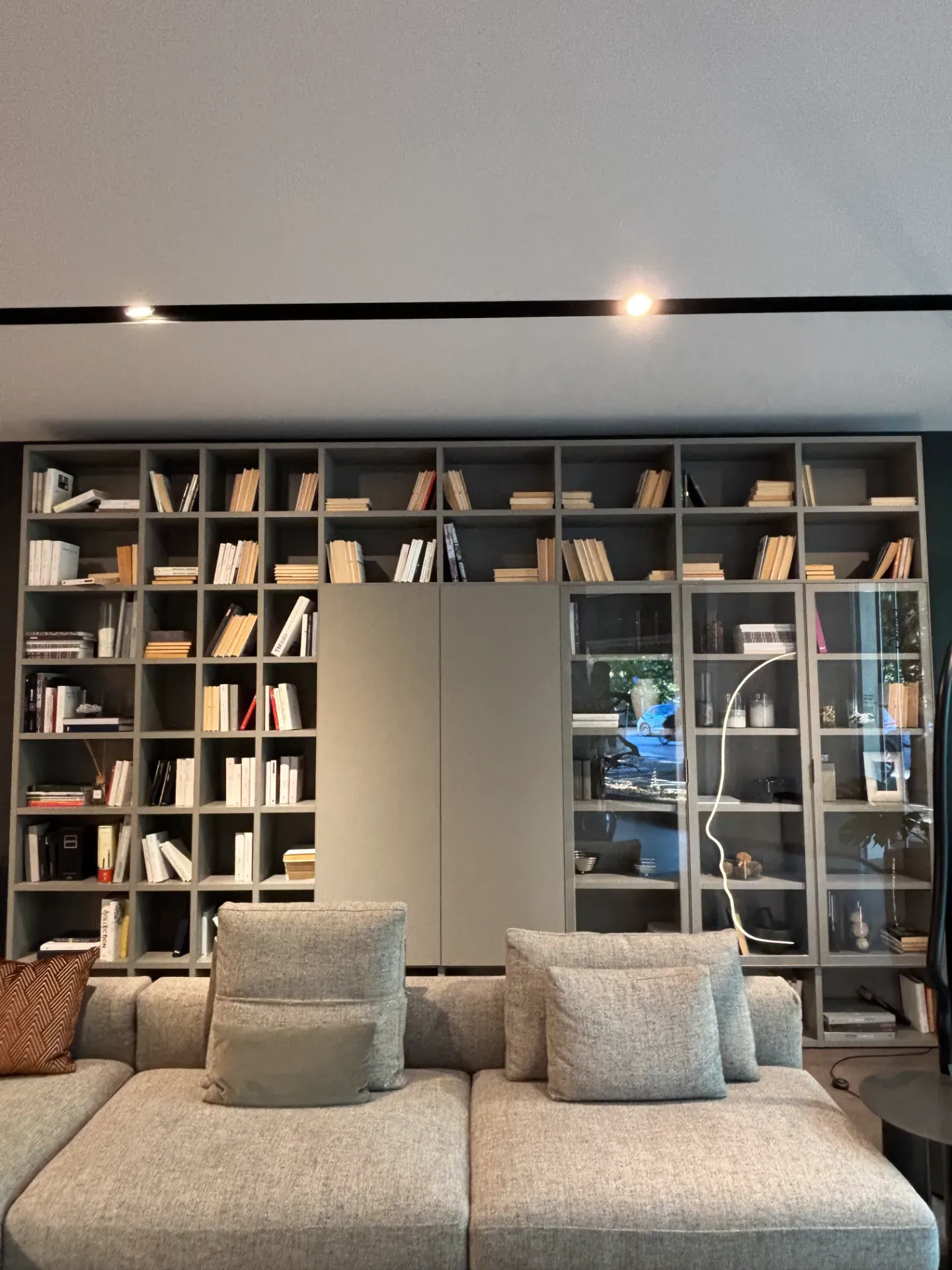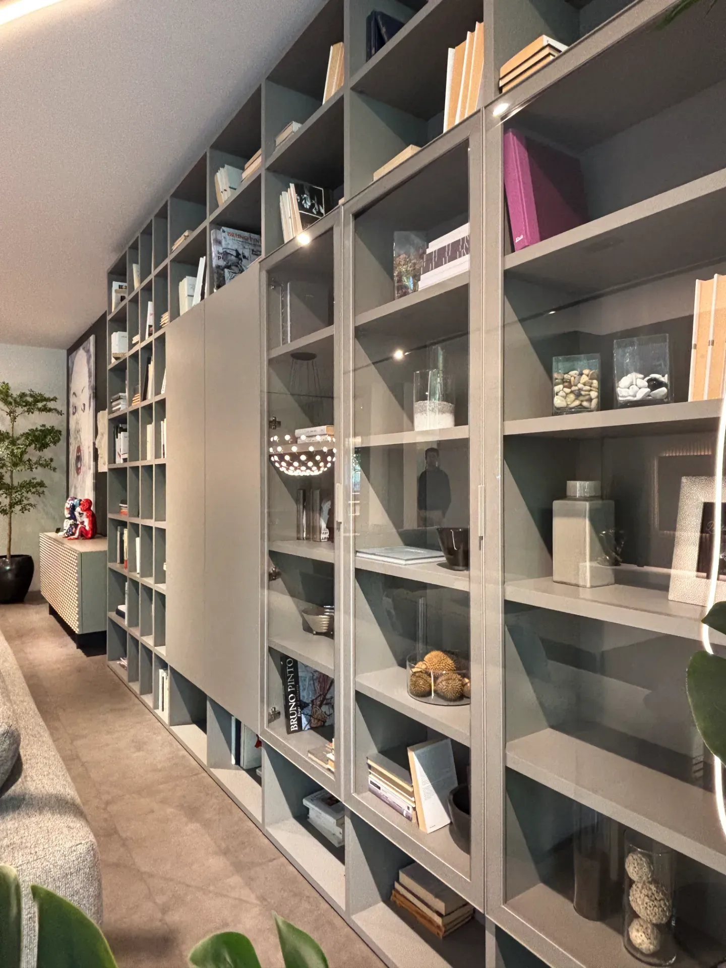Libreria a spalla con vani a giorno e ante chiuse e in vetro.