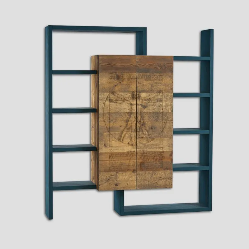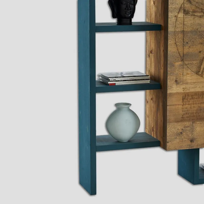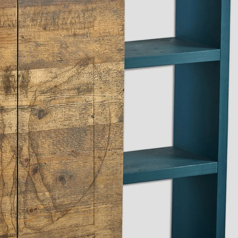 Libreria 2 ante e 8 ripiani in legno vecchio, struttura esterna finitura laccata e cerata a pennello color Verde Ottanio. Parte centrale con pirografia su ante e ripiani interni in legno vecchio finitura Naturale. - Altezza cm. 200 - Lunghezza cm. 180 - Profondit cm. 42
