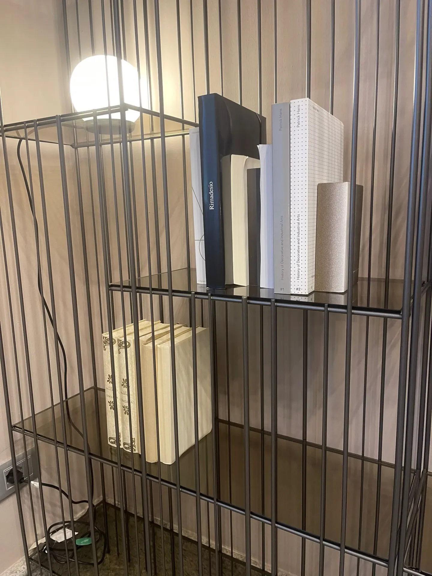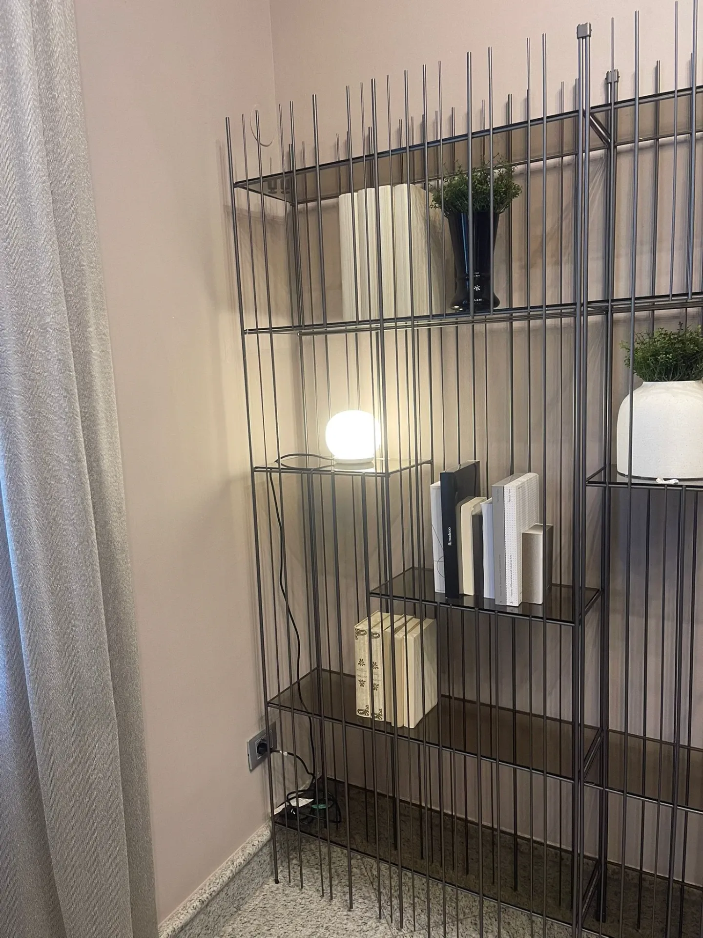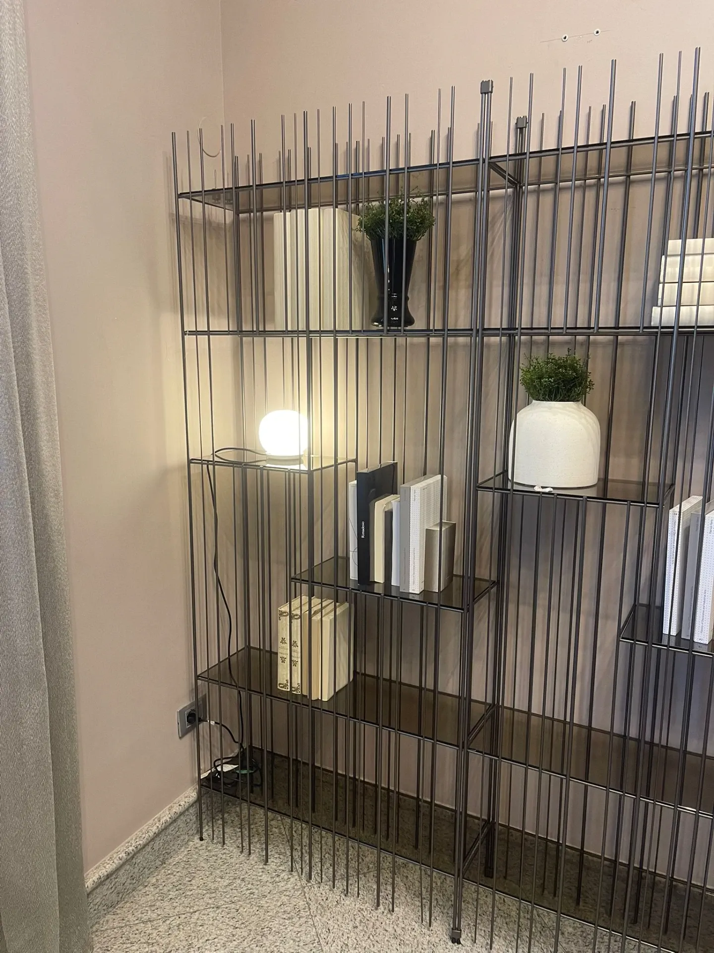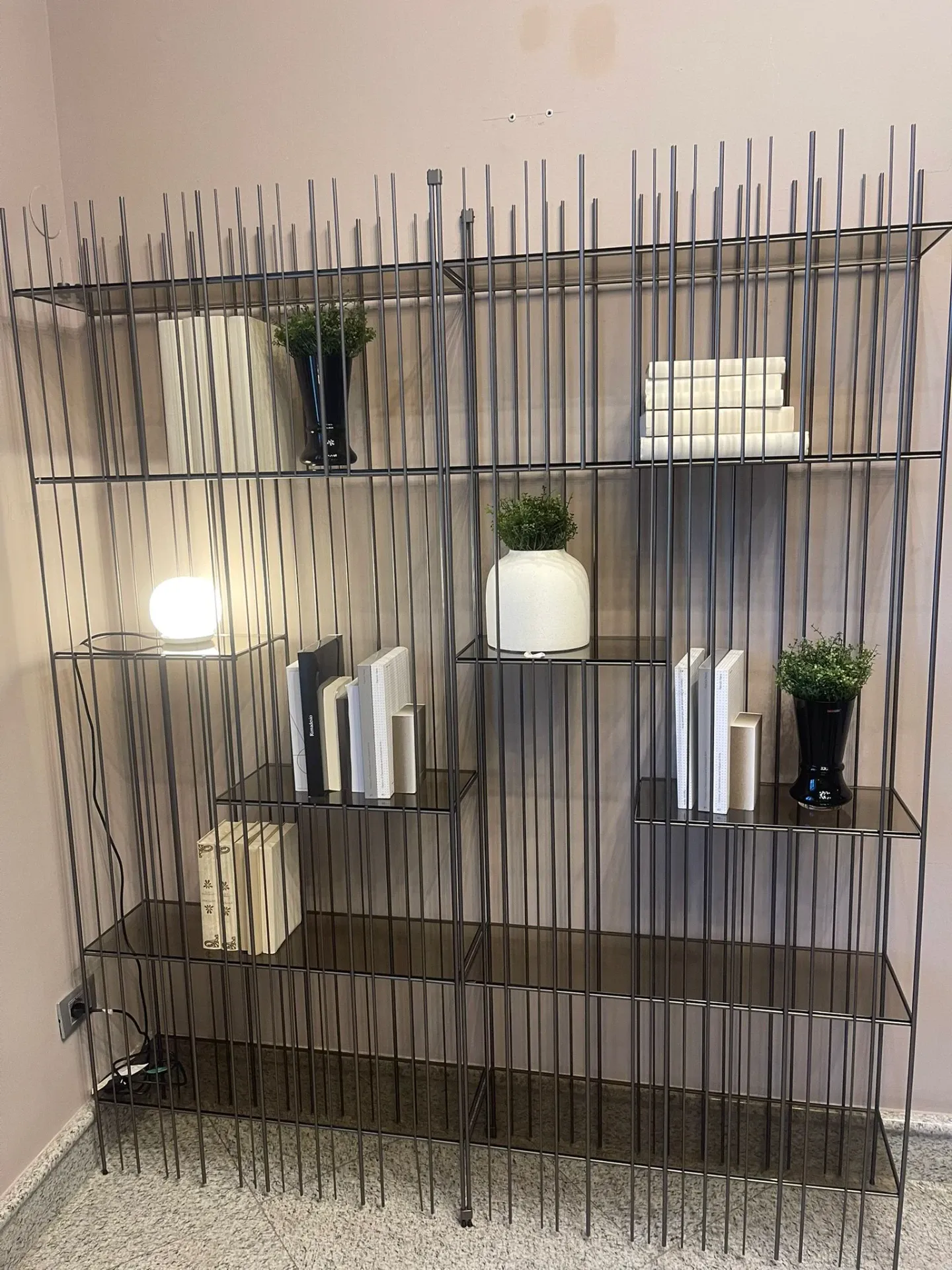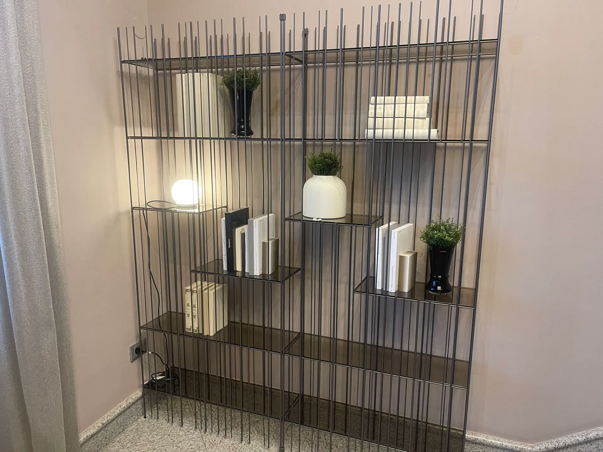 Metrica è una libreria in metallo disponibile nelle finiture titanio, brunito e oro con ripiani in cristallo trasparente disponibili in bronzo o verde. La struttura è semplice, il ritmo è scandito dalle bacchette di ferro fissate a diversi intervalli su una struttura apertamente rigorosa entro la quale i libri e gli oggetti inseriti ne completano la forma scrivendo di volta in volta nuove composizioni.