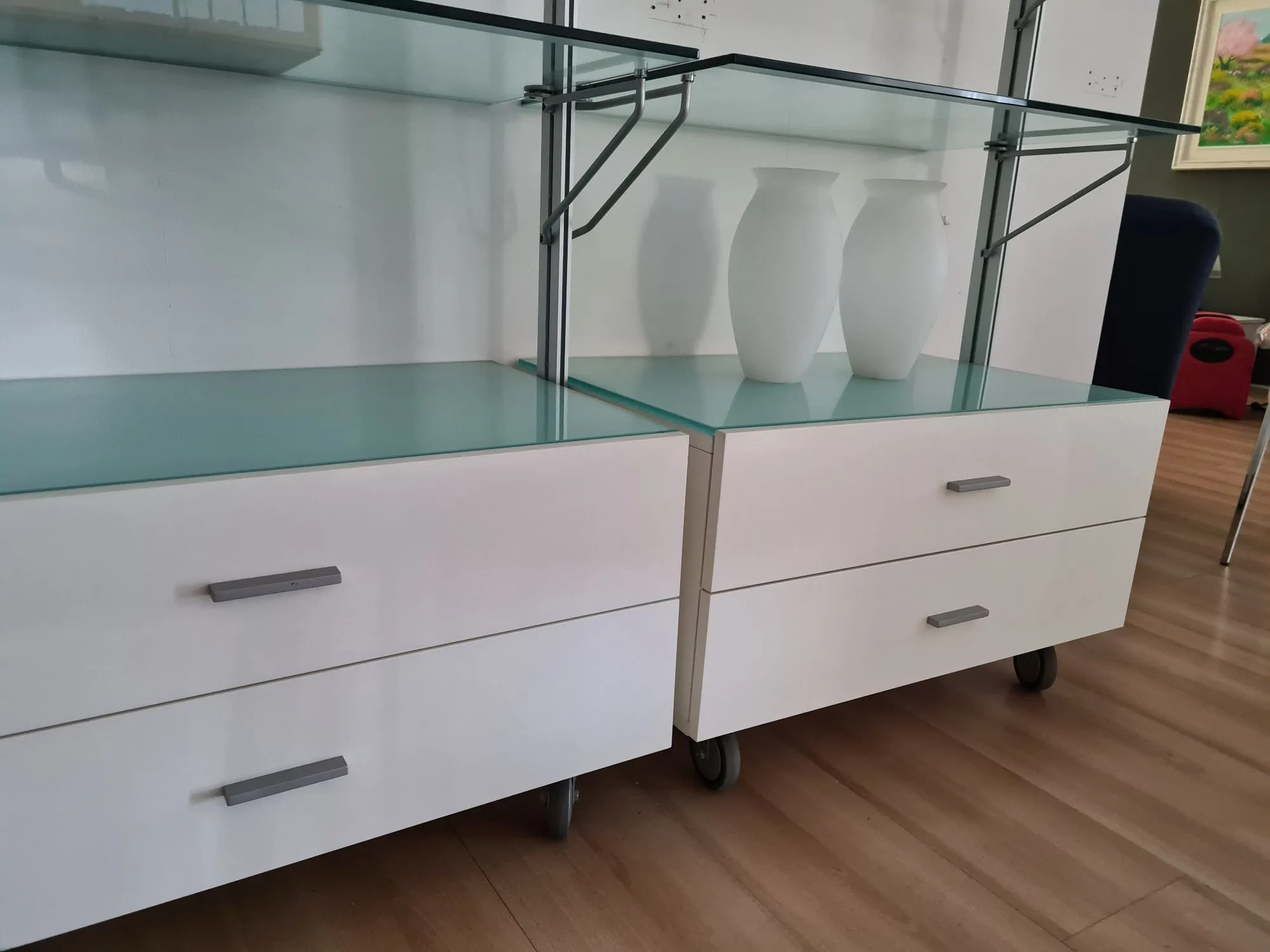 Libreria in vetro a tre ripiani con reggipiani a sbalzo e montante terminale a muro, compresa di cassettiera. Ottima per qualunque situazione ambientale. Struttura: Montante terminale e intermedio a muro, con reggipiani a sbalzo e cassettiera. Finitura: Vetro Cassetti: Quattro cassetti bianchi Ripiani: In vetro, con ripiano cassettiera in cristallo sabbiato Lunghezza: 187 cm Profondità: 55 cm Altezza: 207 cm