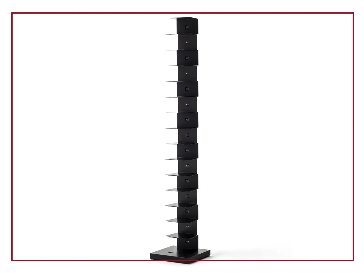 Libreria verticale self standing in acciaio laccato nero opaco per riviste o libri di grande formato, base incisa con la firma del designer.