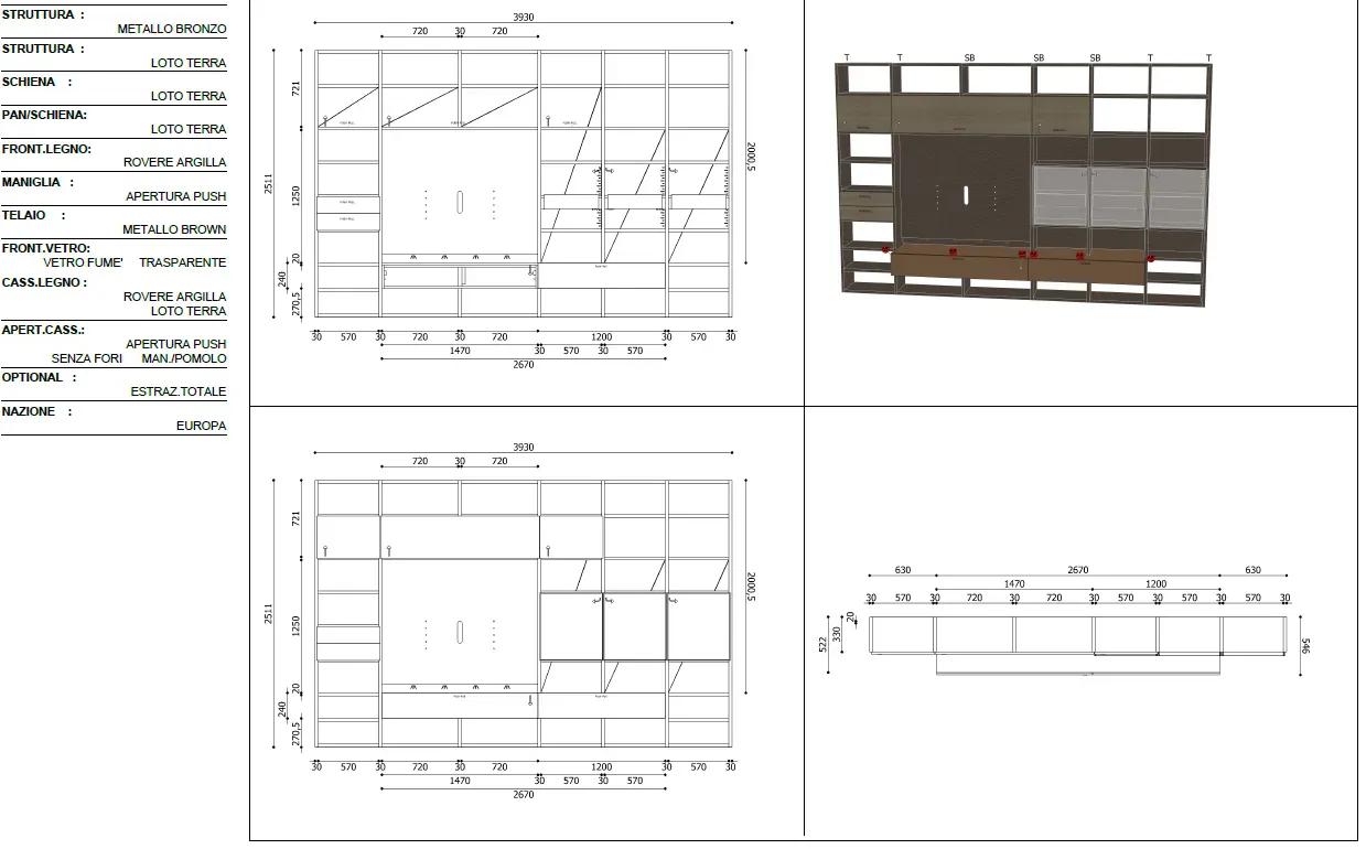 La composizione scelta è formata da struttura (fianchi e ripiani) di spessore 3 cm e profondità 33 cm, schienale presente in modo alternato e pannello per TV con luce di cortesia, il tutto in materico loto terra. I frontali in legno, finitura rovere argilla di spessore 2 cm sono scelti per i due cassetti a sinistra e le ante vasistas. Questi si contrappongono alle ante Scrigno in vetro trasparente fumè, di spessore 3,5 cm, e alle due basi sospese laccate metallo bronzo con frontale di spessore 2 cm e profondità totale 54,6 cm. Queste due basi, una a ribalta e l'altra cestone ad estrazione totale con apertura push-pull, presentano un top unico. Creando così un bellissimo ed ampio piano di appoggio, che diventa ripiano nei due moduli laterali.