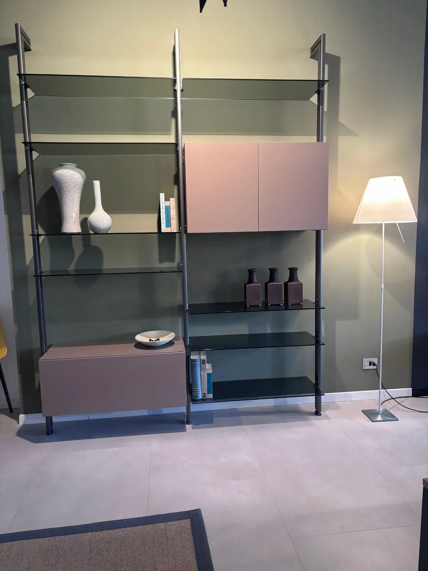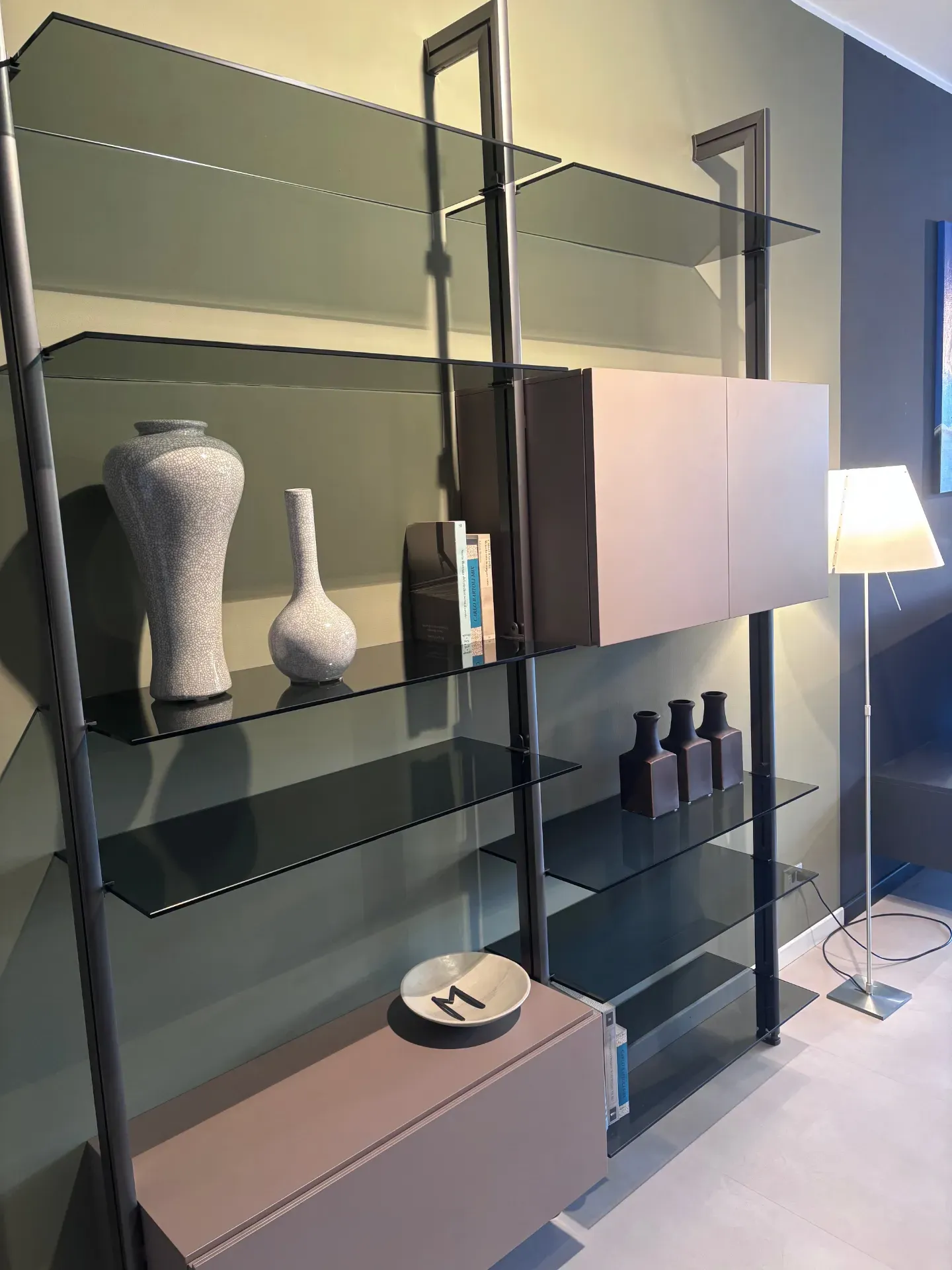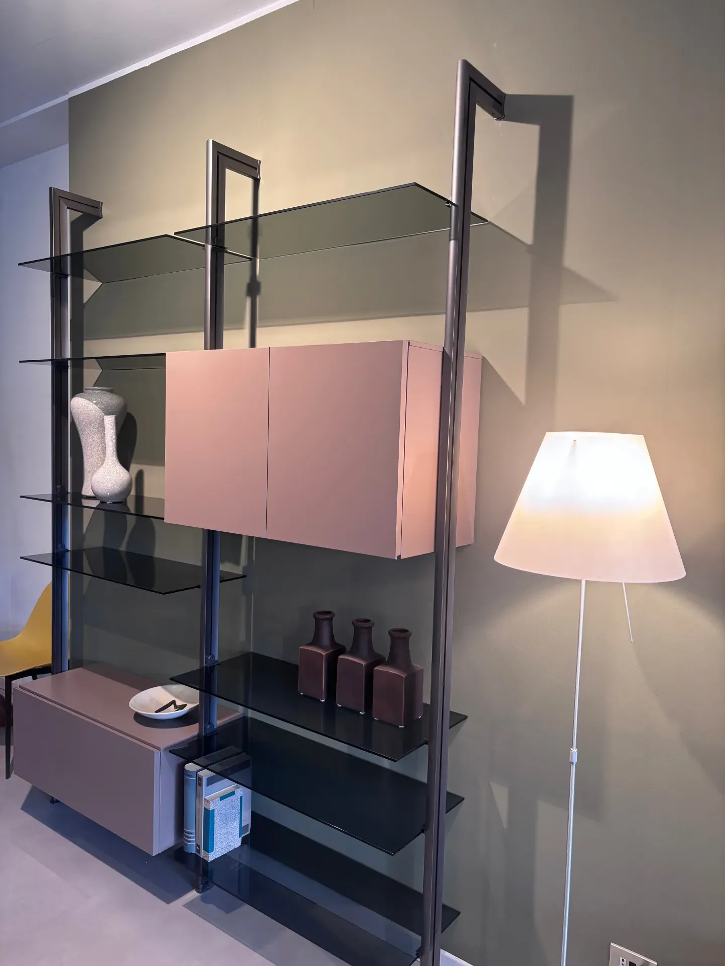 La libreria OPEN è composta con pali in alluminio con piedi regolabili e fissaggio a parete. I contenitori sono laccati, con maniglia integrata e posizionabili a tutte le altezze, così come i ripiani in vetro fumè.