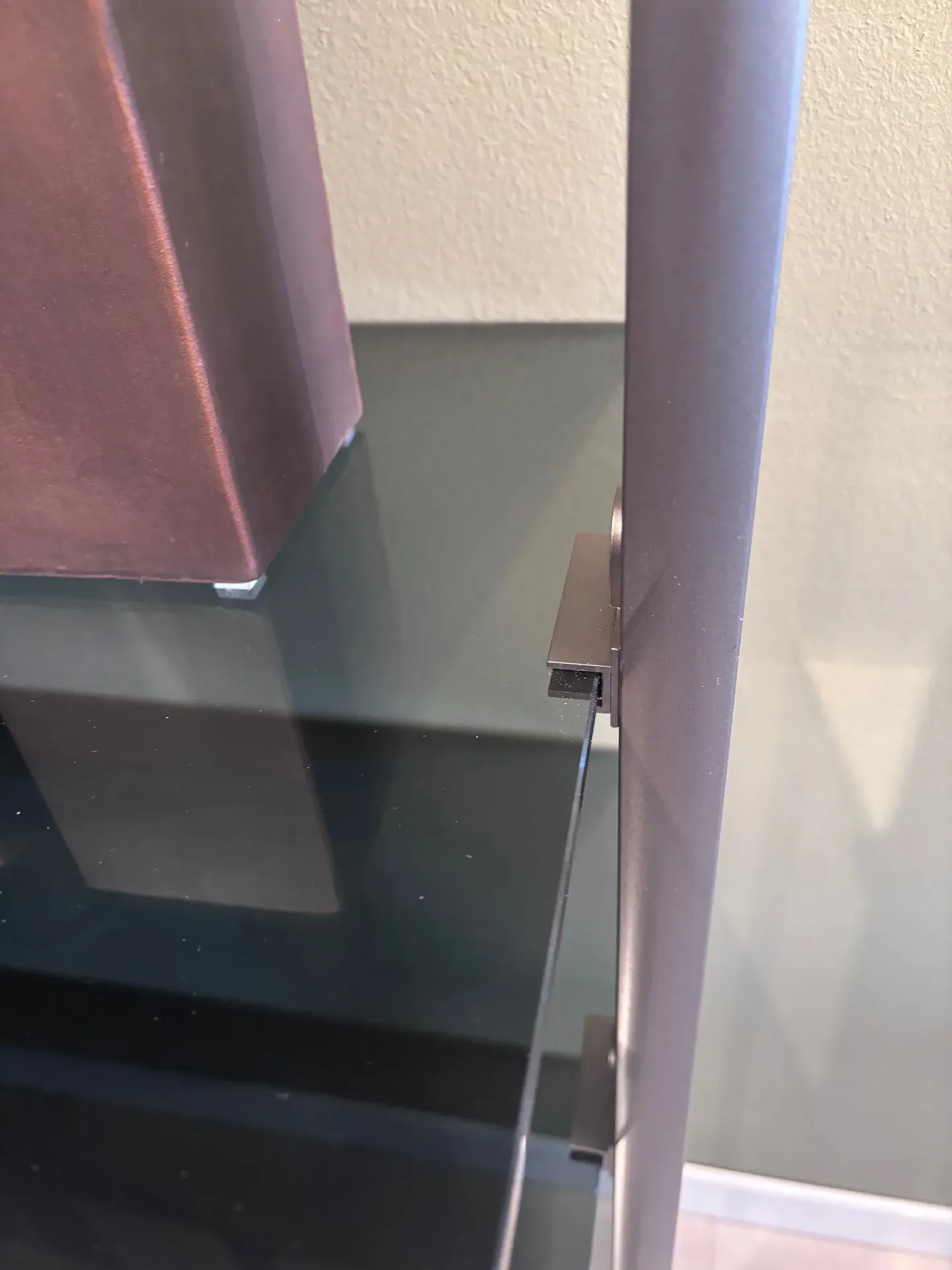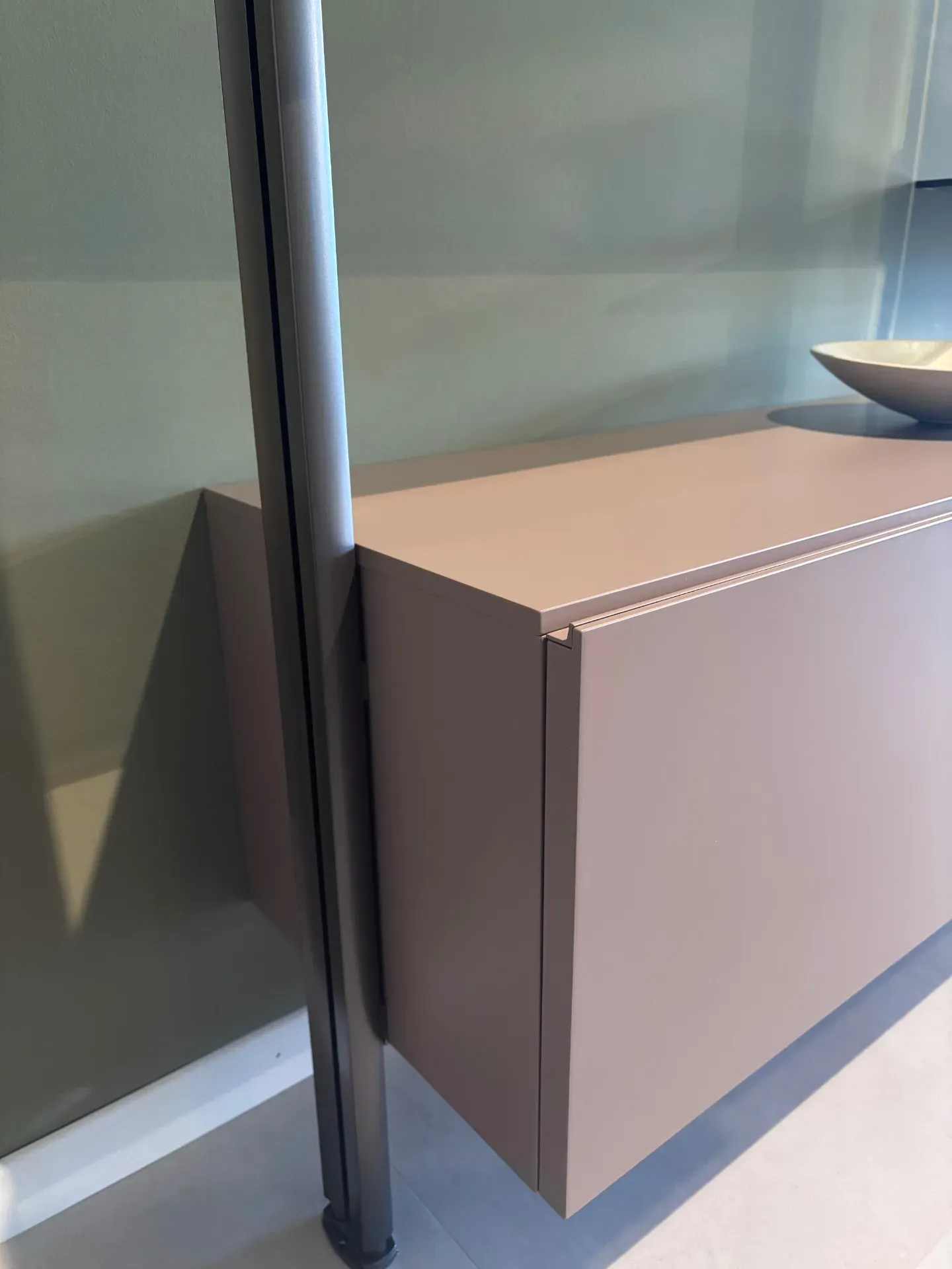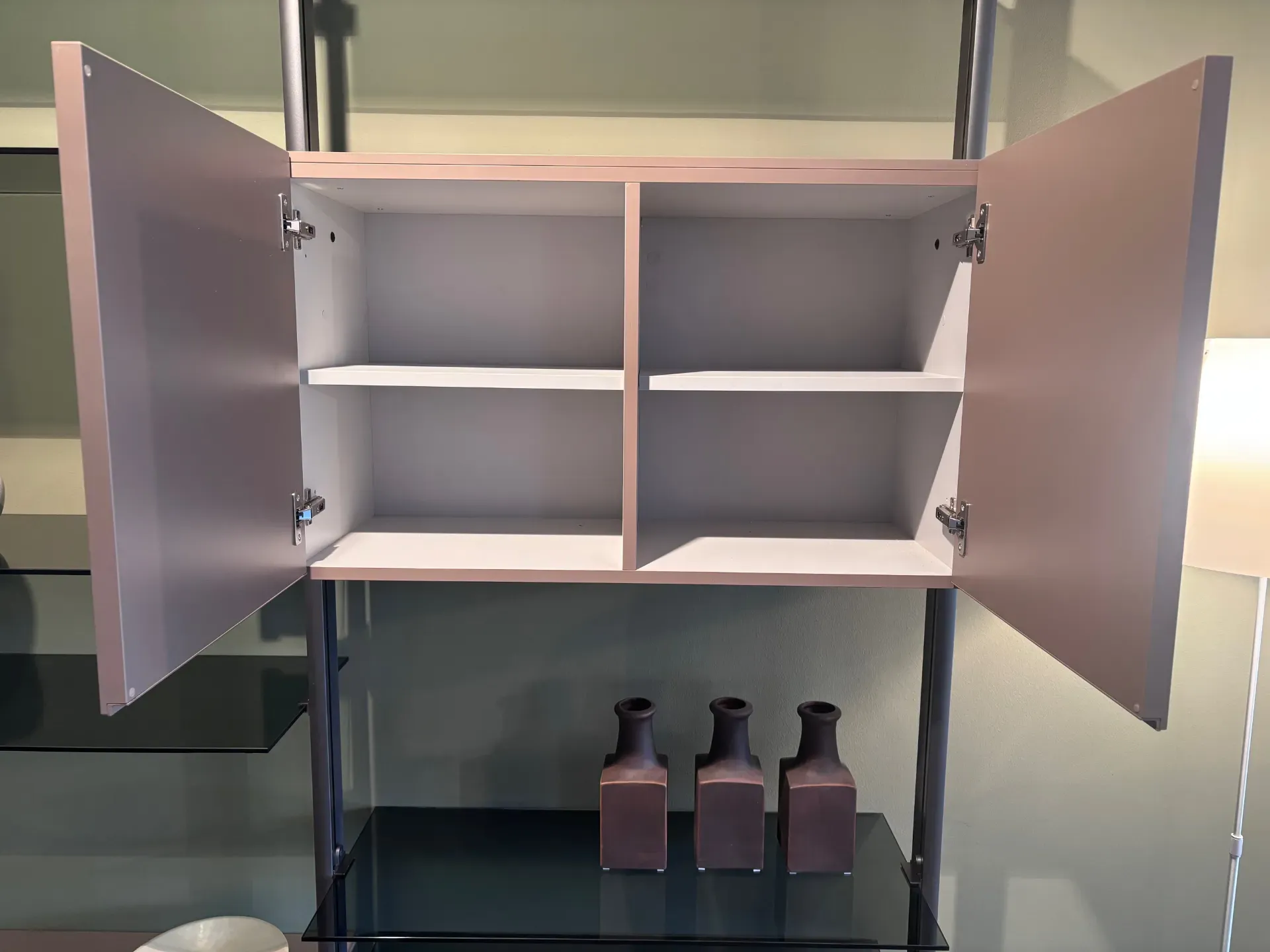 La libreria OPEN è composta con pali in alluminio con piedi regolabili e fissaggio a parete. I contenitori sono laccati, con maniglia integrata e posizionabili a tutte le altezze, così come i ripiani in vetro fumè.