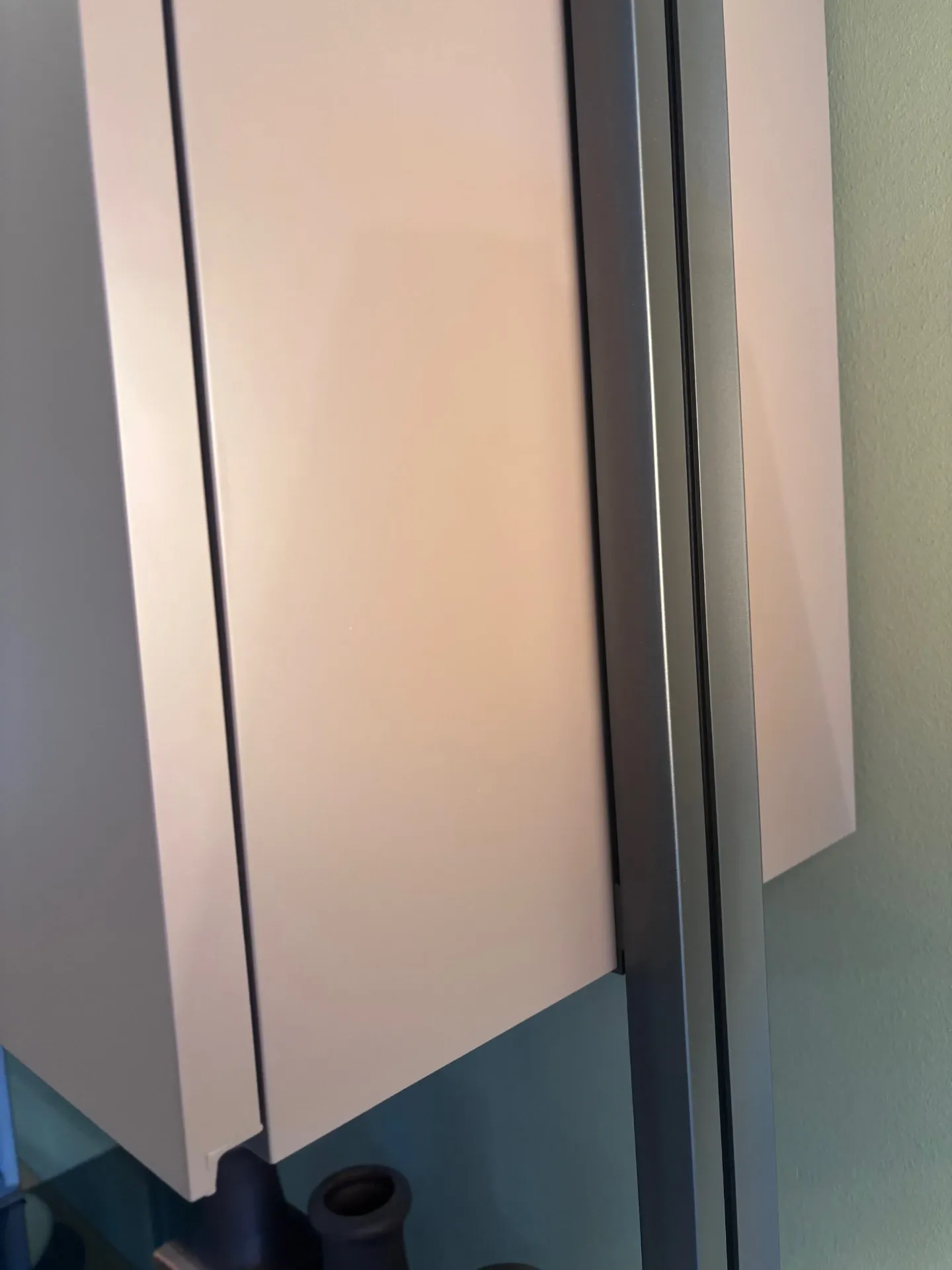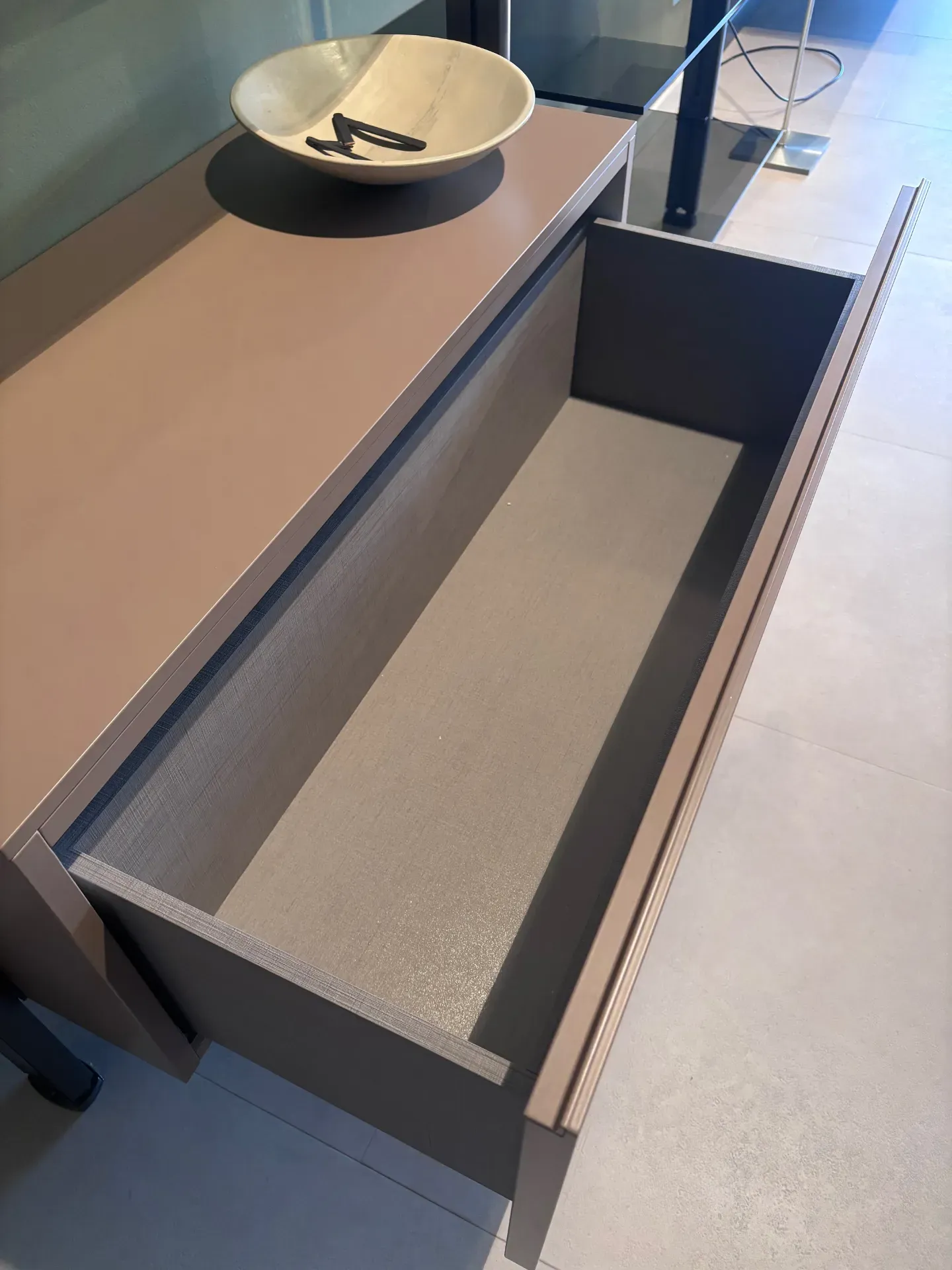 Nella composizione sono presenti un contenitore a due ante battenti ammortizzate e una base con cassetto con guide ammortizzate.