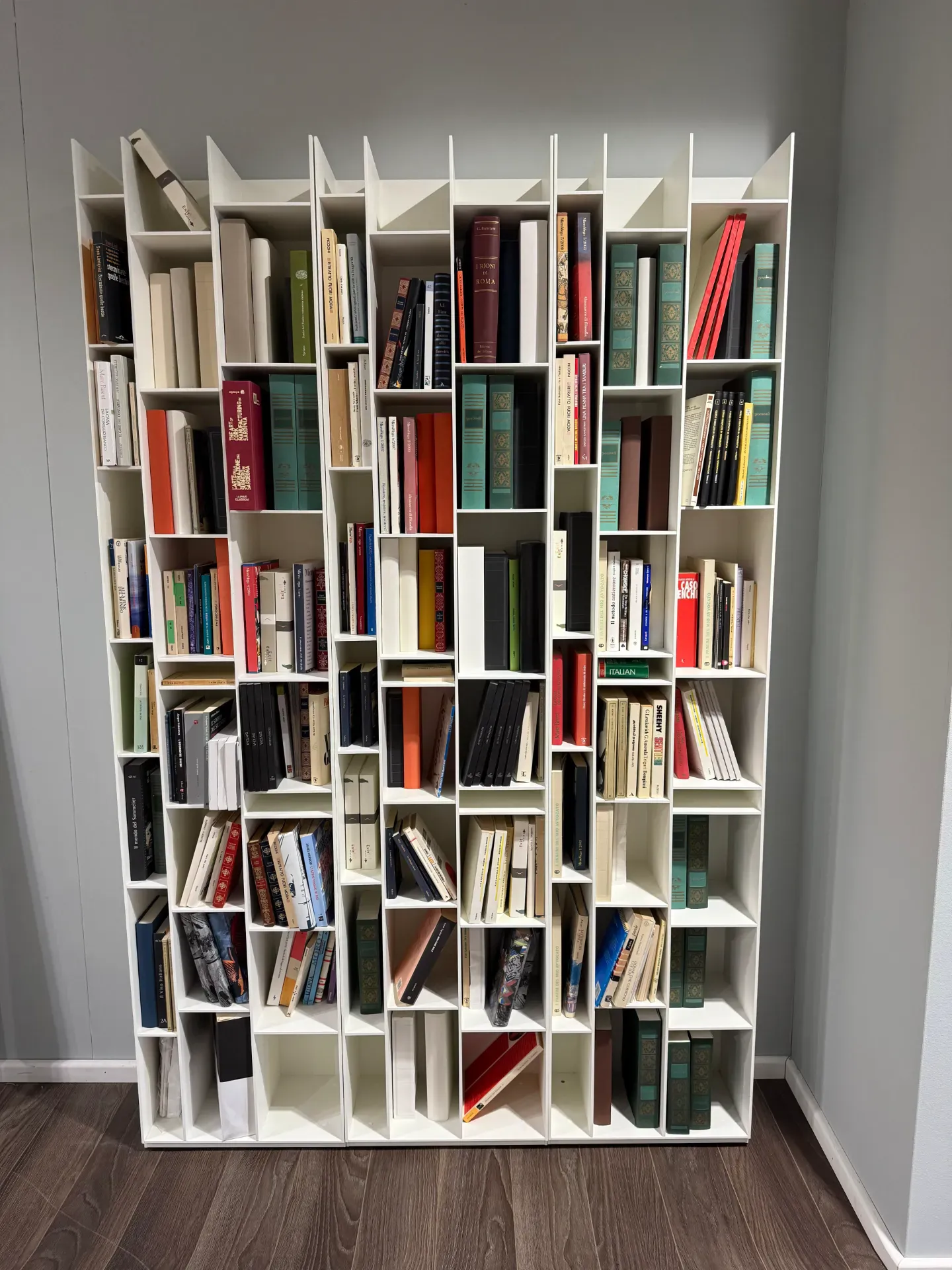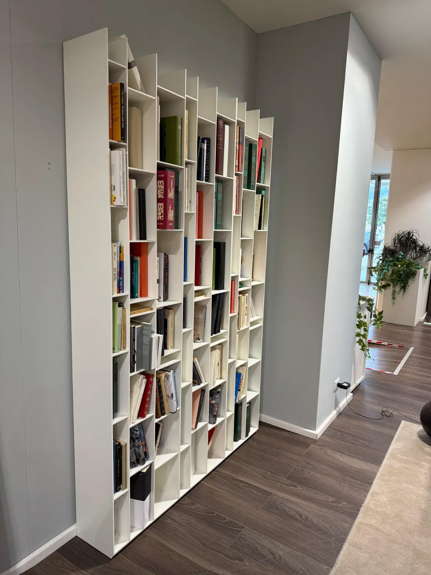 La libreria Random di MDF Italia: struttura modulare in pannelli MDF laccati, ripiani irregolari, stile moderno e flessibile. Versione in offerta outlet.