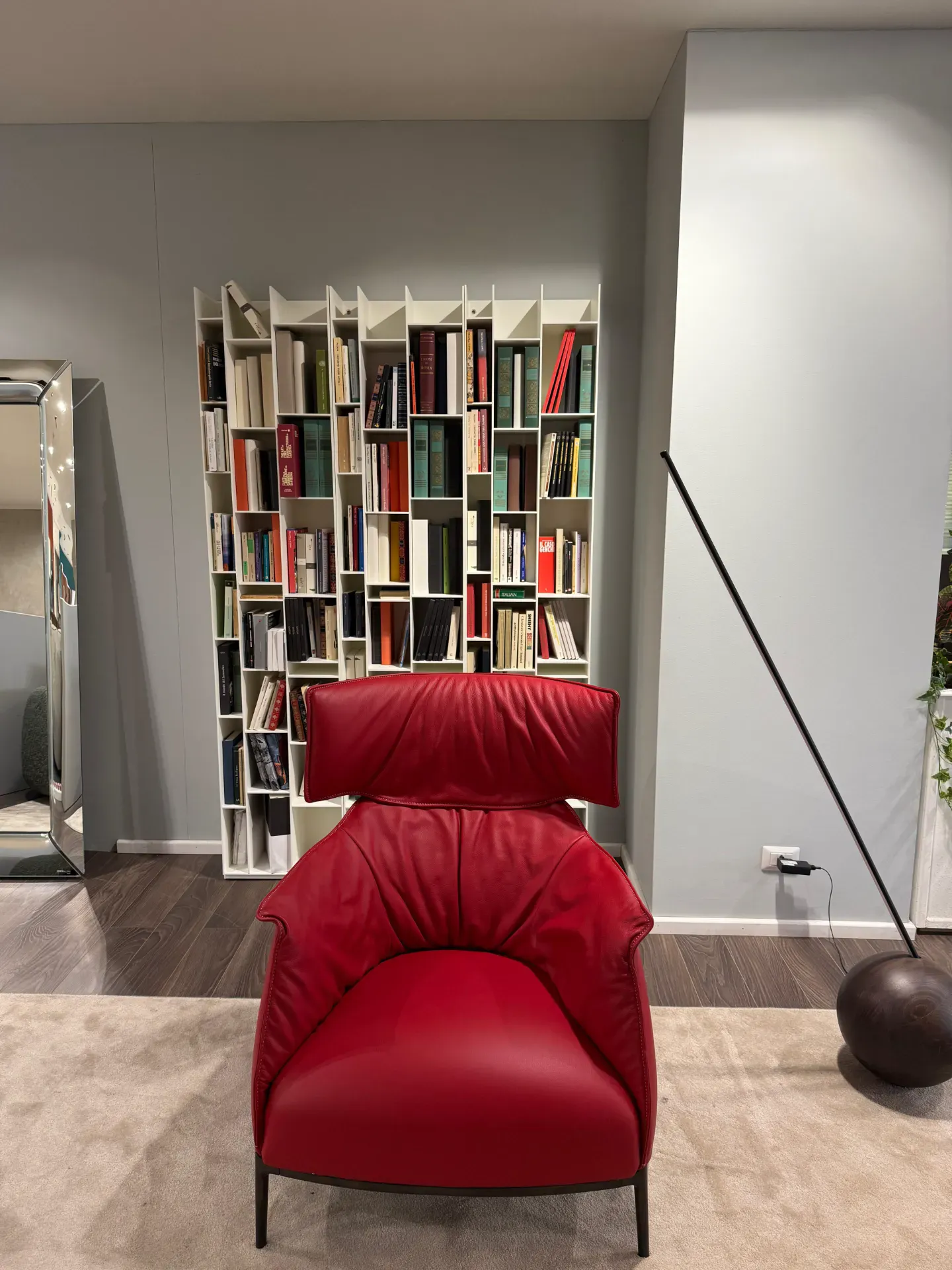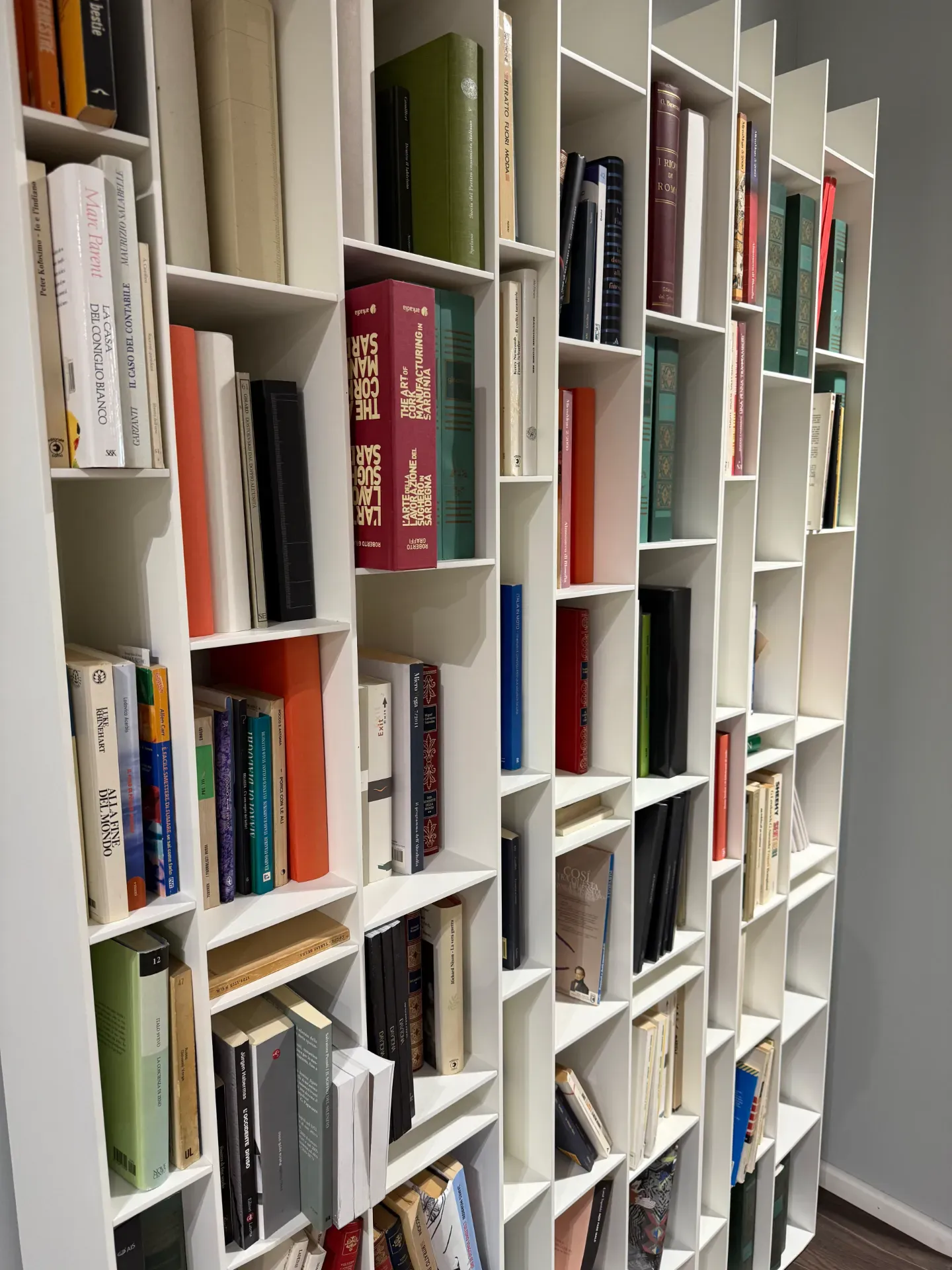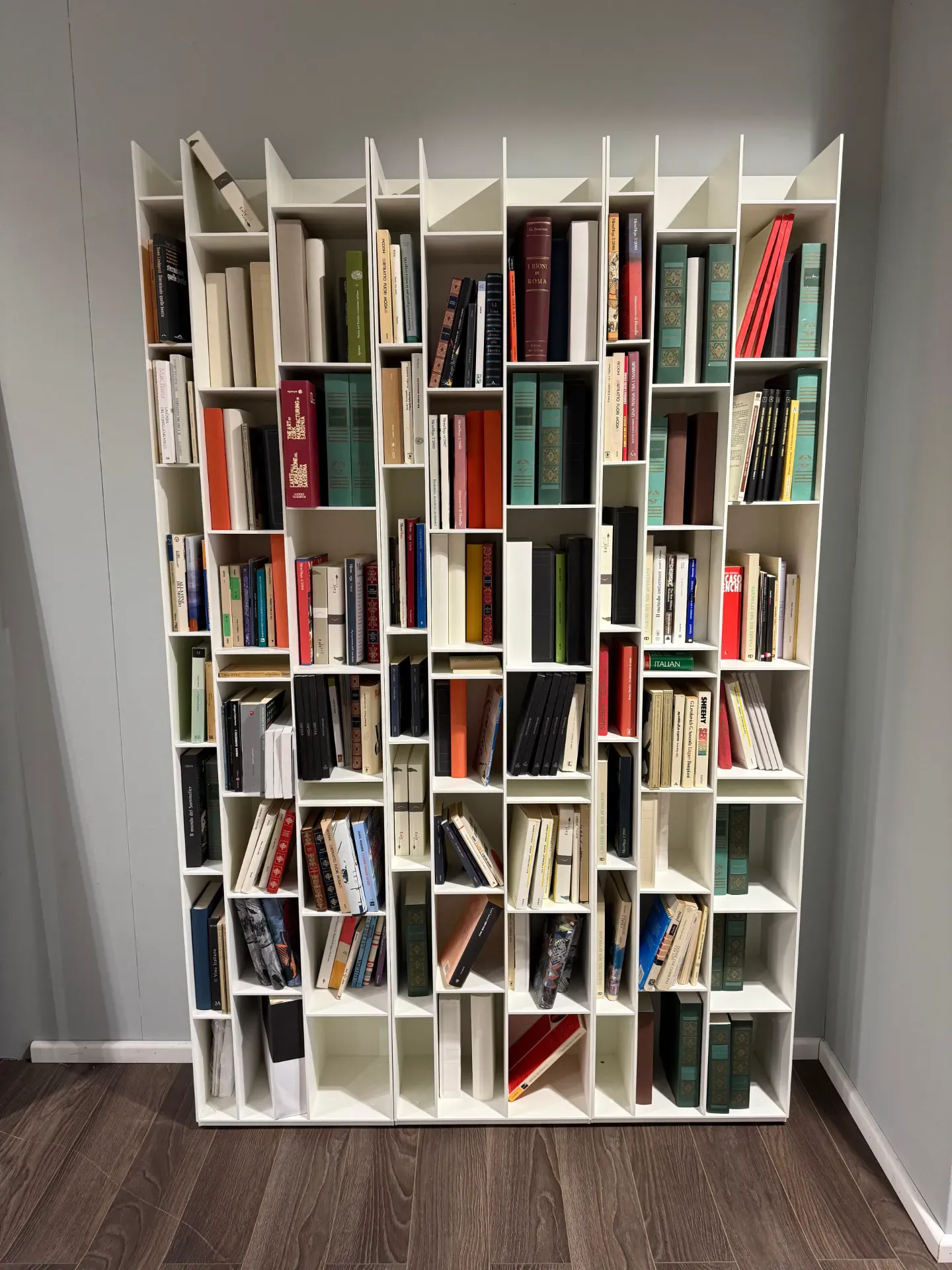 Random trasforma la libreria da semplice contenitore a un vero e proprio elemento di arredo-scultura: i ripiani, disposti a diverse altezze in modo non uniforme, creano movimento e ritmo, rendendo ogni modulo personale e dinamico.