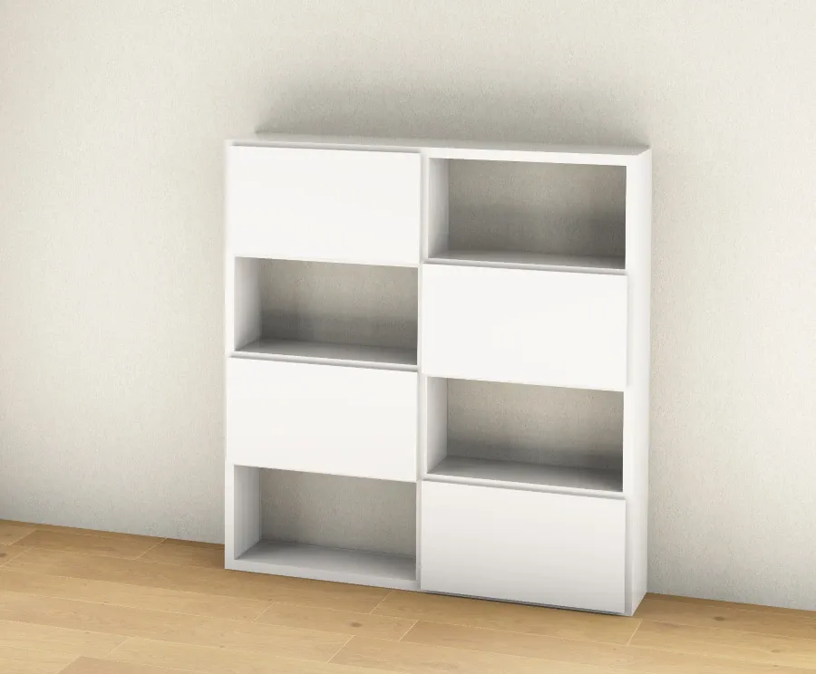 Libreria Modo di Sangiacomo laccata opaco Bianco 10; vani a giorno non schienati, e vani chiusi da ante ribalta con schiena sempre laccata opaco Bianco 10.