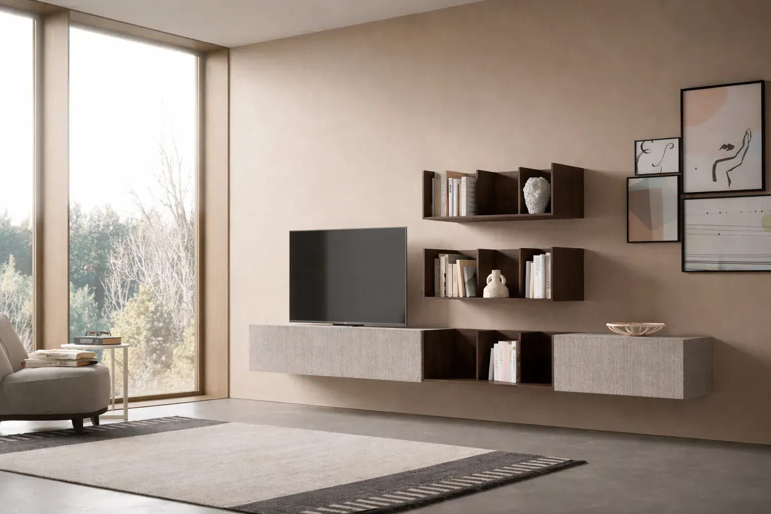 La composizione si sviluppa interamente sospesa, offrendo un effetto visivo arioso e contemporaneo. La base è composta da due contenitori sospesi con 1 cestone in legno, ideali per garantire praticità e capacità contenitiva mantenendo una linea pulita e ordinata. A completare l insieme, la libreria Biblo orizzontale si sviluppa sulla parete con moduli aperti, creando un elegante gioco geometrico perfetto per esporre libri e oggetti decorativi, donando dinamismo e personalità all ambiente.