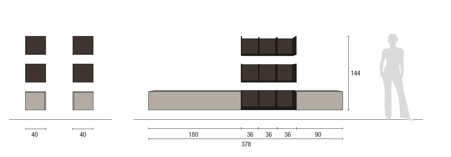 Le dimensioni complessive della composizione sono L 378 cm, P 40 cm, H 162 cm, con elementi così distribuiti: