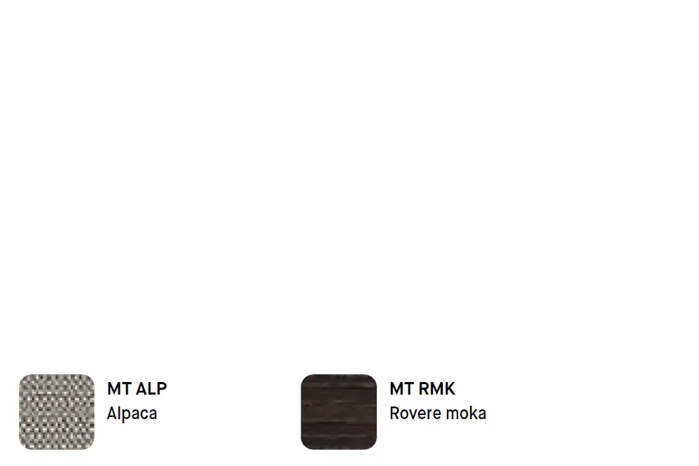 Le finiture combinano matericità e calore: l Alpaca dona un effetto tessuto sofisticato e contemporaneo, mentre il Rovere moka aggiunge profondità e carattere con le sue tonalità scure e naturali, creando un contrasto armonioso ed elegante.