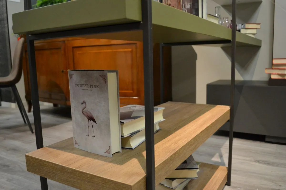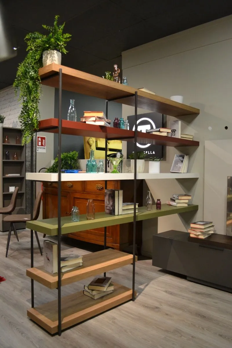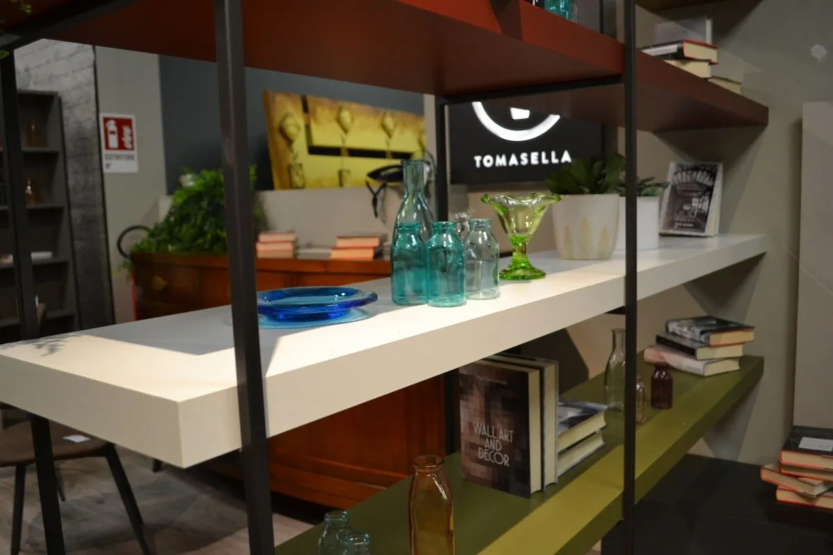 Libreria Tomasella Fortebraccio composta da telai di struttura in metallo e mensole spessore 5 cm. Finiture: materico opaco Bianco Gesso, materico Nodato Chiaro, laccato opaco Verde Muschio 153 e Bordeaux 156, telai in metallo laccato opaco Antracite. Dimensioni: L 198, P 38,5, H 187,5 cm.