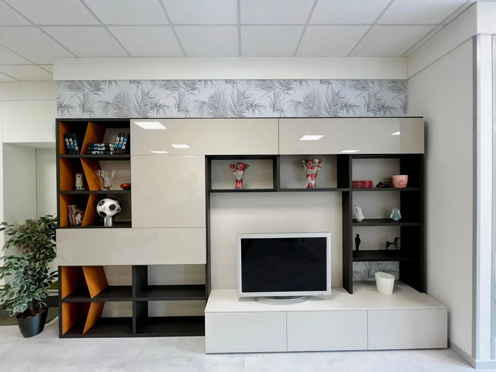 Per valorizzare un soggiorno moderne scegli una libreria dello stesso stile, come questo modello a prezzo scontato.