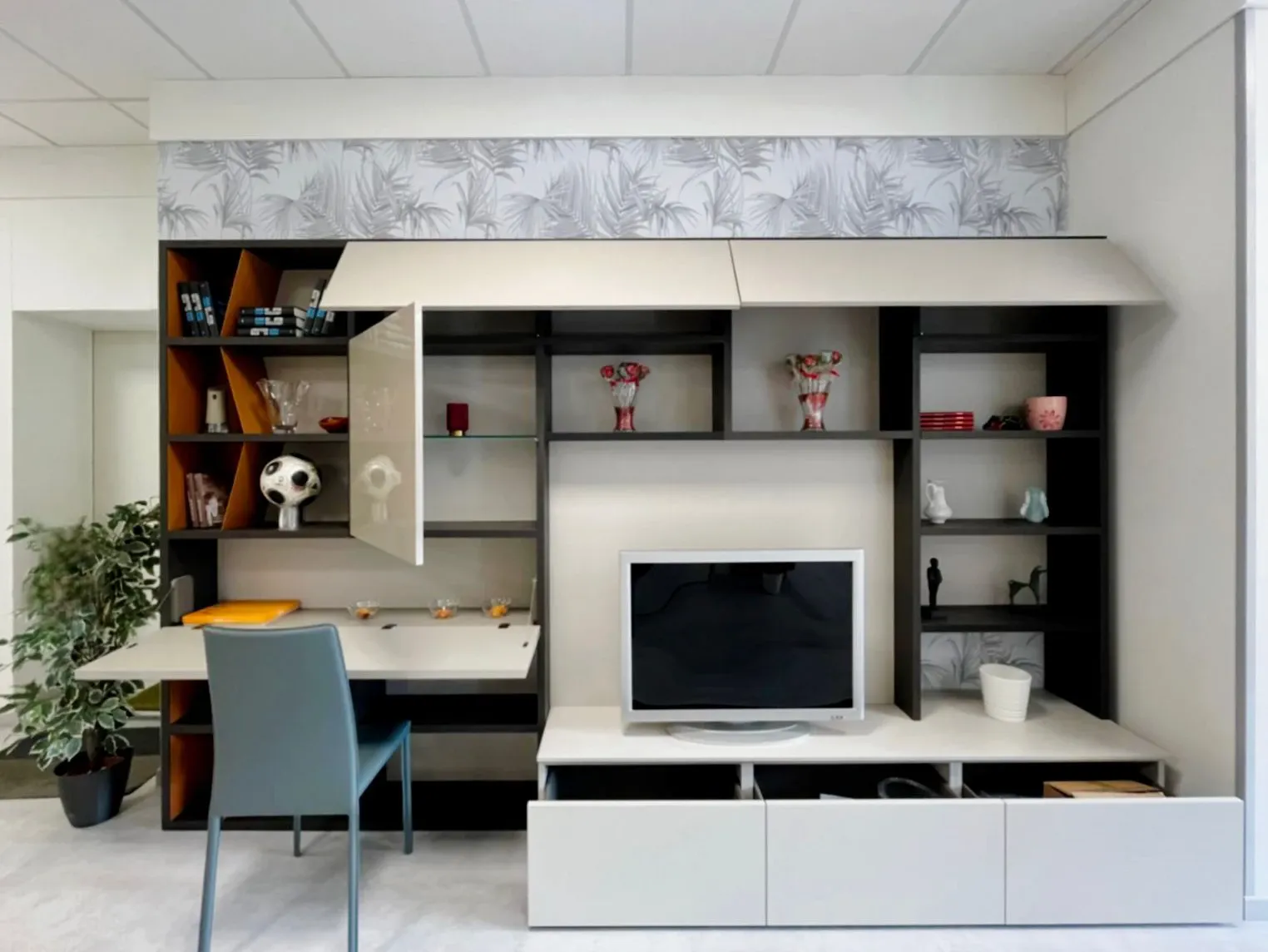 La composizione si distingue per la sua capacità di arredare, contenere ed esporre. Il sistema di apertura di ante battenti, vasistas e cassettoni è push pull, per un estetica pulita ed essenziale.