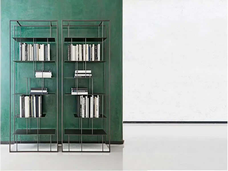 Linee decise e materiali durevoli caratterizzano tutte le librerie Presotto: scopri il modello in metallo qui visibile e completa il soggiorno.