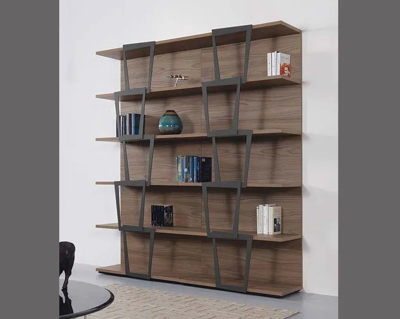 Particolare libreria a parete in appoggio a terra mod. TRAPEZIO con struttura in laminato Ecologico tinta a scelta campionario con ripiani spessore 25 mm e schienale spessore 18 mm. La libreria è caratterizzata da elementi decorativi frontali in acciaio verniciati opaco in finitura sablé in tinta a scelta campionario. Le combinazioni di colori sono le seguenti: struttura bianca + decoro bianco; struttura tortora + decoro tortora; struttura grigio ardesia + decoro grigio ardesia; struttura nero carbone + decoro nero; struttura cemento + decoro nero; struttura noce + decoro nero. La libreria ha le seguenti dimensioni: larghezza 180 cm, altezza 200 cm e profondità 37 cm. TRASPORTO E MONTAGGIO ESCLUSI.