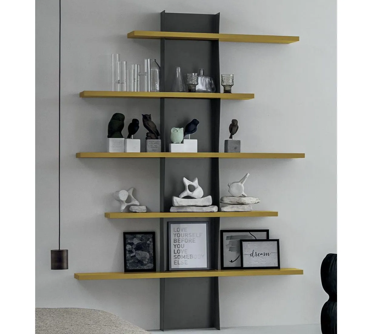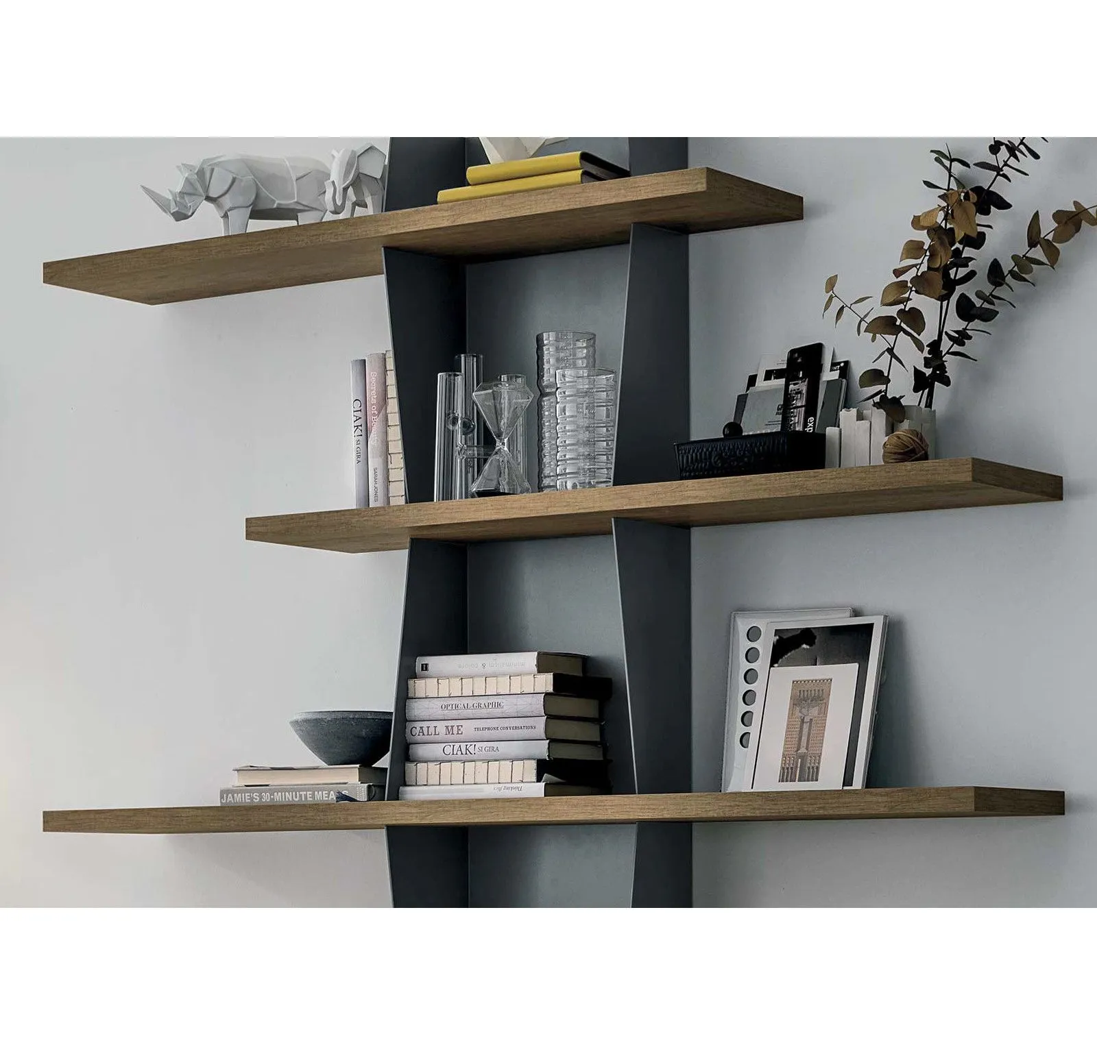 Particolare libreria a parete mod. VERSUS, con struttura in metallo finitura antracite e cinque mensole (tre lunghezza 108 cm e due 144 cm) in finitura laccata opaco o in finitura materica tinta a scelta campionario. Le mensole sono di spessore 3 cm. Dimensione totale: L 144 x h 210 x P 27 cm. TRASPORTO E MONTAGGIO ESCLUSO.