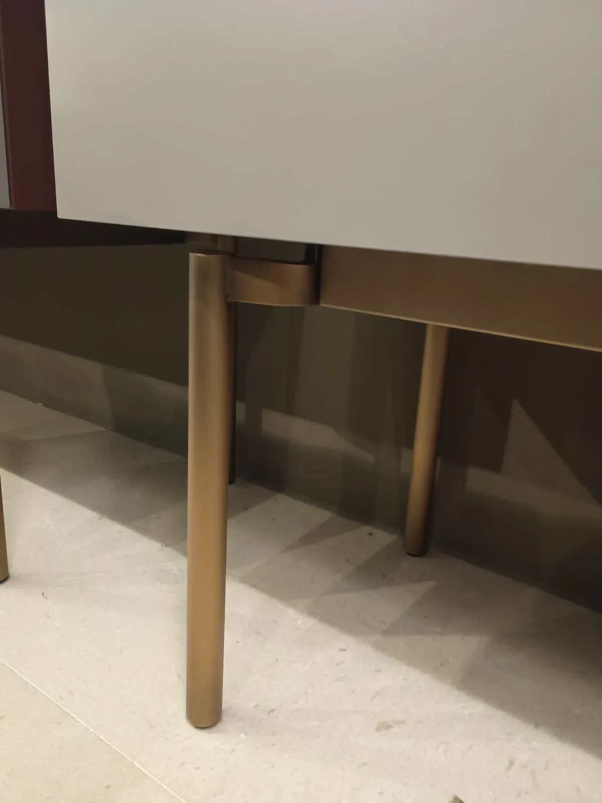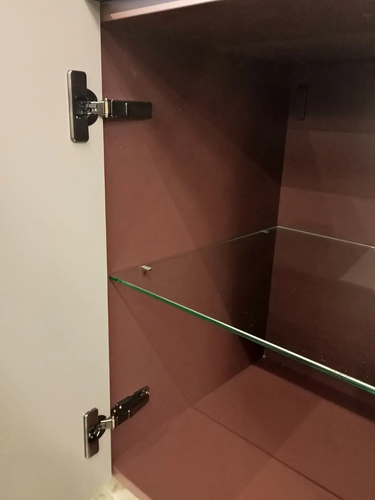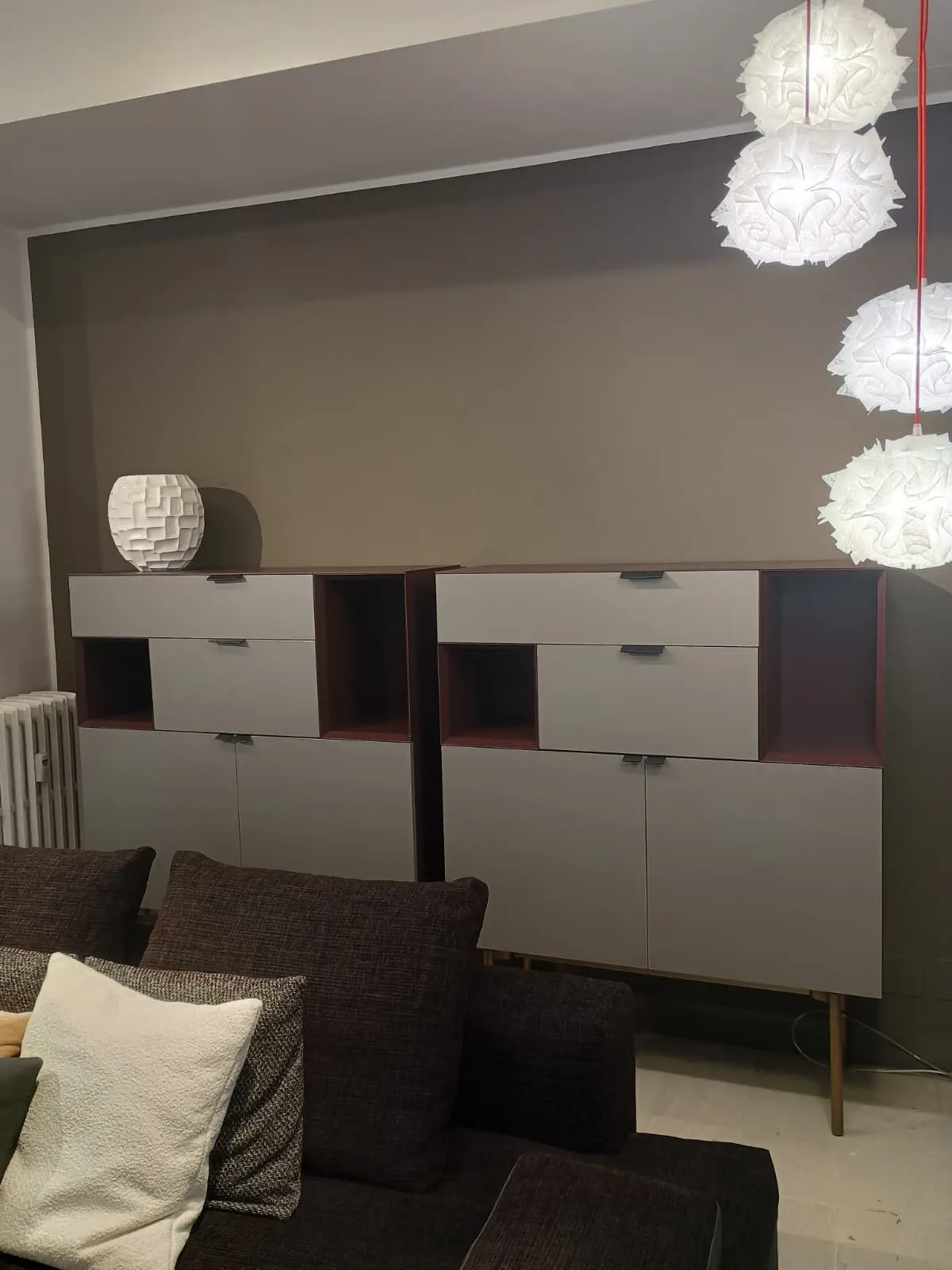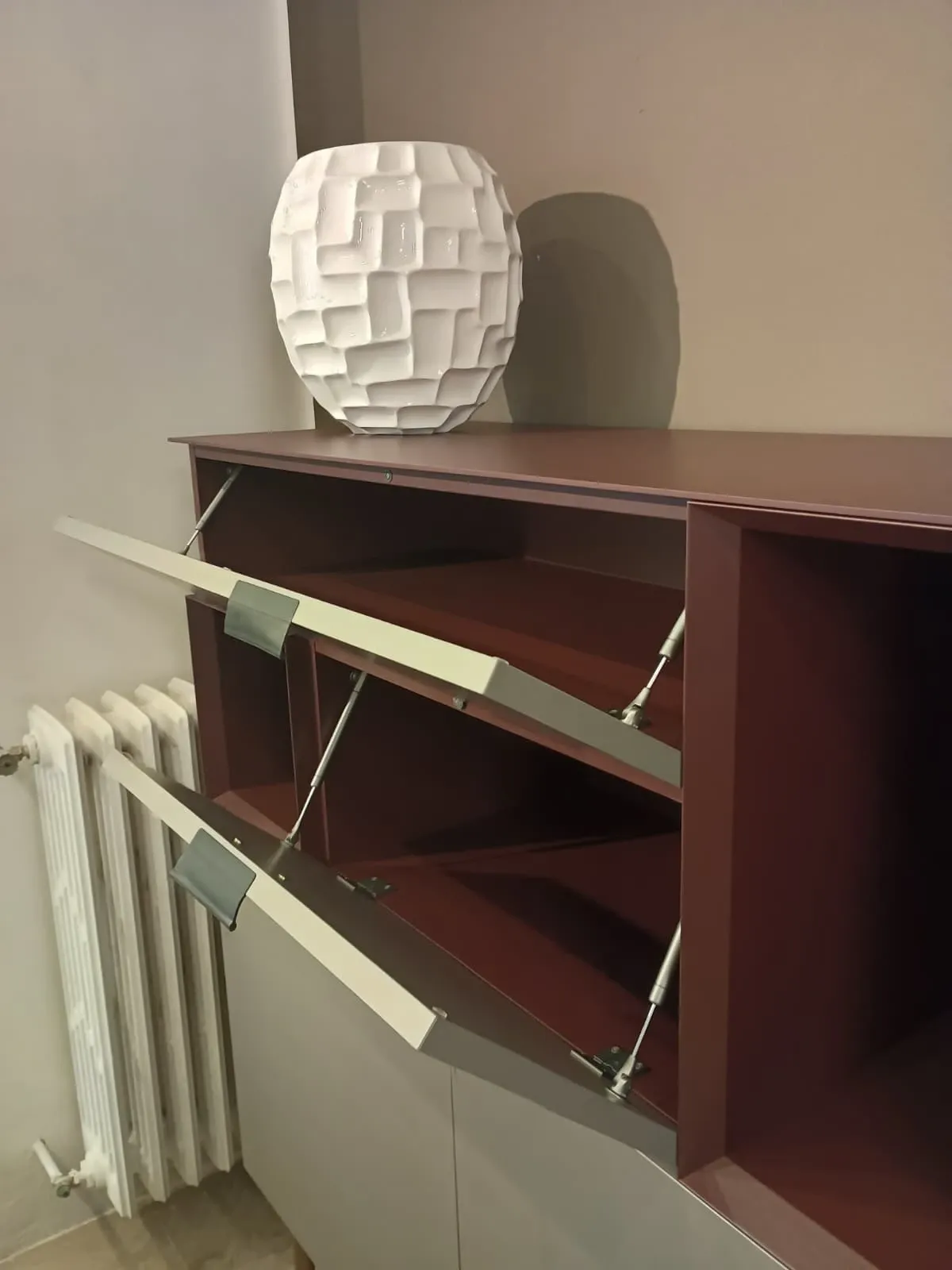 Finitura vani a giorno laccato opaco Malva, struttura materico cenere, base rialzata di pregio con piedini in metallo bronzo opaco.