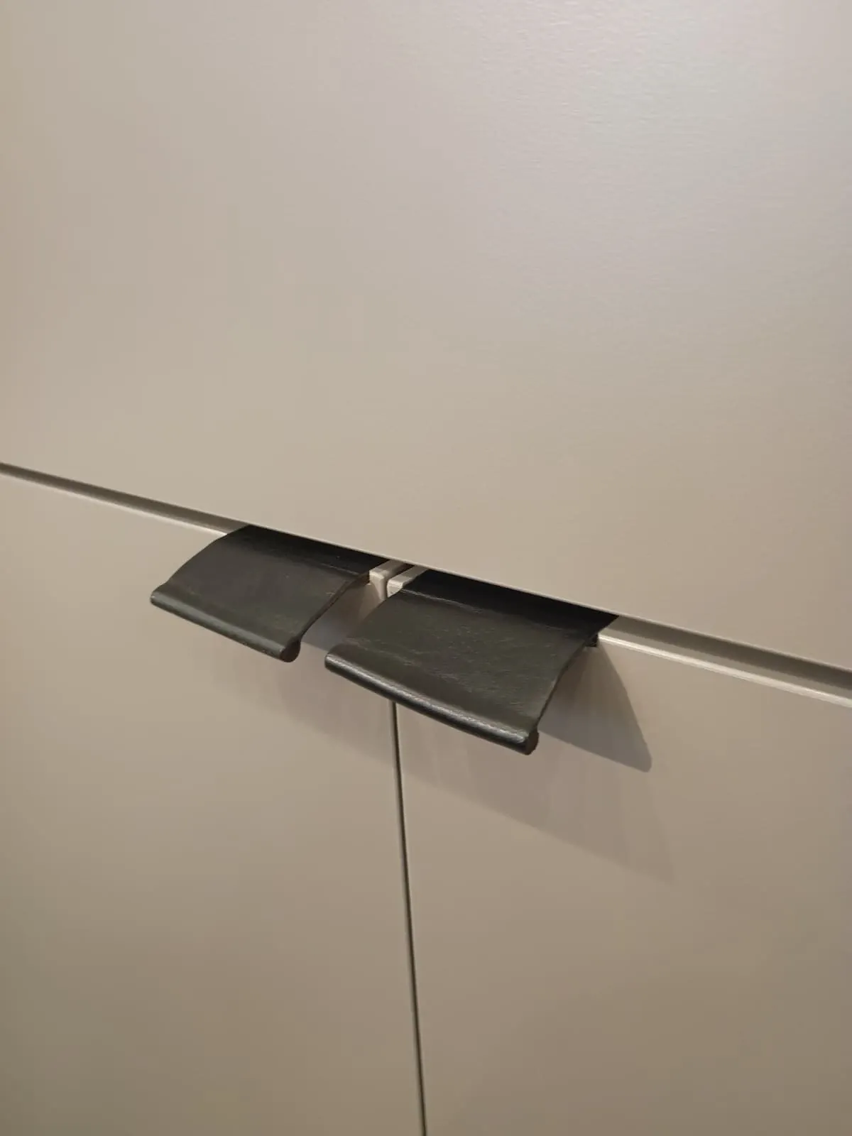 Ante battenti e a ribalta con maniglia in cuoio nero, ripiani interni in vetro.