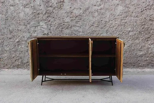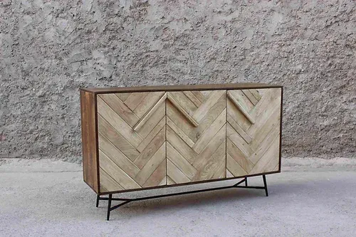 Credenza Rennes Natural 3A , ha la struttura in legno massello. E composta da 3 ante con mensola interna. Questa madia ha uno stile industriale ed è molto particolare grazie alle sue ante bicolore a spina di pesce.