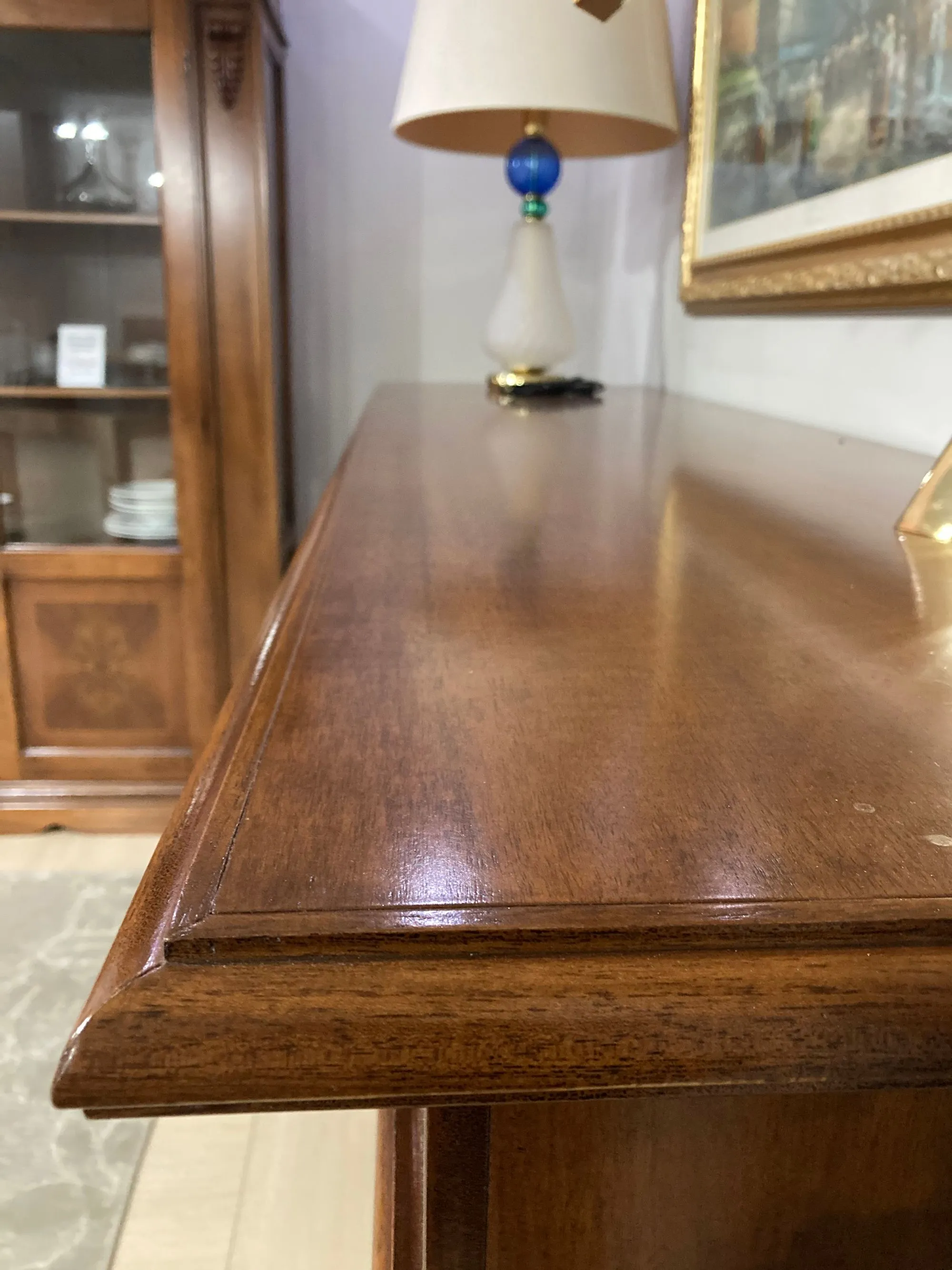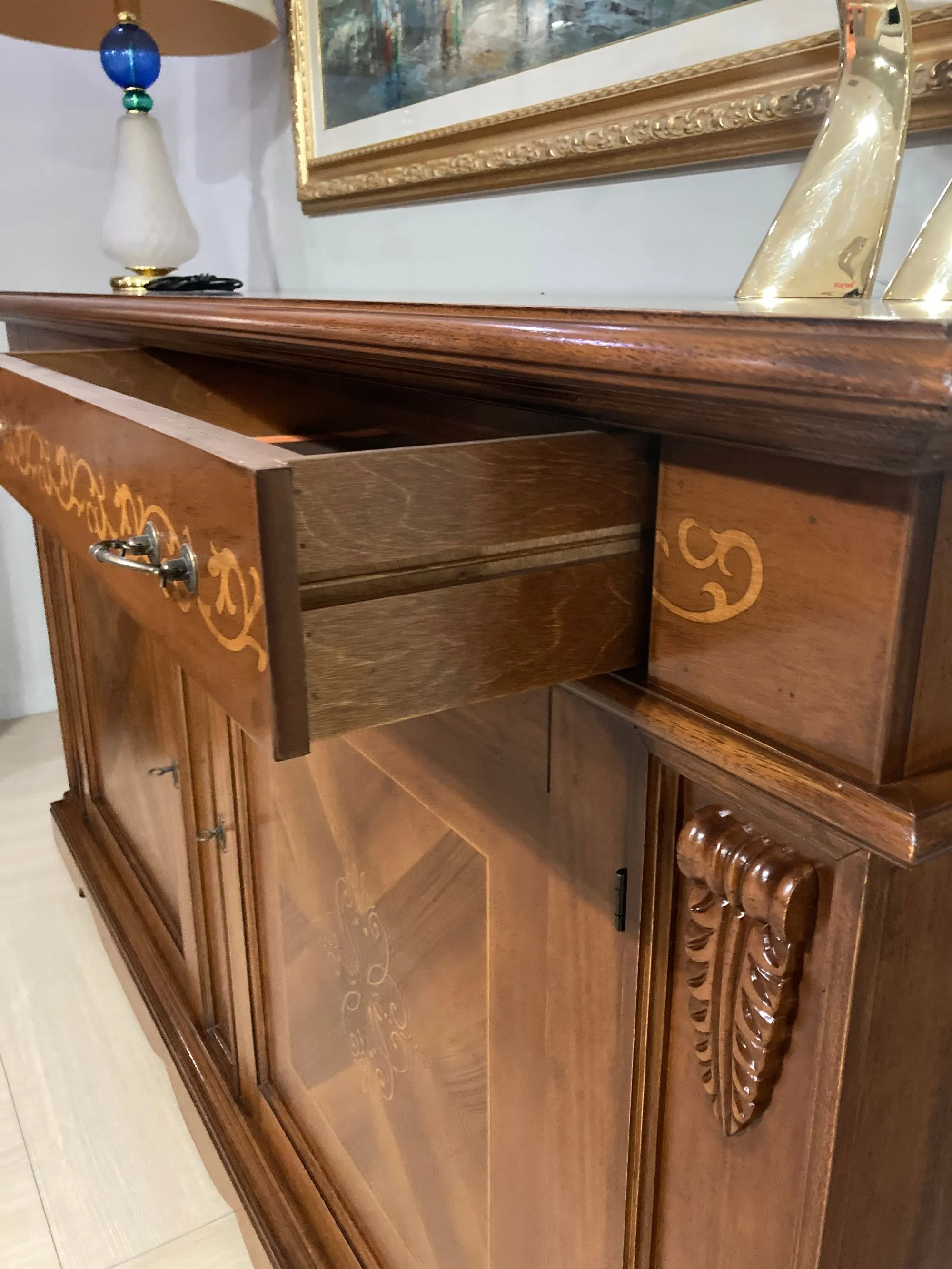 Elegante credenza finitura Bassano, in noce. Perfetta per un arredo dal gusto classico e stupenda (perchè no) inserita in un contesto moderno, come complemento di valore e intramontabile. Con finiture importanti e particolari che la caratterizzano (vedi foto) MISURE: L220 P60 H115