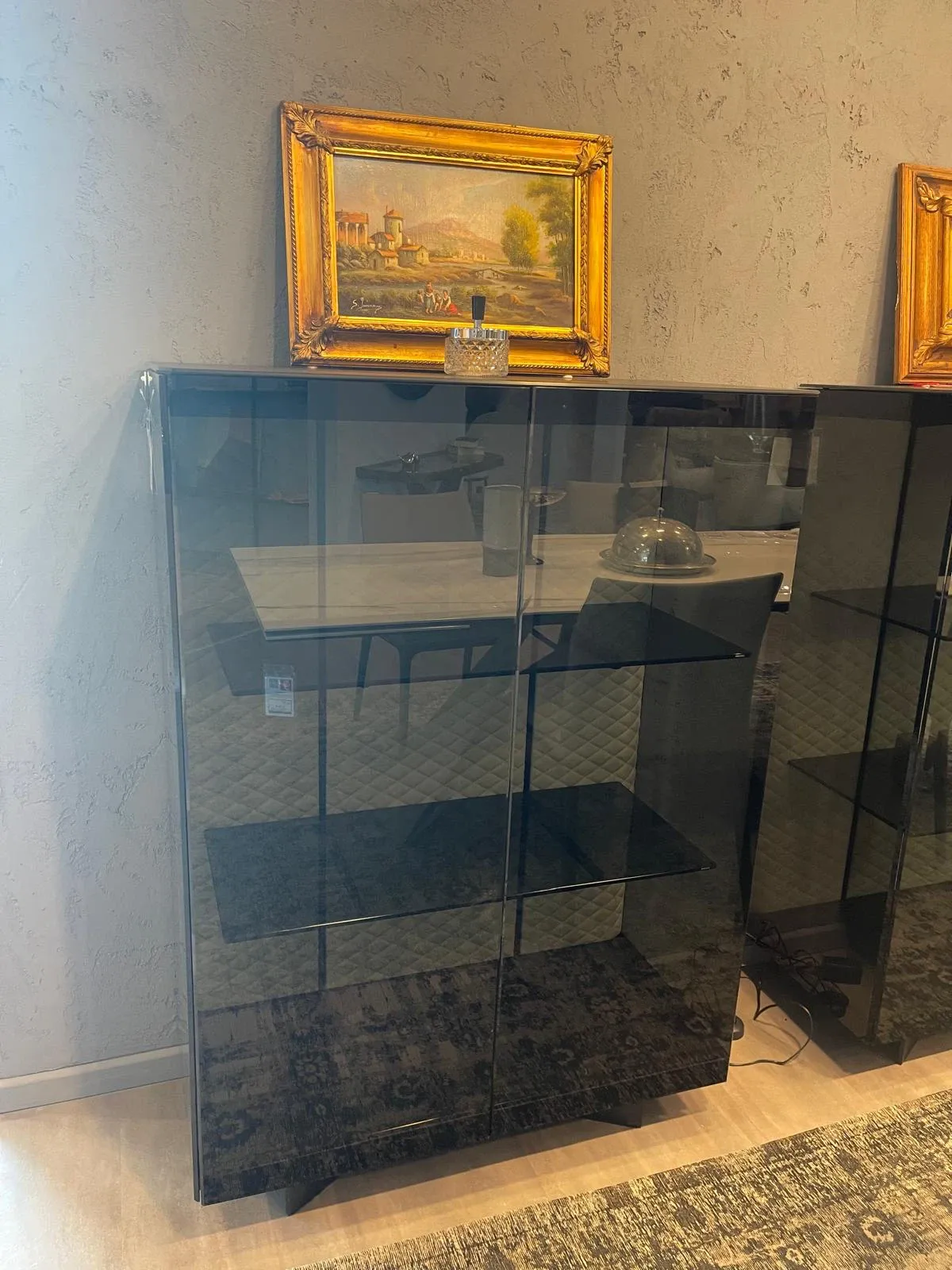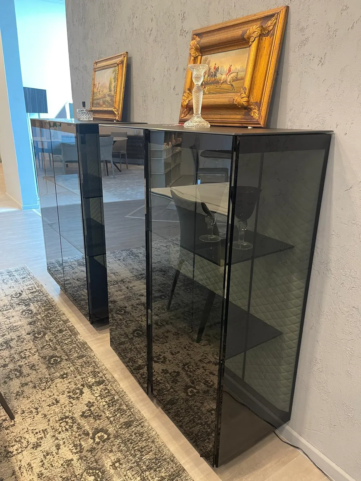 La credenza Boutique Alta è un oggetto di design che unisce funzionalità e atmosfera. La struttura in metallo goffrato nero regala un carattere deciso, mentre le ante in cristallo fumé offrono un gioco di trasparenze sofisticato. Lo schienale in ecopelle lino con LED integrati crea una luce calda e avvolgente, trasformando la credenza in un elemento d arredo luminoso e raffinato.