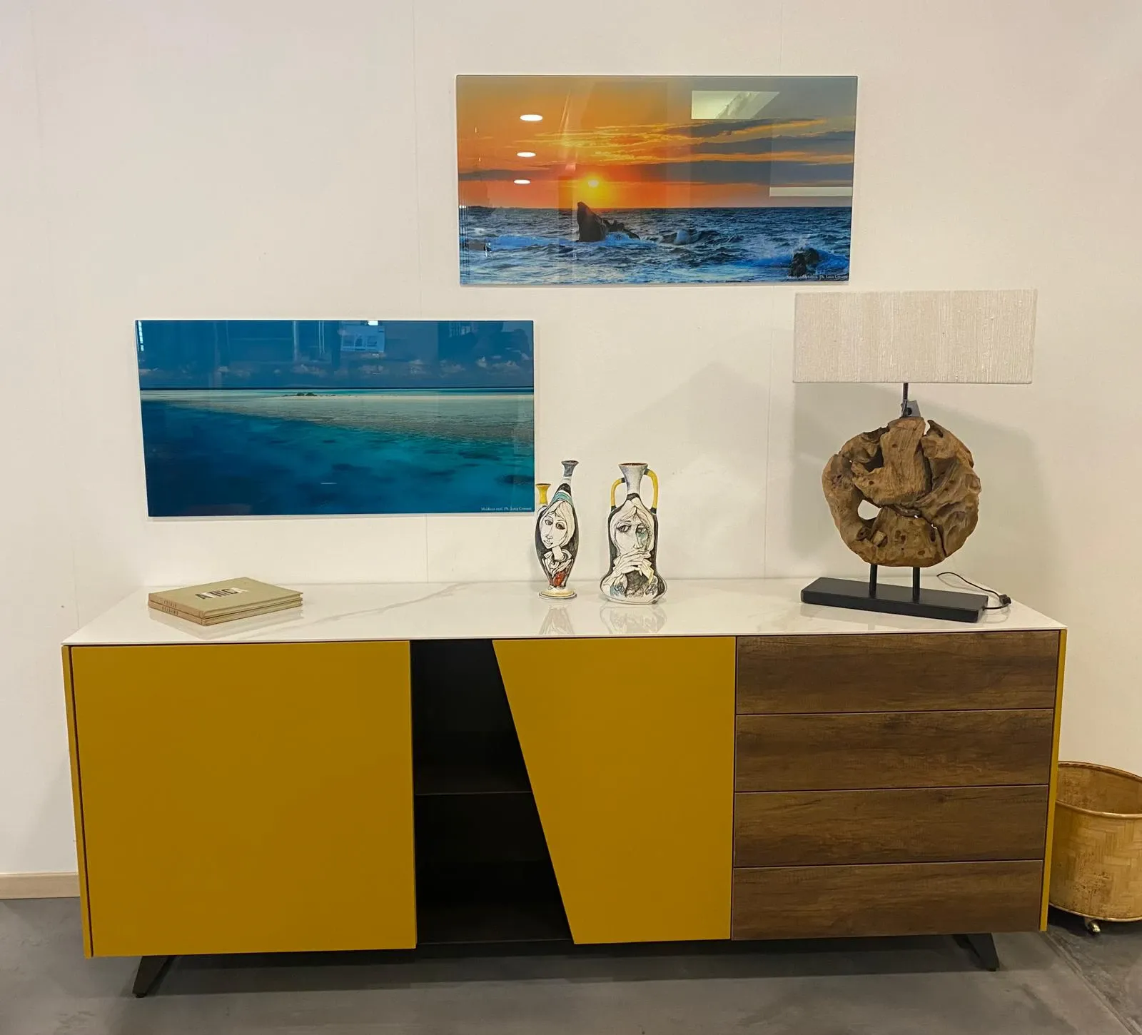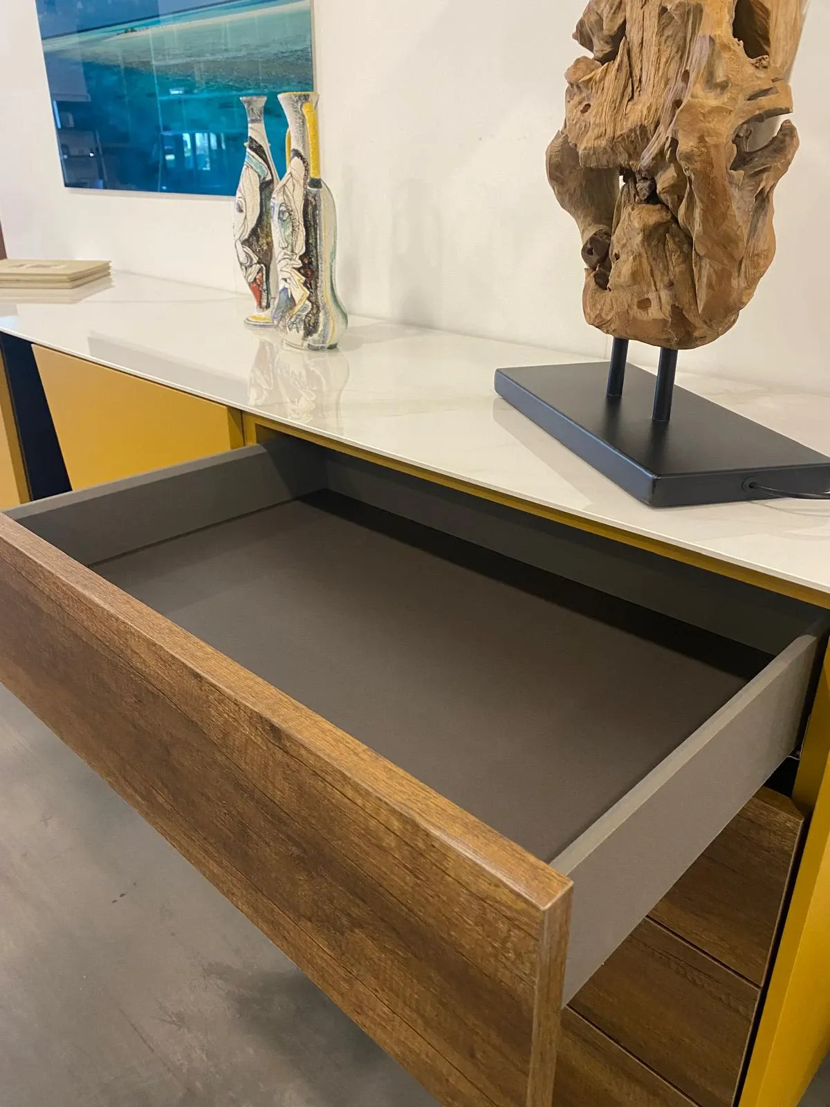 Struttura e ante laccato opaco curcuma; piano gres premium caracatta oro; vano a giorno metallo finitura antracite; cassetti materico nodato scuro; piedini metallo antracite.
