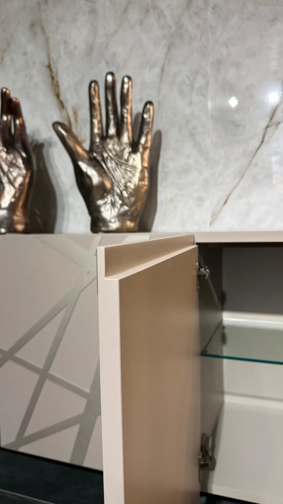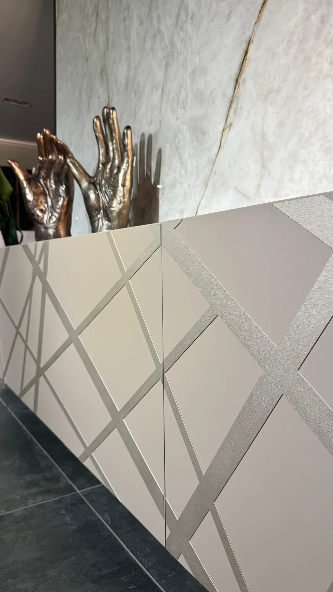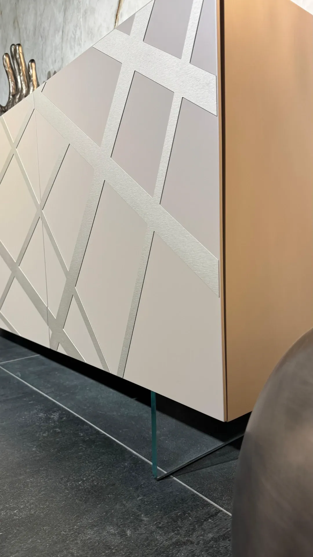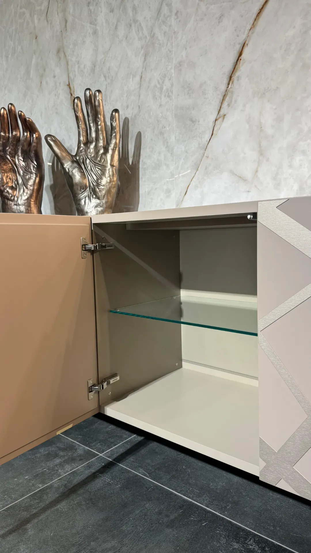 Madia 2 ante complanari l.240 h.75 (55+20) p.50,5 laccato opaco camoscio, ante quercia carbone con inserto titanio graffiato parziale.