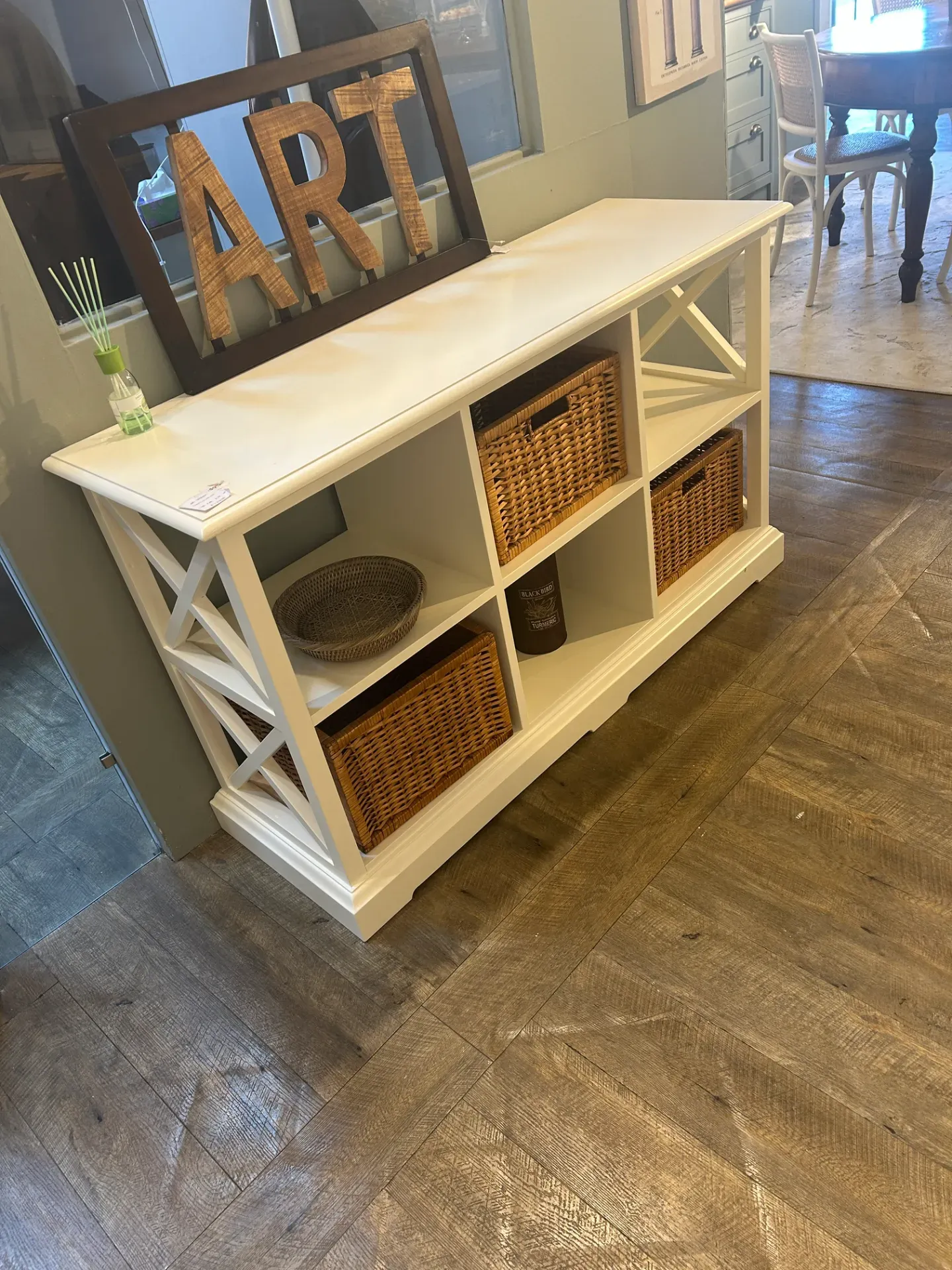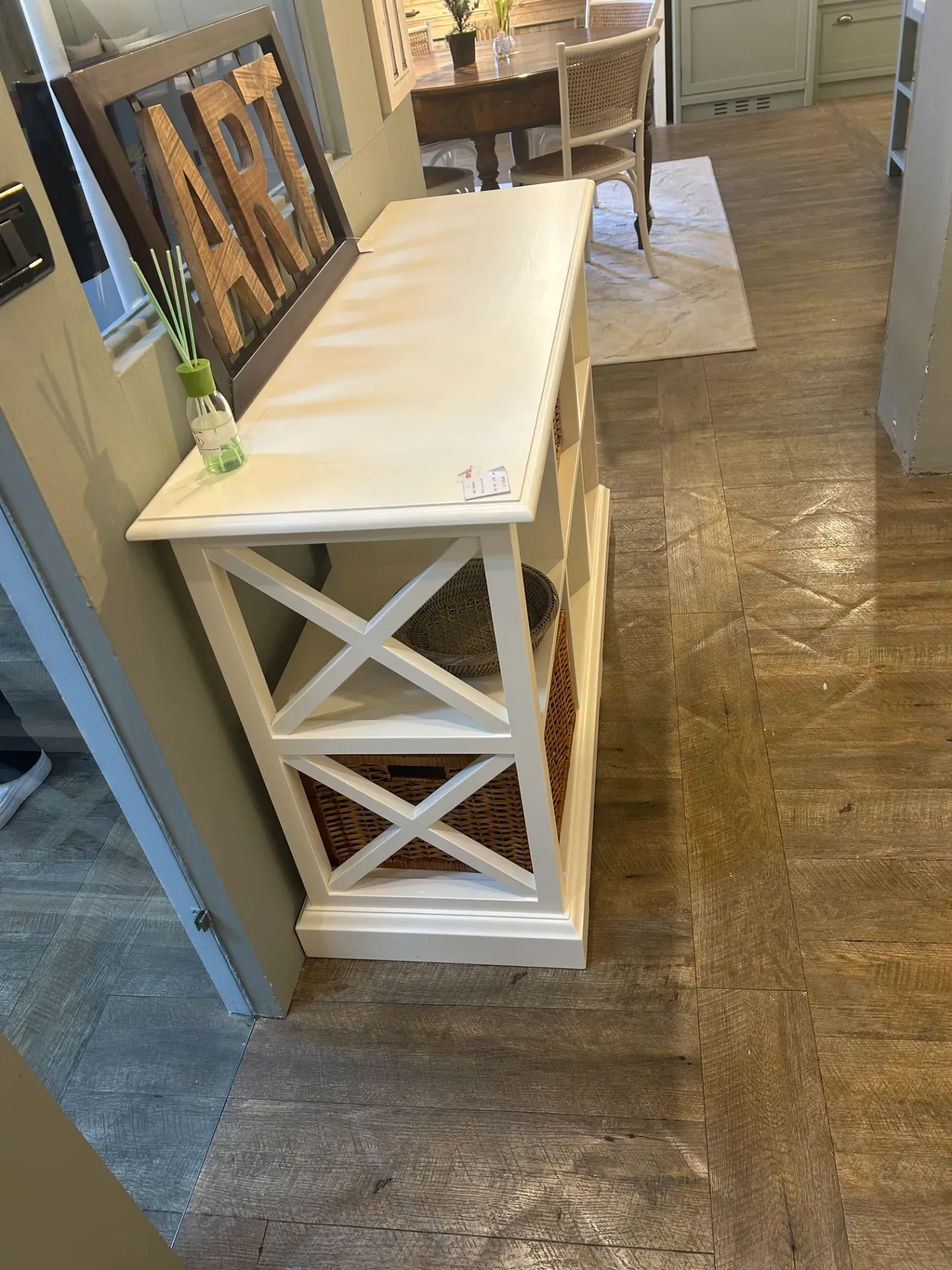 Credenza console laccata , si presta per vari ambienti dalla cucina , ingresso, bagno , camera letto ed è completa di cesti come da foto . Dimensioni L.135 p 45 h 79
