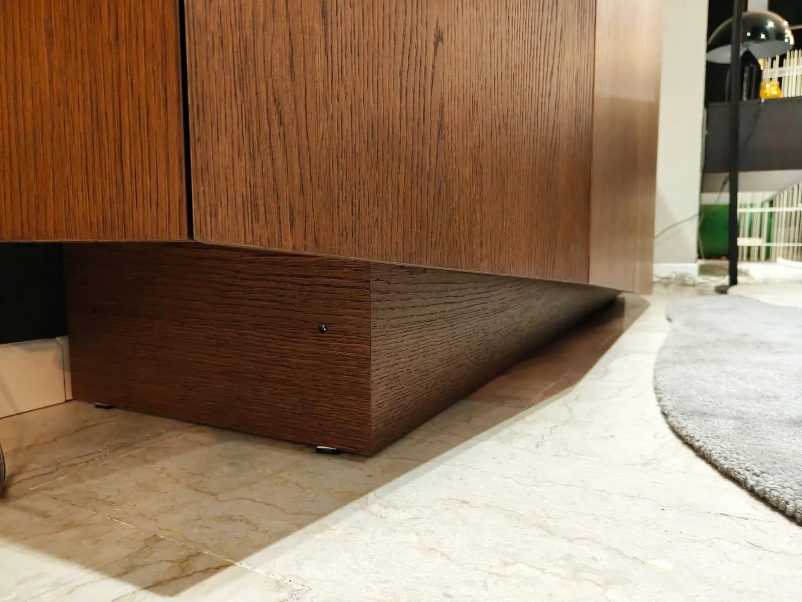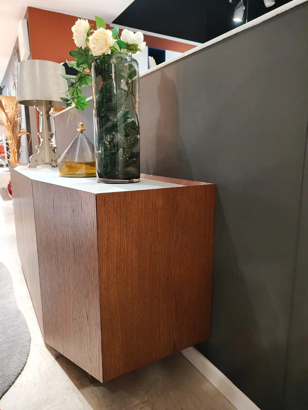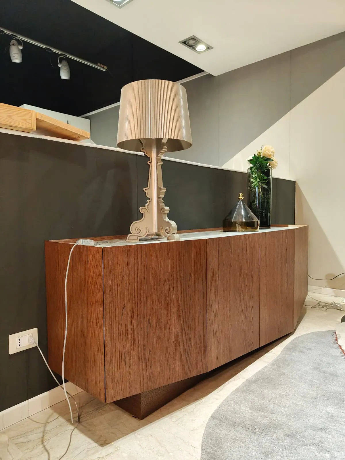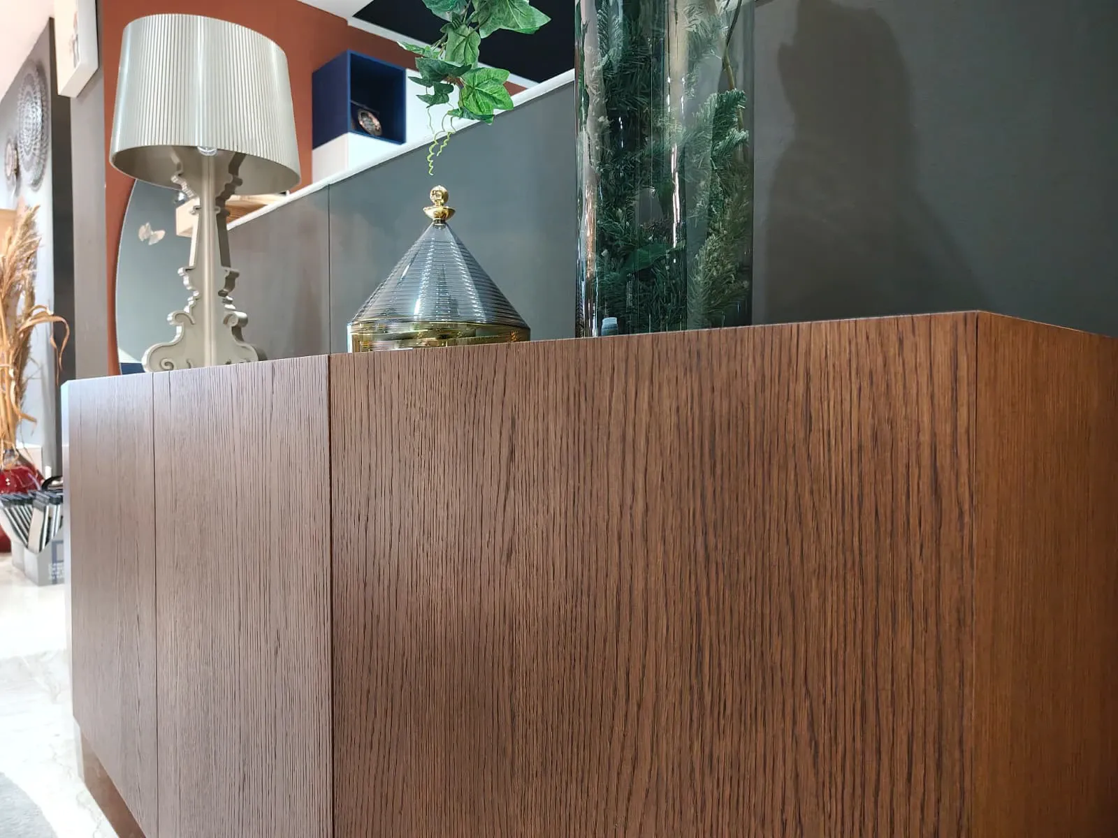 Il suo design gioca sapientemente sulla continuità delle venature del legno, che avvolgono il mobile creando un effetto visivo armonioso e naturale.