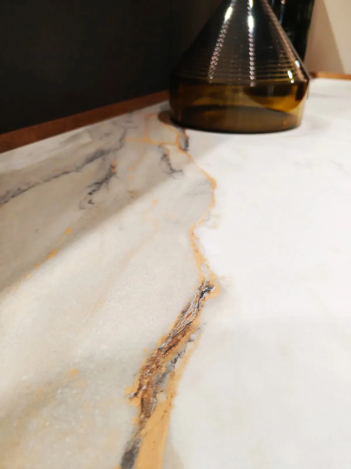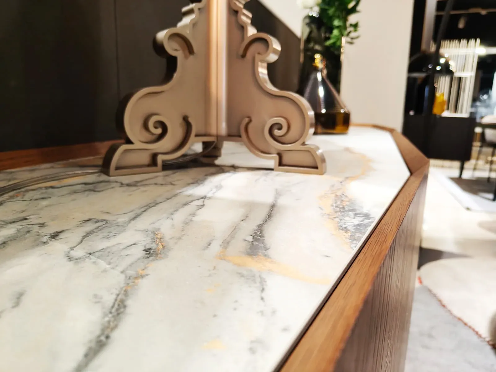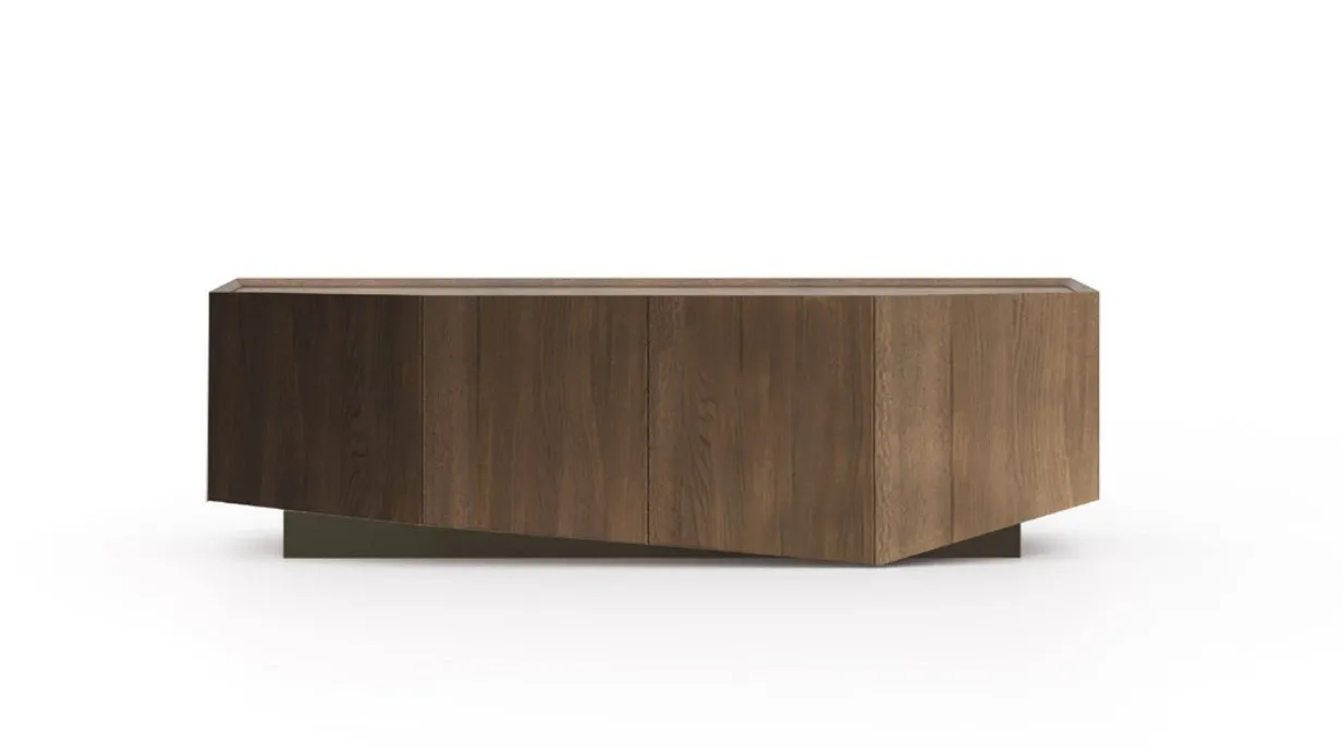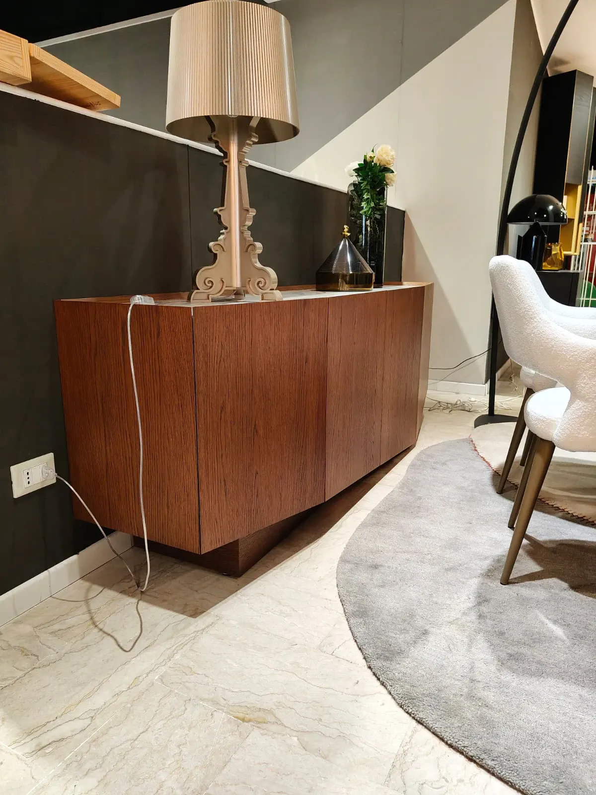 Il suo design gioca sapientemente sulla continuità delle venature del legno, che avvolgono il mobile creando un effetto visivo armonioso e naturale.
