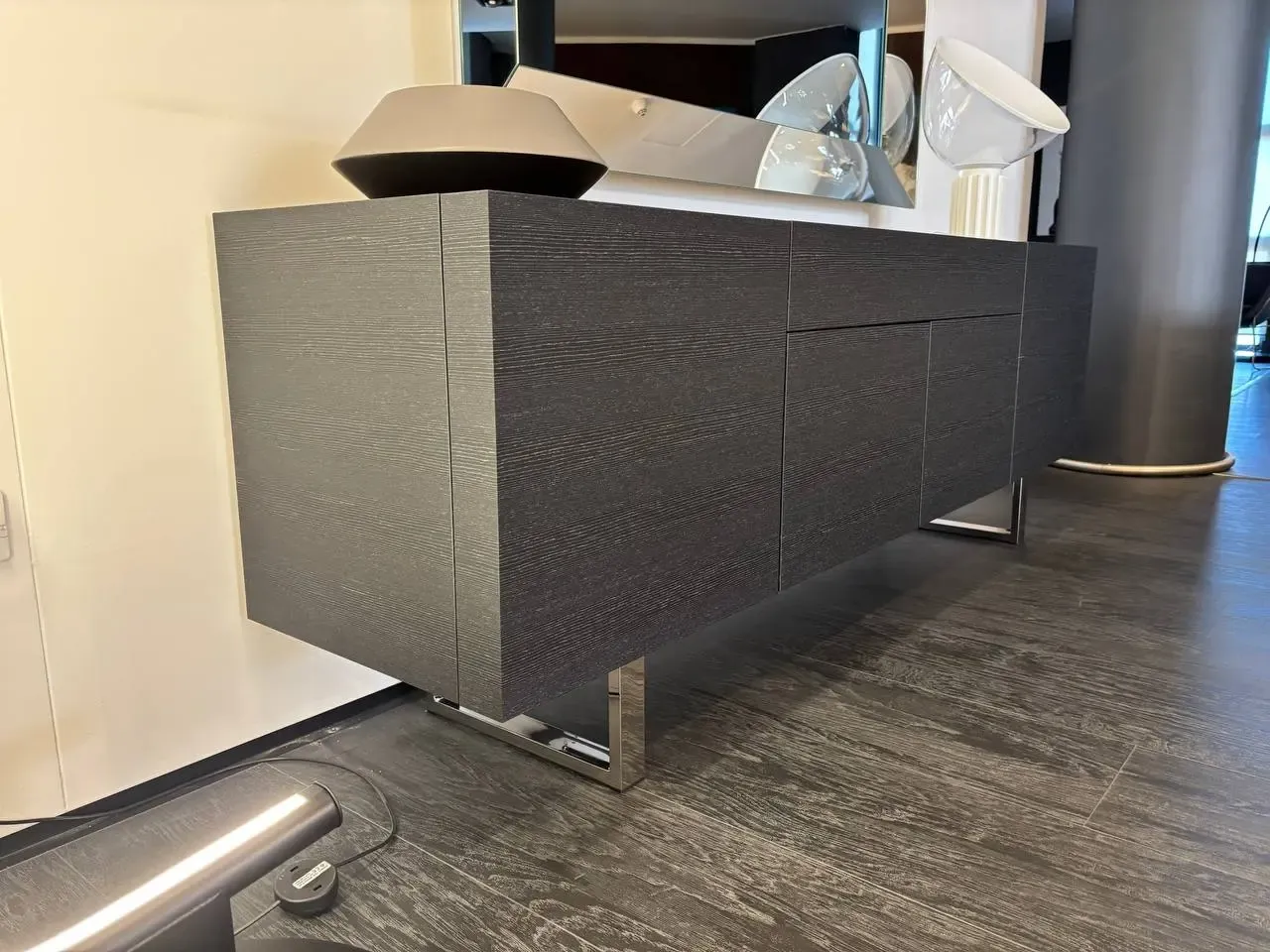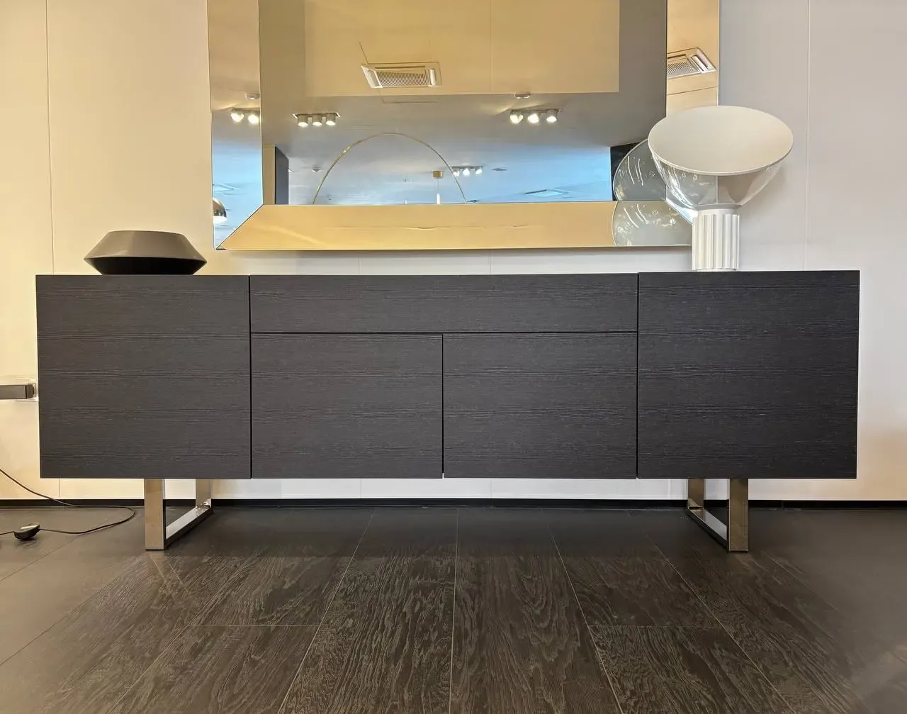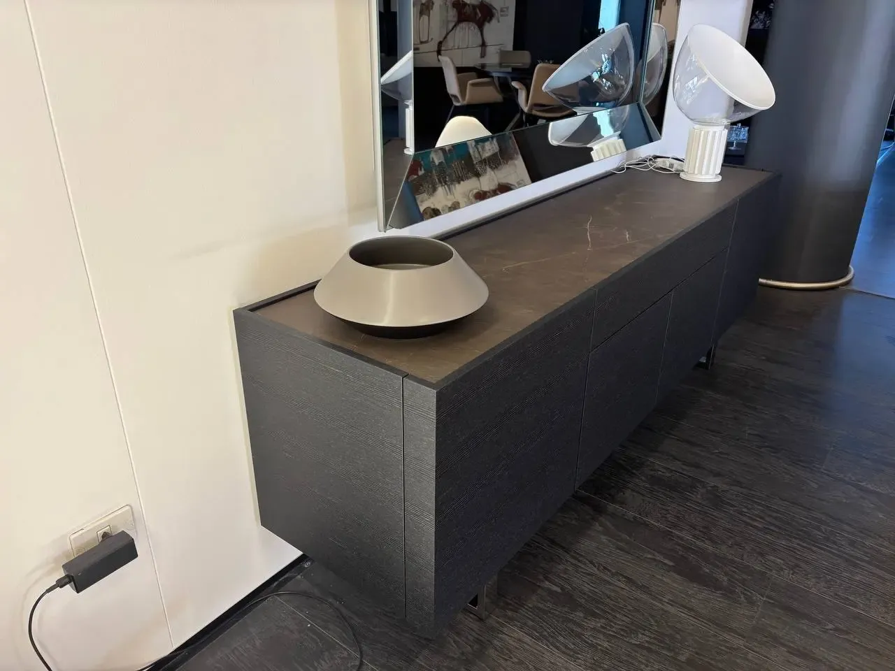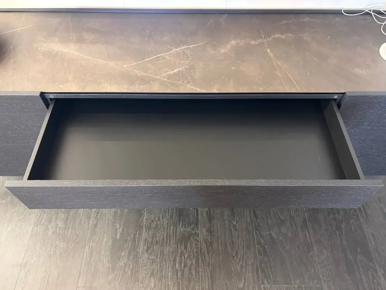 Struttura in impiallacciato grafite; top in ceramica bronze.
