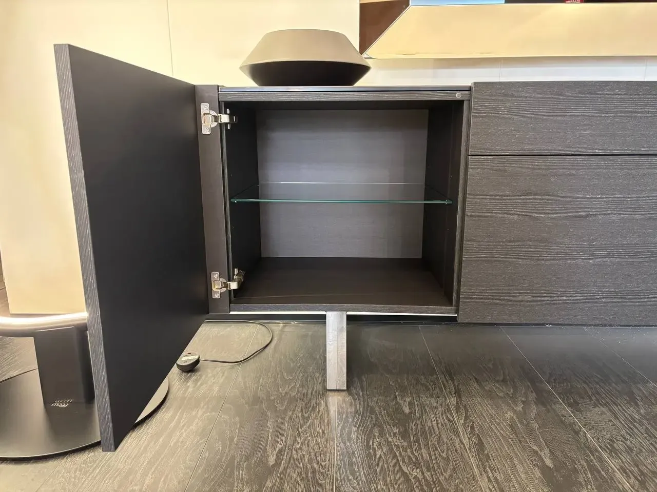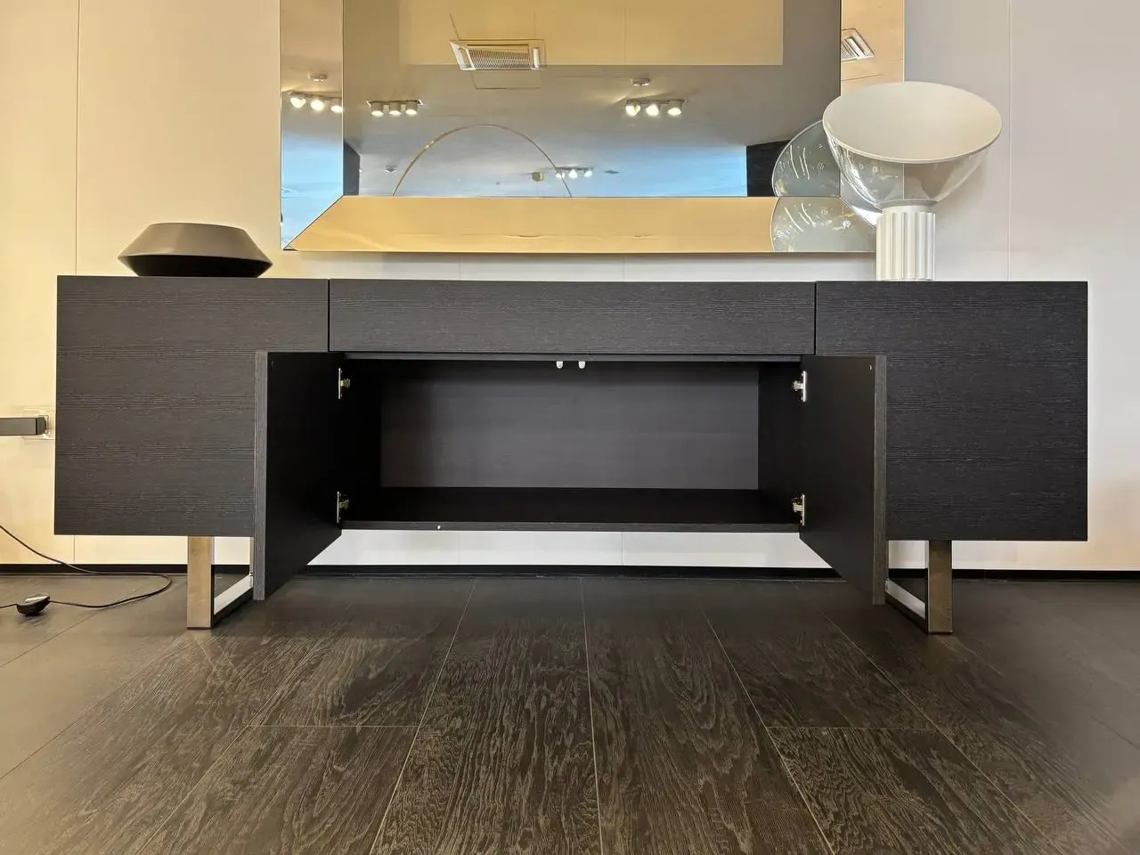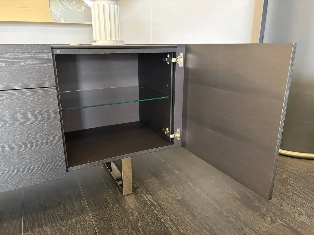La madia ha 2 ante laterali in folding e 2 ante centrali senza maniglia con sistema di apertura a spinta (push-pull) e un cassetto centrale superiore dotato di sistema di chiusura assistita. Comprende un ripiano in vetro temperato trasparente per ogni vano laterale.