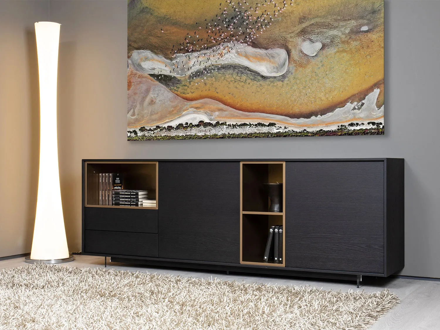 credenza moderna con vani a giorno, ante battenti e cassetti