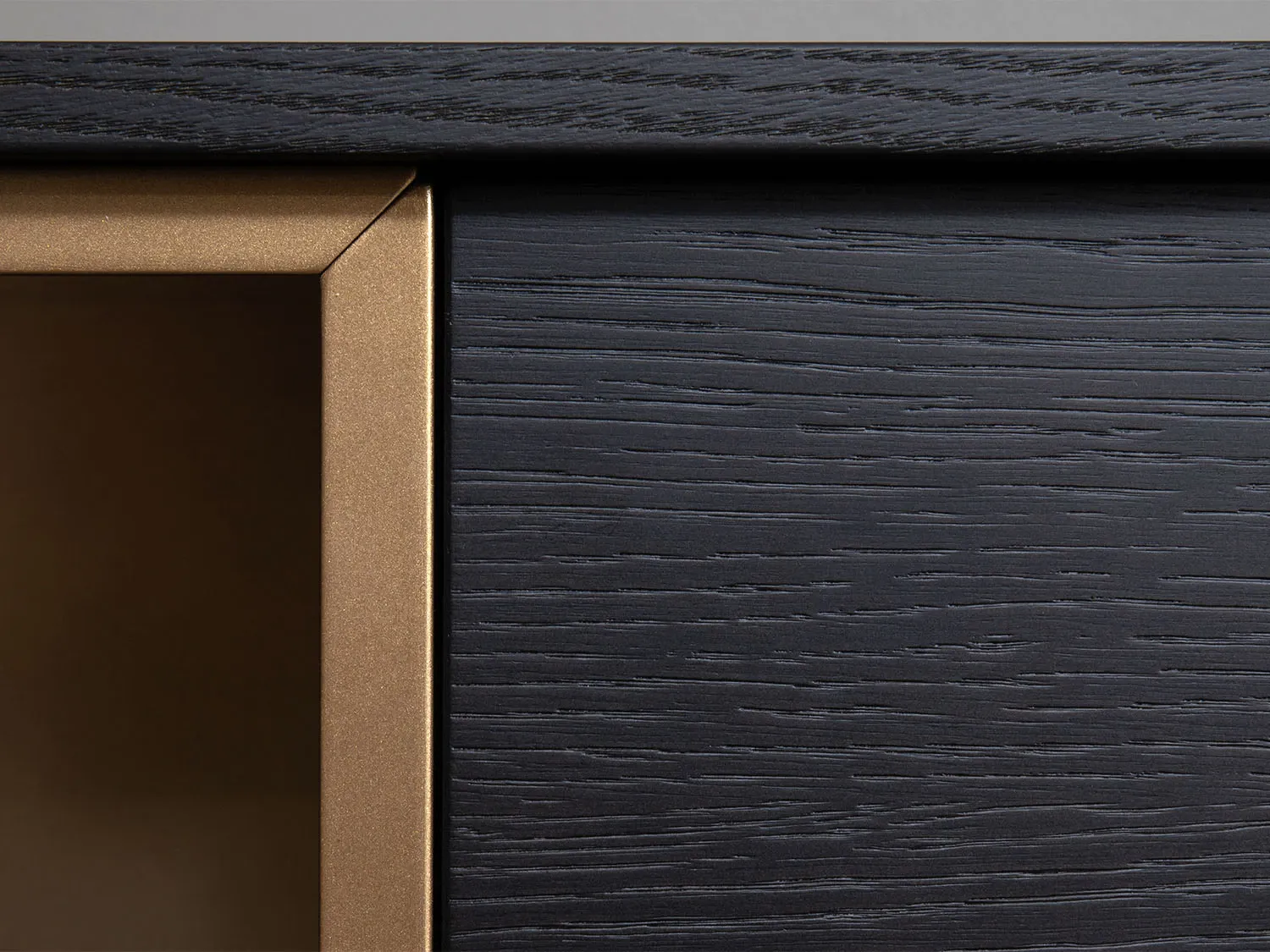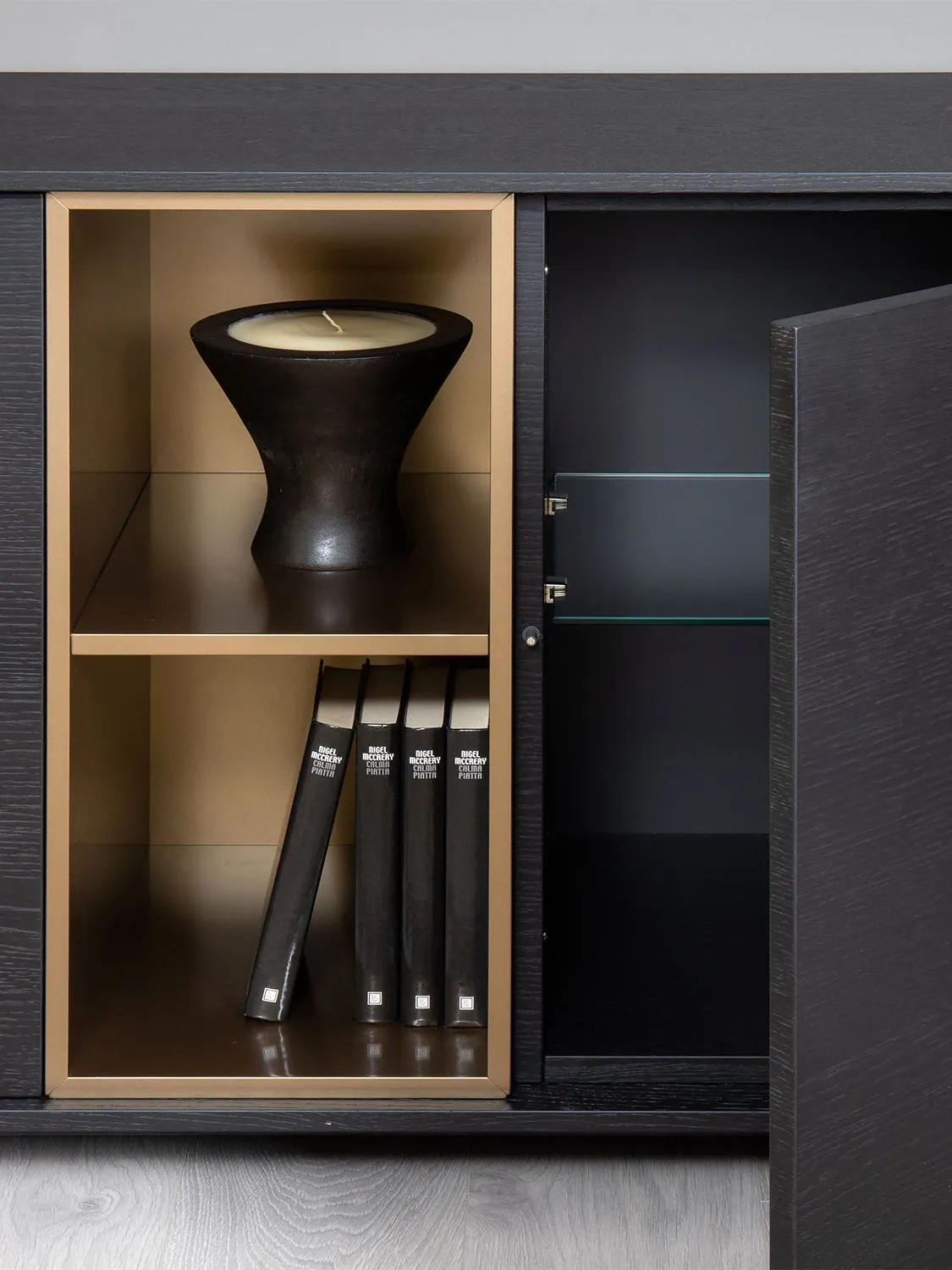 Realizzata in legno con finitura rovere carbone, è impreziosita da vani a giorno in laccato metallizzato color bronzo, che creano un raffinato contrasto di materiali e tonalità. La struttura offre un'eccellente capacità contenitiva: le ante battenti e i cassetti permettono di organizzare facilmente oggetti di uso quotidiano, stoviglie e accessori, mentre i vani aperti sono ideali per valorizzare libri o elementi decorativi.
